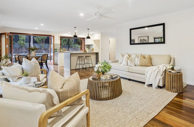 Highlighted by a neutral palette showcasing light-filled spaces and underpinned by hardwood flooring, open plan living and dining introduces the residence and seamlessly connects with an expansive alfresco entertaining area.