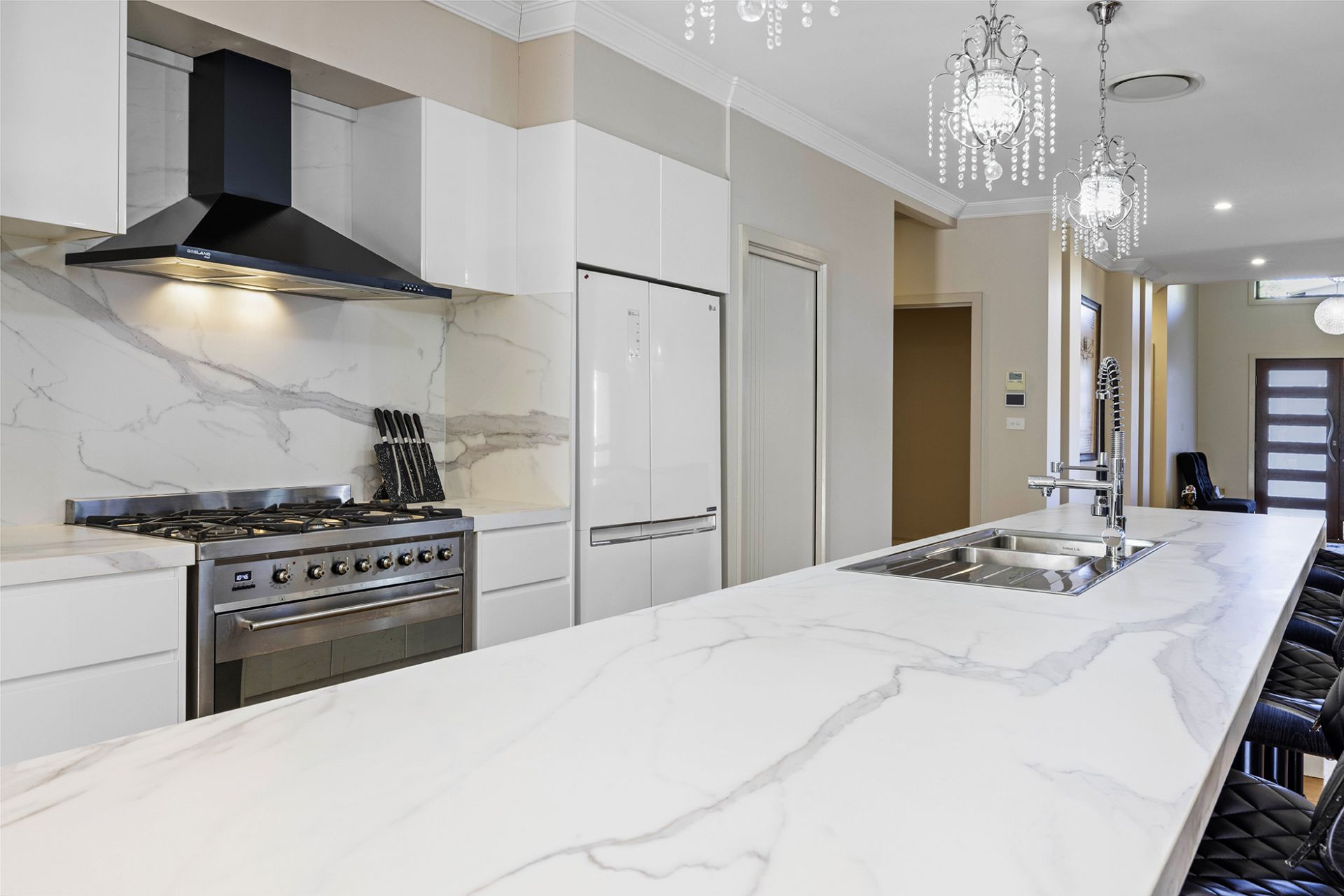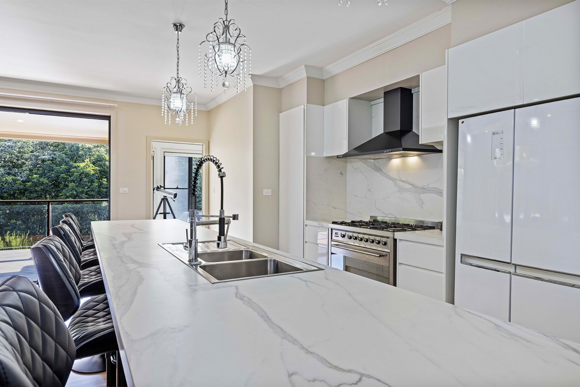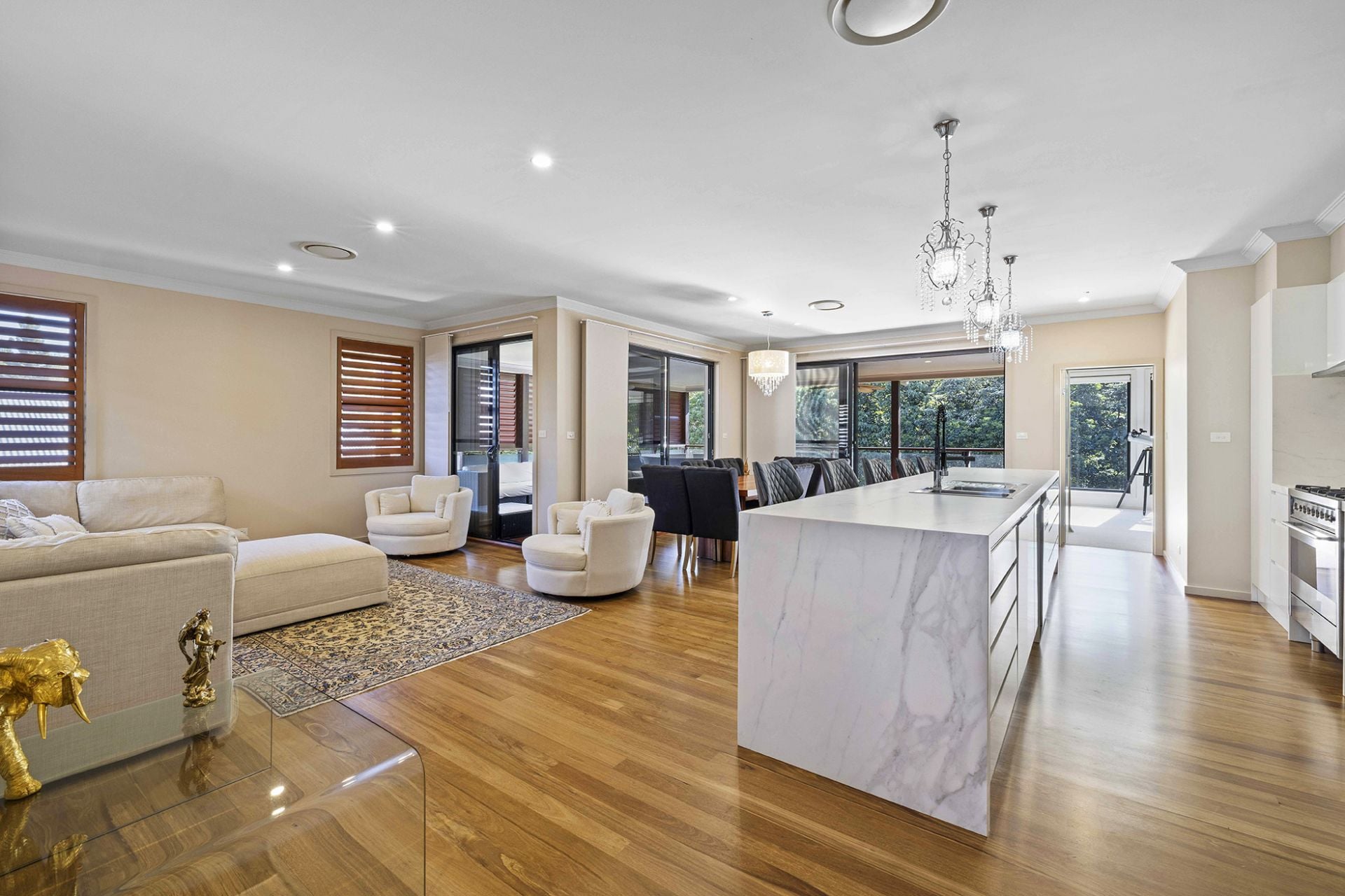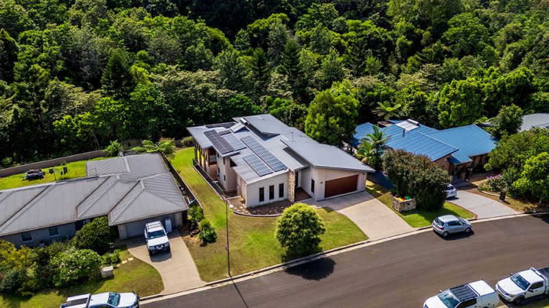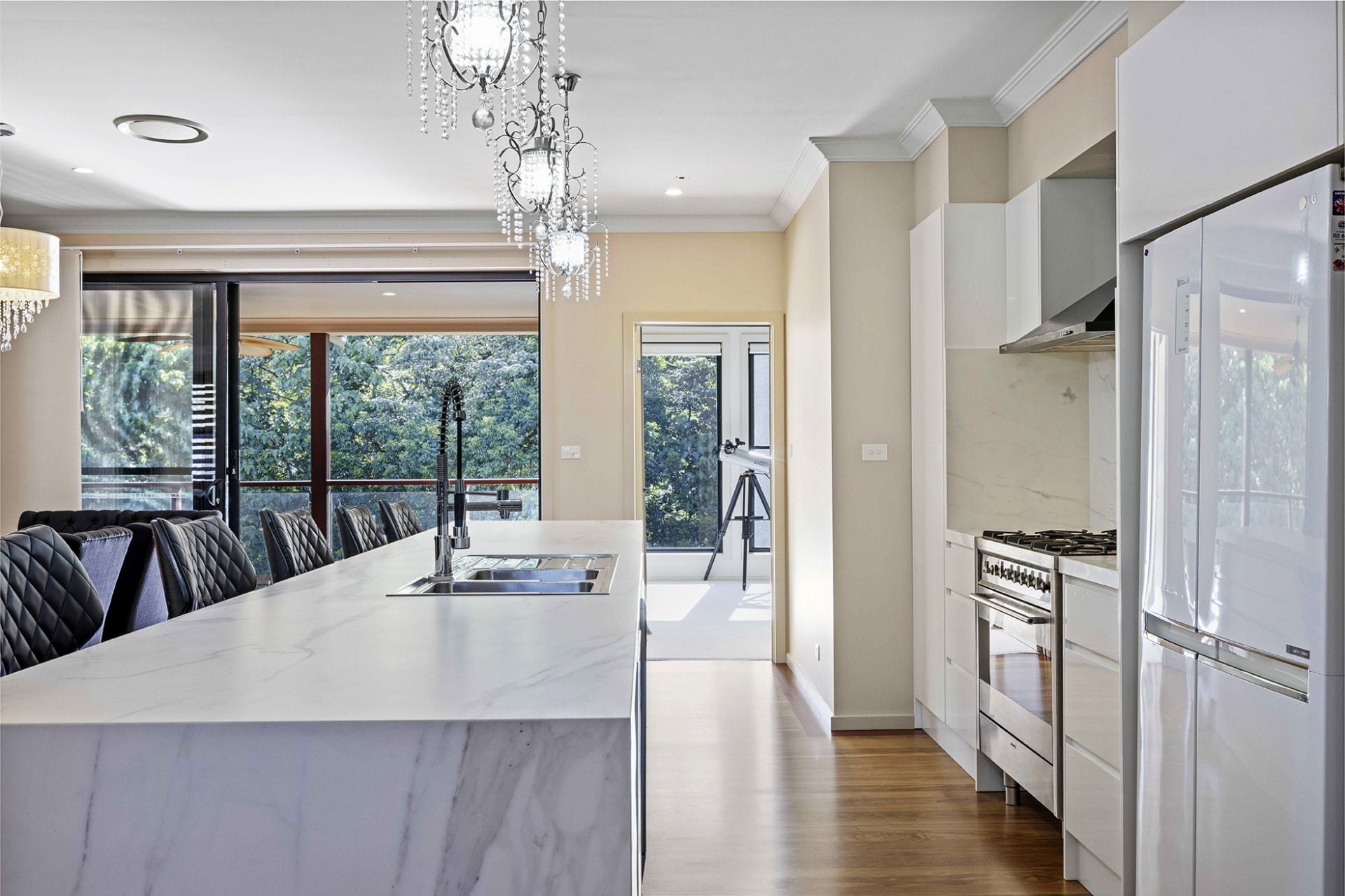To the left one enters a very large study with separate entrance, perfect for the work-from-home type. The kitchen and living spaces are open and regal, with a 4.4m Neolith stone bench featuring waterfall sides at both ends, under bench power points and butler's pantry all make cooking and entertaining seamless. The large alfresco deck in top-notch condition with louvred aluminium panes is private and overlooks the gorgeous reserve where the tranquil sounds of running water can be heard to varying volumes depending on rainfall.