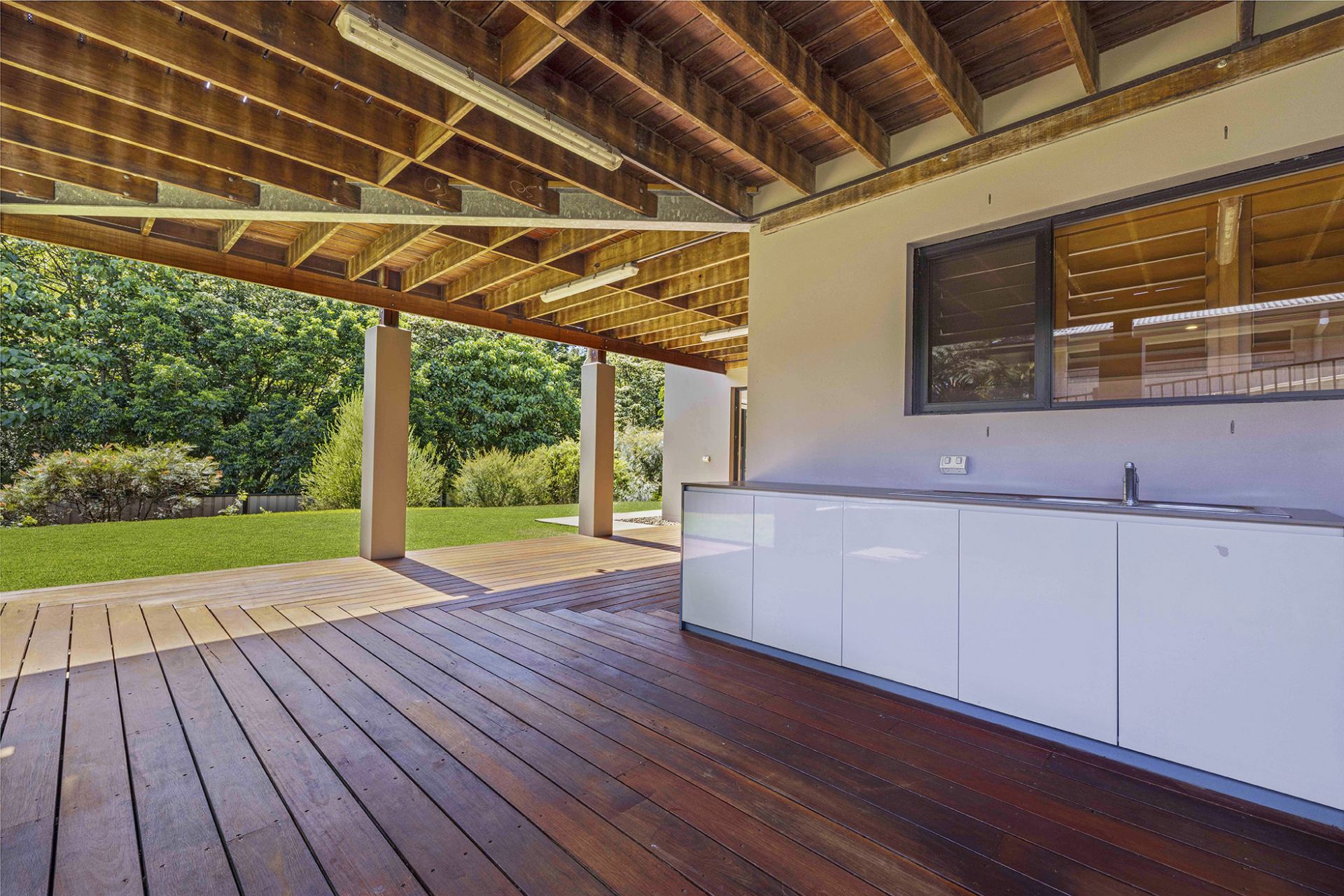 Inside the welcoming front doors, the increased ceiling height to 2.7m makes it immediately spacious, look down and your eyes get to feast upon the hardwood flooring where a thick red mahogany boarder executively trims the white mahogany timber floors.