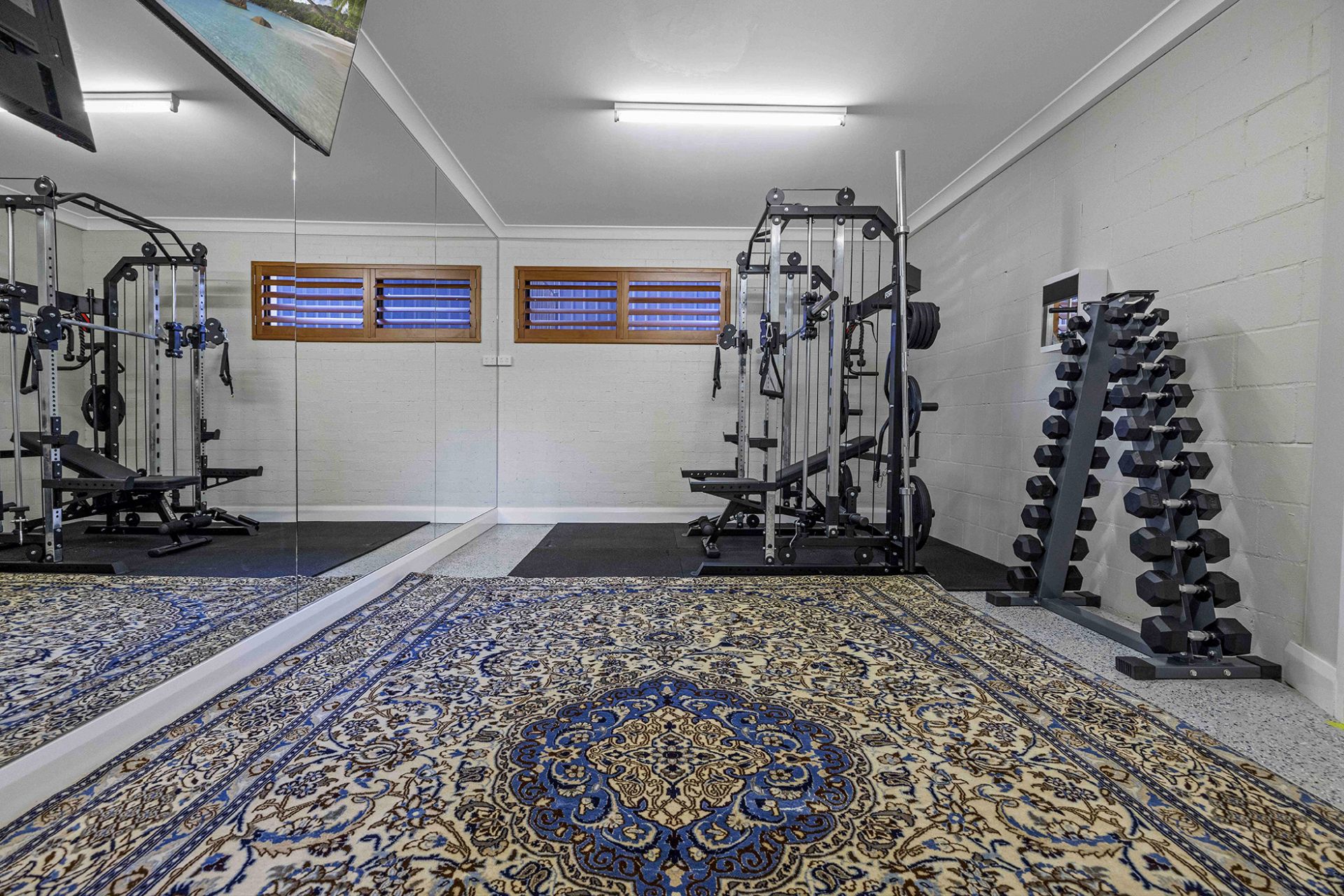 • Gym with floor-to-ceiling mirror, TV anchored to ceiling