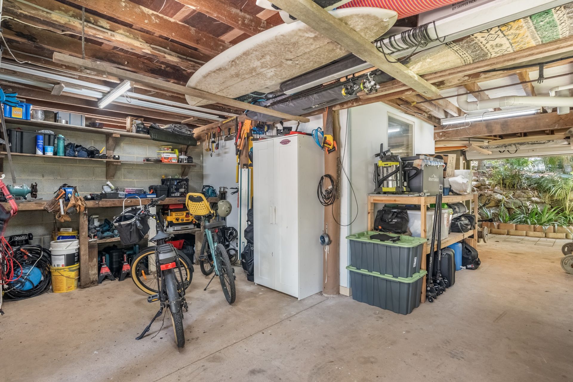On the ground level there is a huge space with a garage, storeroom, workshop area and a toilet. On the outside their is a large lawn with an outdoor shower.