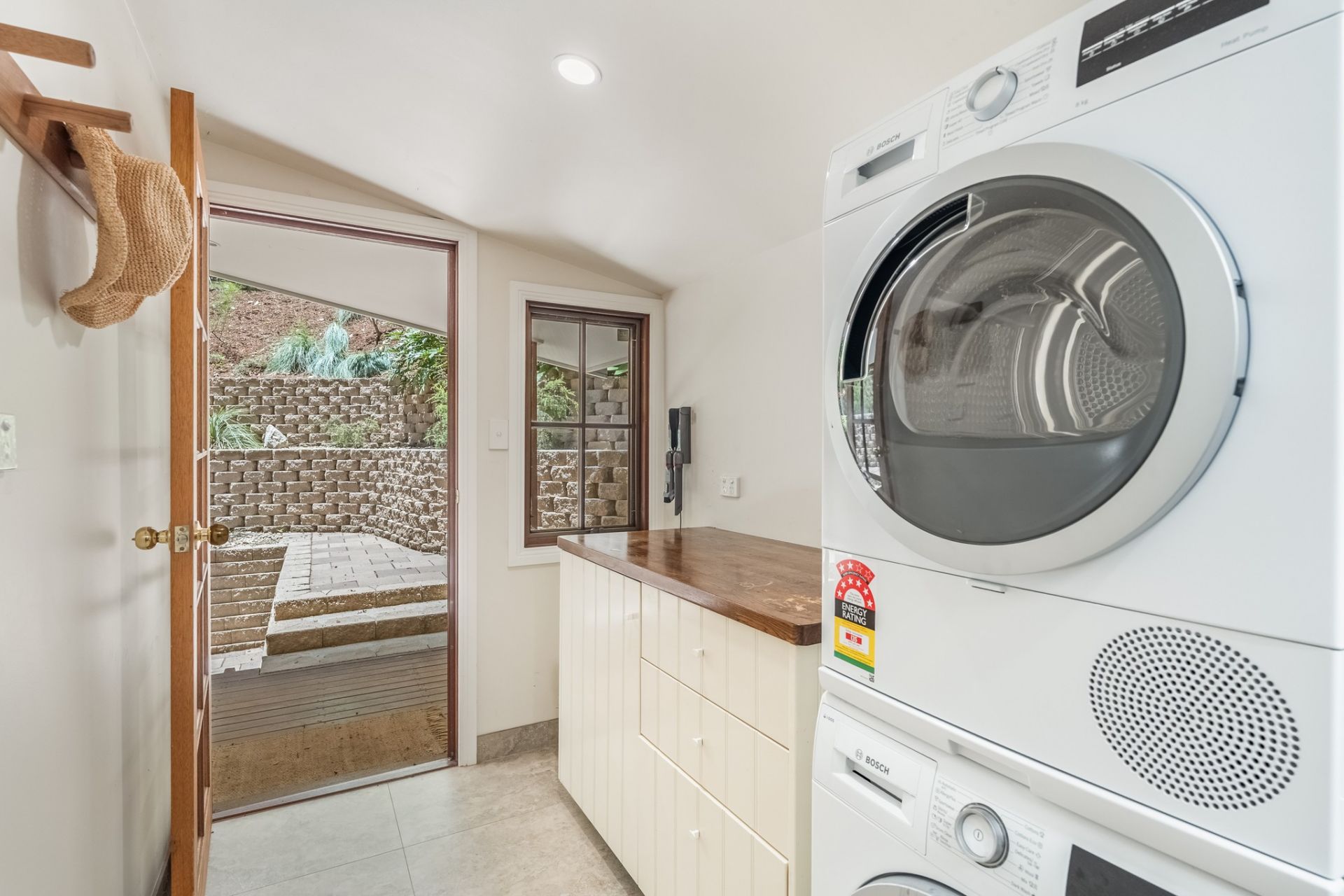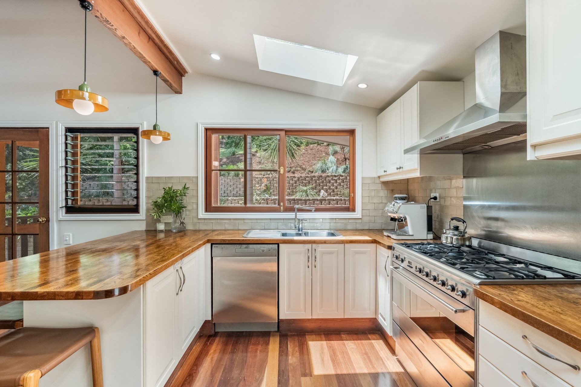 Open plan living with cathedral ceilings, renovated kitchen including a Smeg 6 burner gas/electric stove and an Asko Dishwasher. On this level there are 2 large bedrooms, a superb bathroom with travertine tiles and brushed copper tapware. There is a separate laundry room with plenty of room for storage.