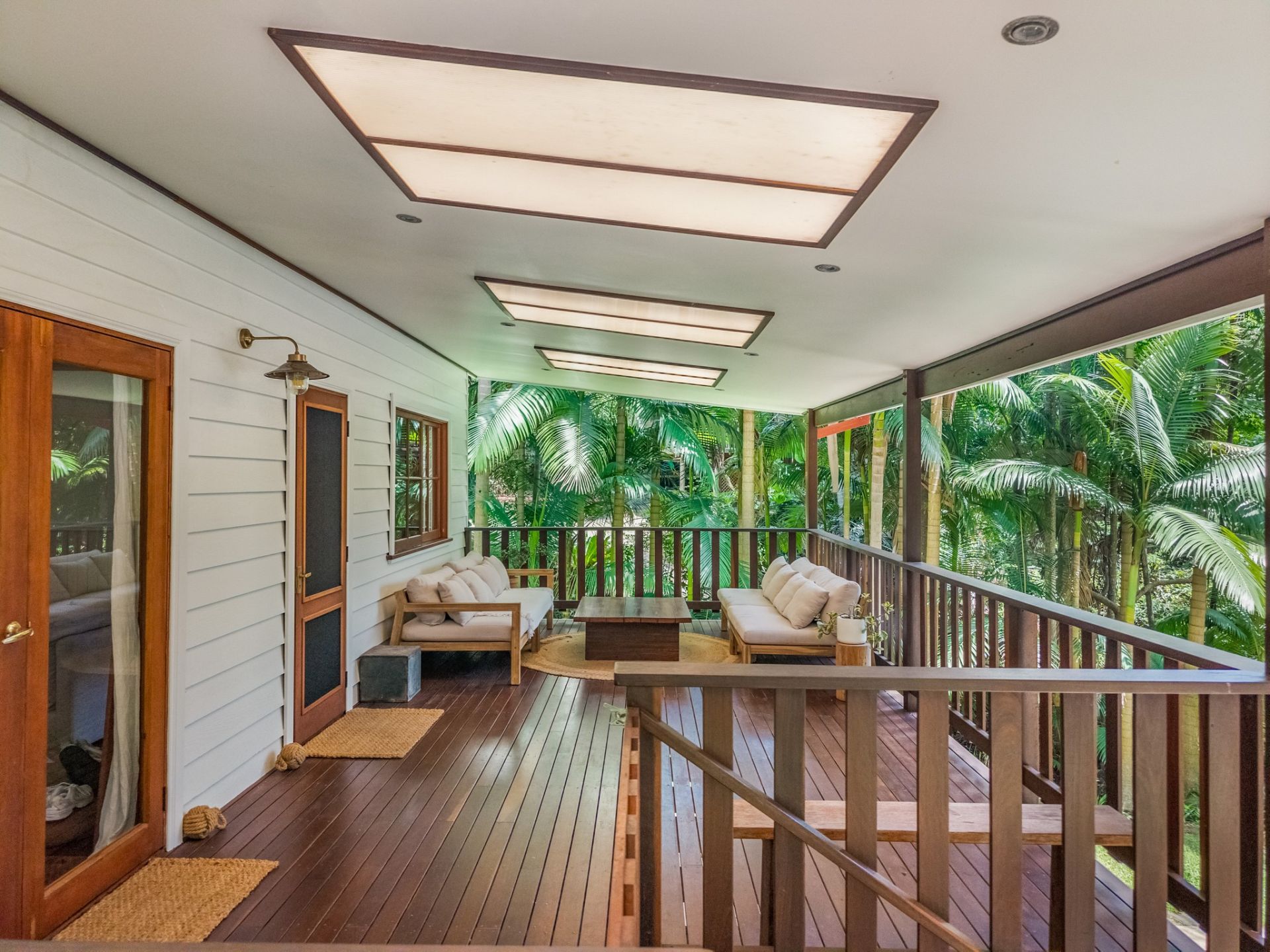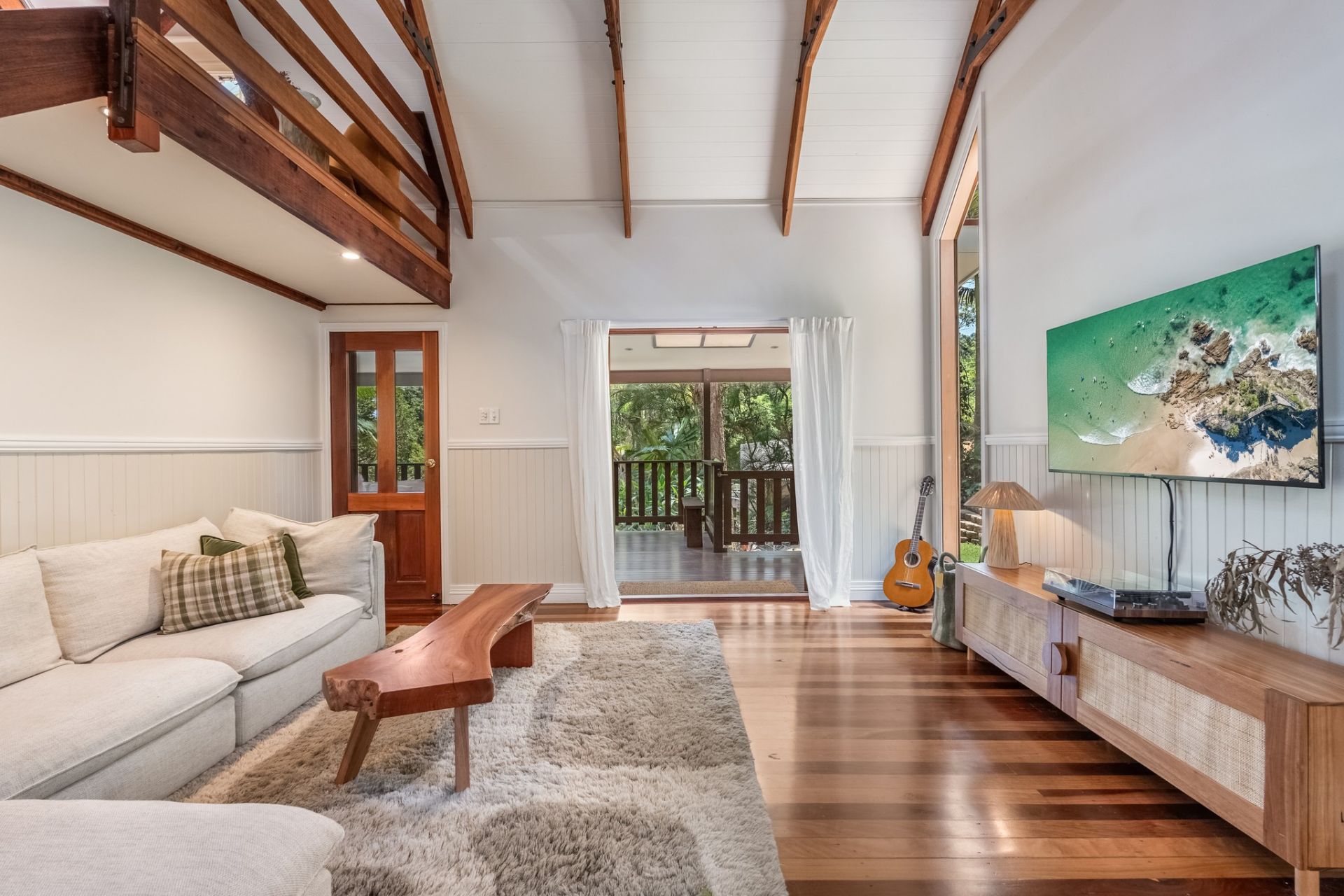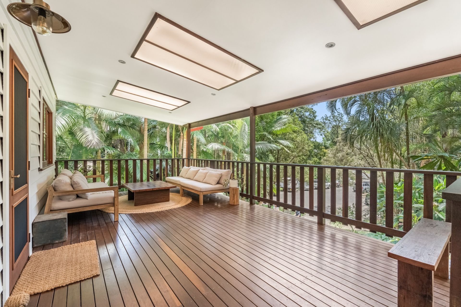 The living room opens through cedar French doors onto a generous covered hardwood balcony which is a wonderful space for relaxation and entertaining.