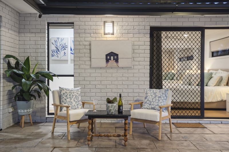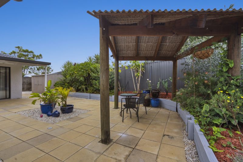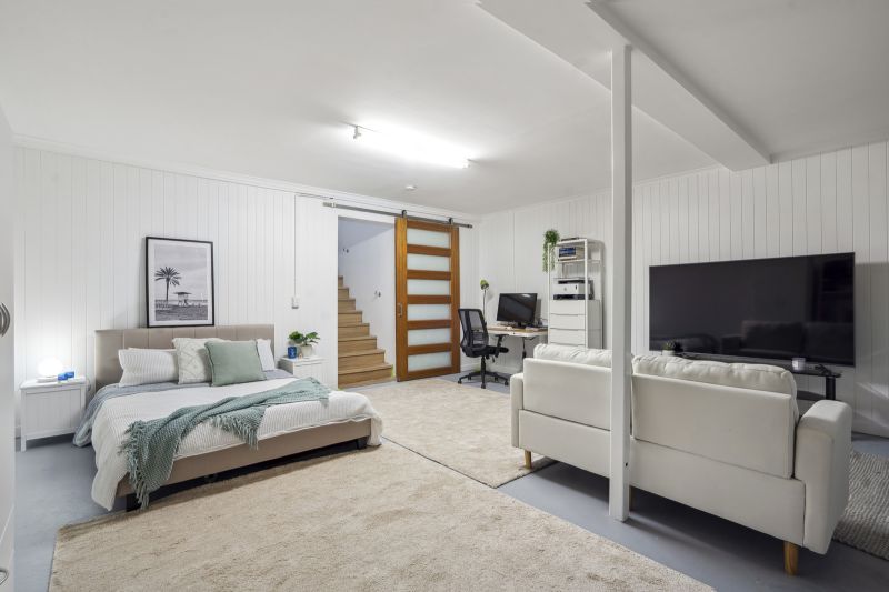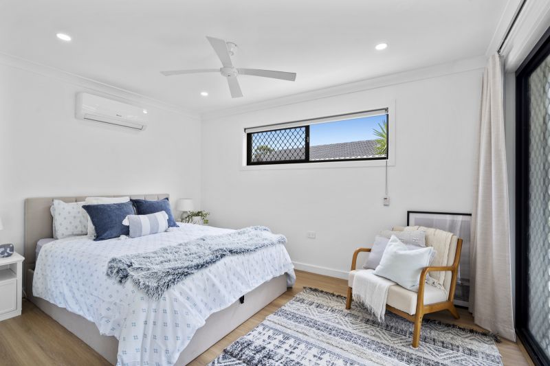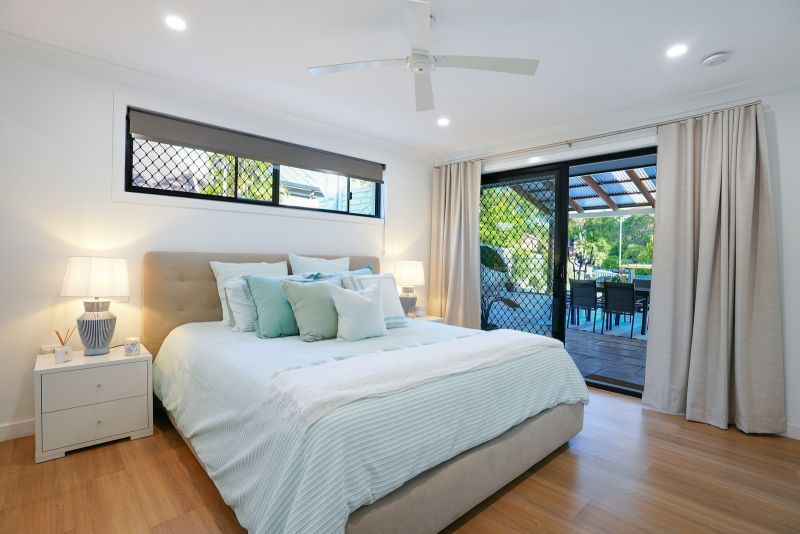 The master suite is a luxurious retreat, backing onto a bali hut overlooking the pool. It features a a spacious ensuite. The two additional bedrooms are generously sized, each with ceiling fans and mirrored robes, ensuring comfort and convenience. A converted garage offers a versatile multipurpose room, ideal as a fourth bedroom or creative space.