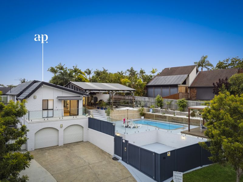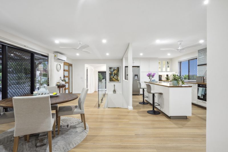 Set on an elevated, tranquil block this recently renovated family home effortlessly blends contemporary style with thoughtful design. Situated in a highly sought-after Gold Coast neighborhood, it captures refreshing breezes and offers breathtaking hinterland views, creating a private sanctuary just moments from essential amenities.