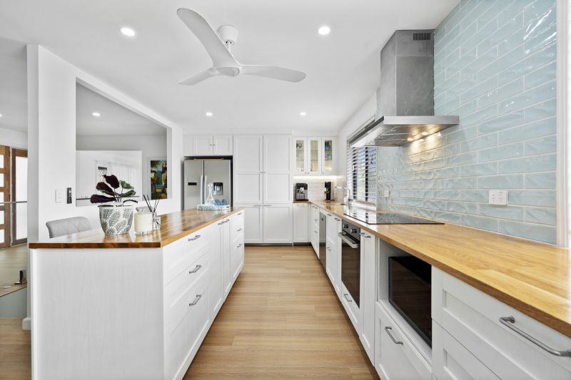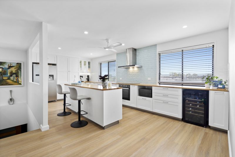 The transformation of this home is immediately apparent, offering the ideal space for both families and entertainers. At its heart lies the impeccably designed kitchen-a true chef's dream. Featuring expansive bench space, abundant storage, and modern conveniences such as soft-close drawers, a pull-out pantry with built-in drawers, a self-cleaning steam oven, and a lift-up dishwasher, this kitchen combines style with practicality. The soft blue-tiled splashback adds a touch of elegance, while the kitchen window frames stunning views of the hinterland sunsets.