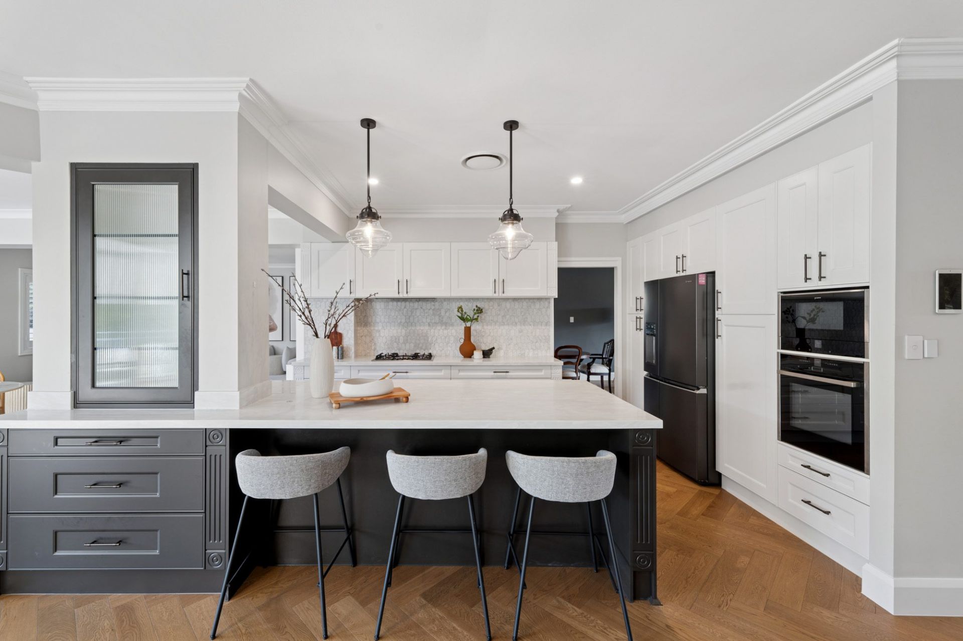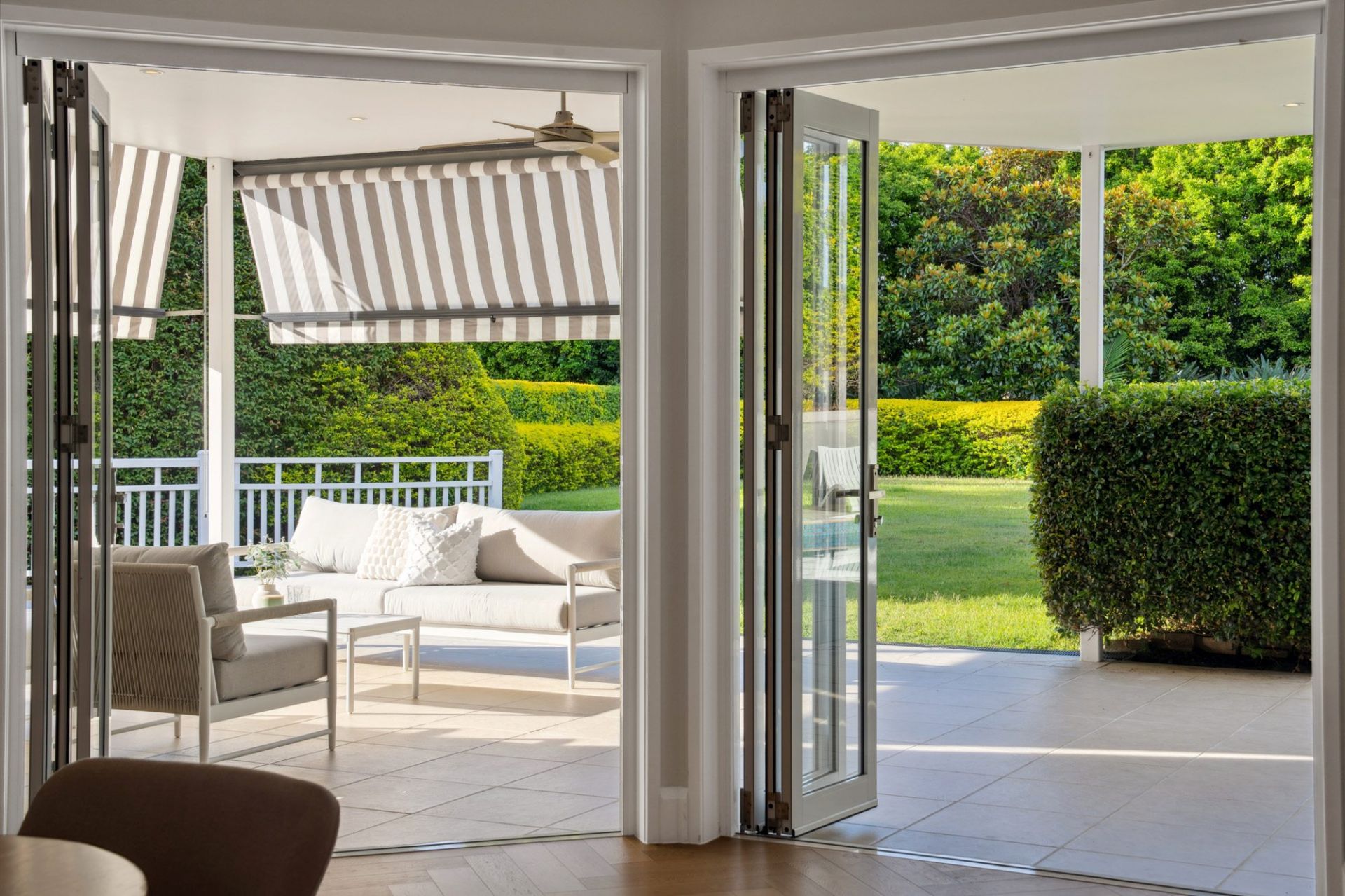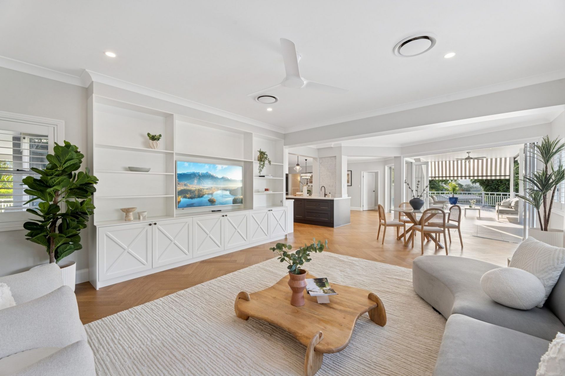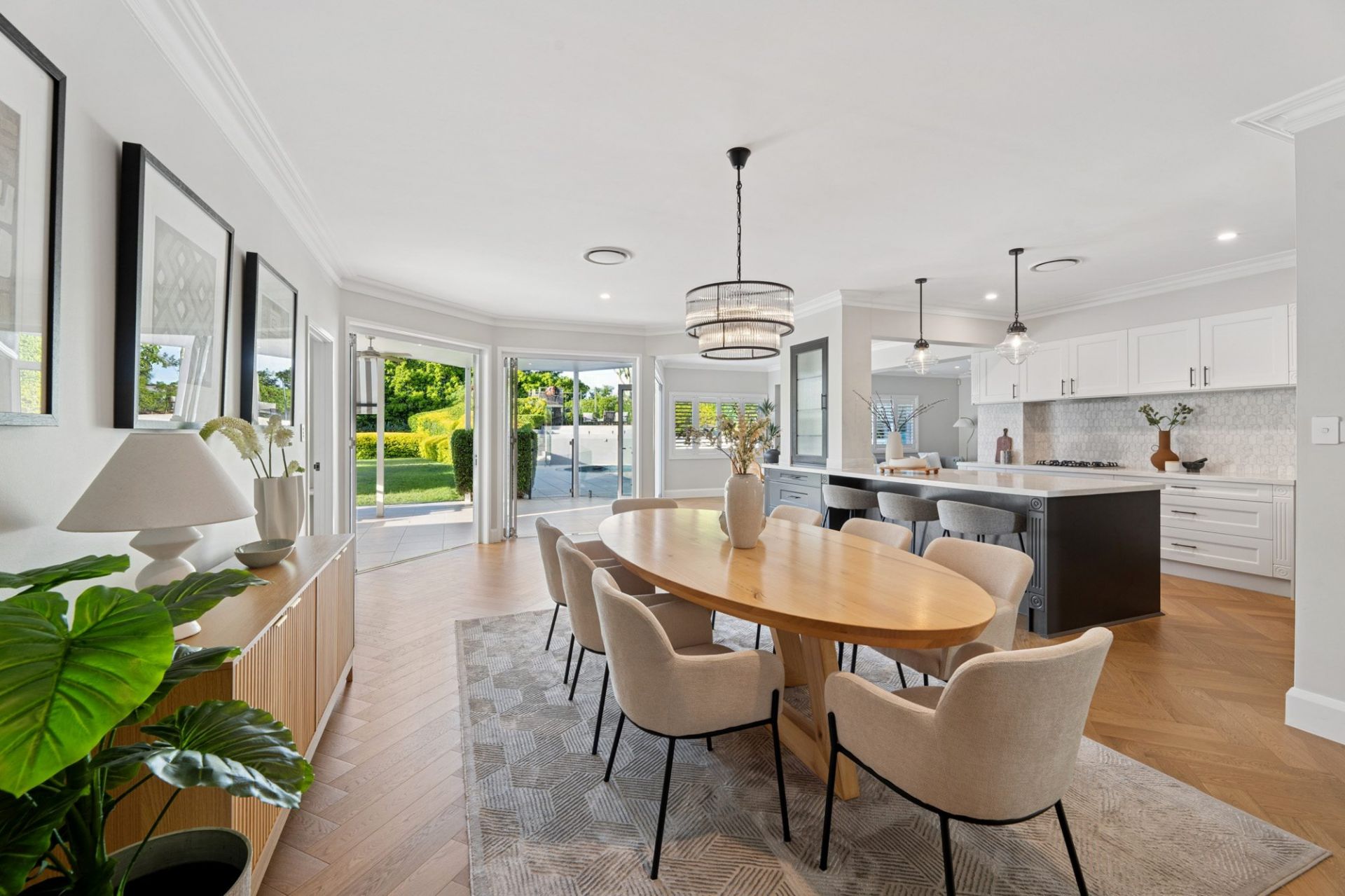 The gourmet kitchen serves as the heart of the home, showcasing sleek modern appliances, a gas cooktop, rangehood, and breakfast bar. It adjoins the informal dining and family area, which flows effortlessly to an expansive covered outdoor entertaining terrace overlooking the gardens.