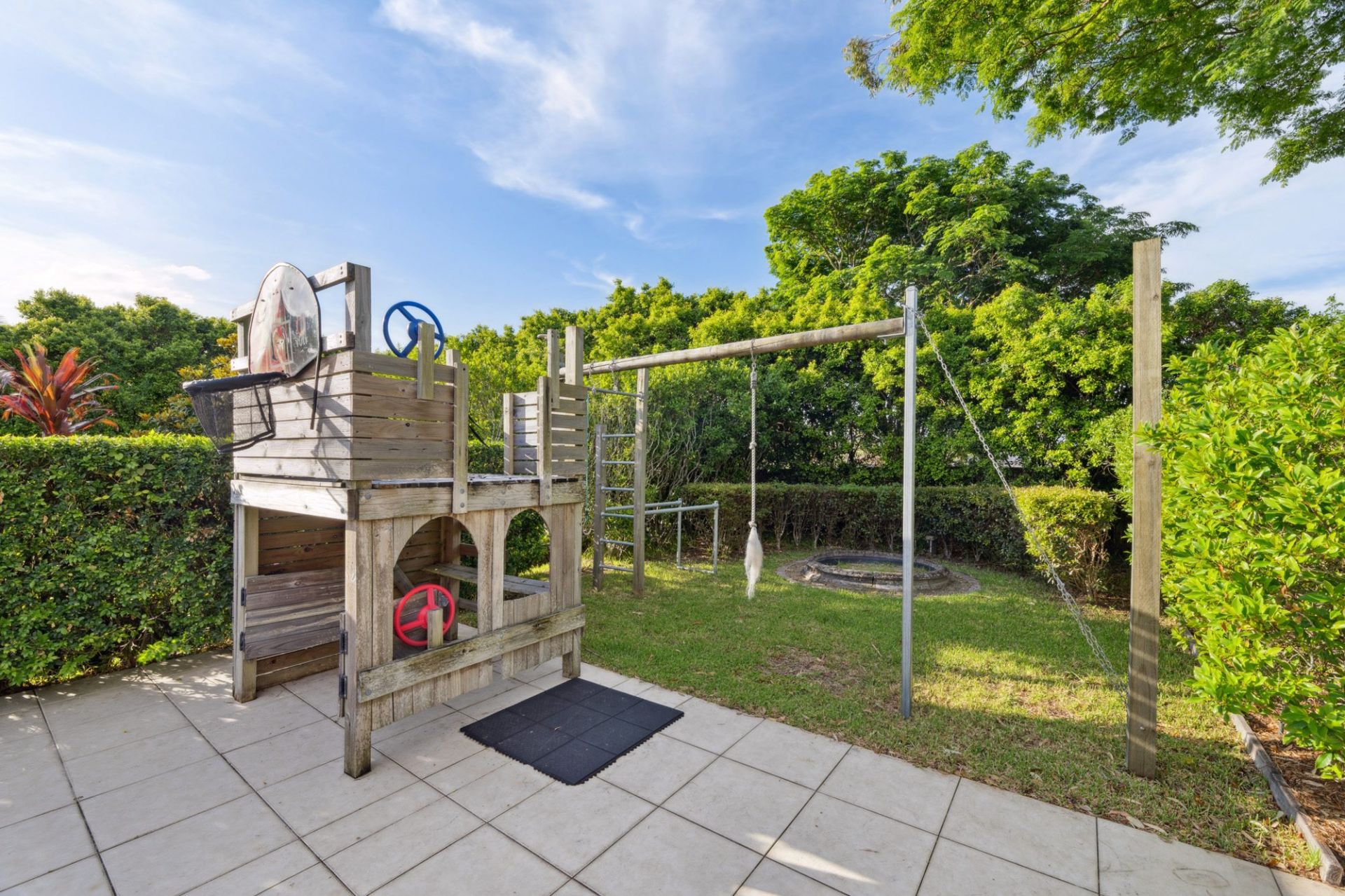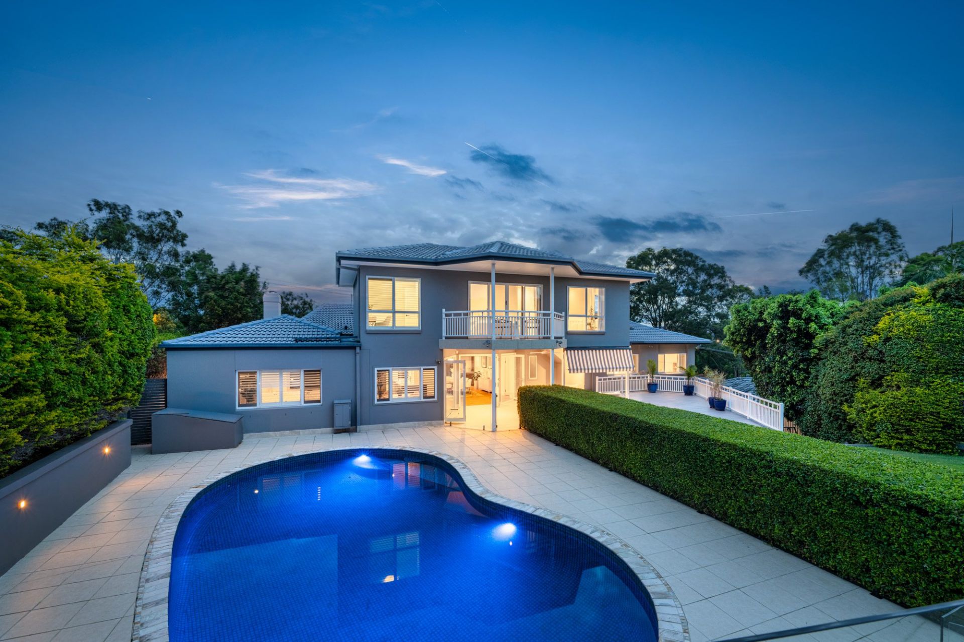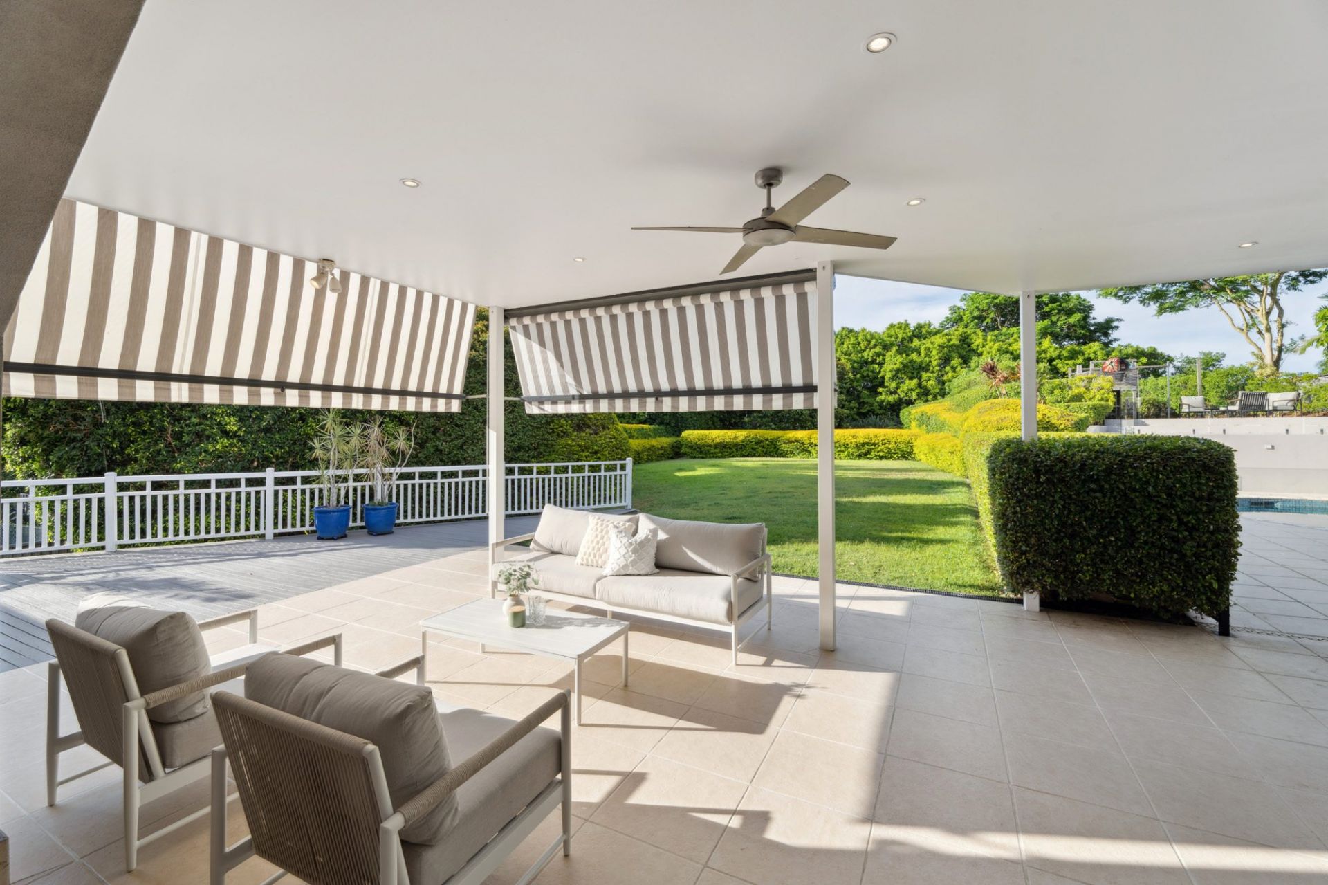 - Glass-fenced in-ground pool surrounded by landscaped gardens