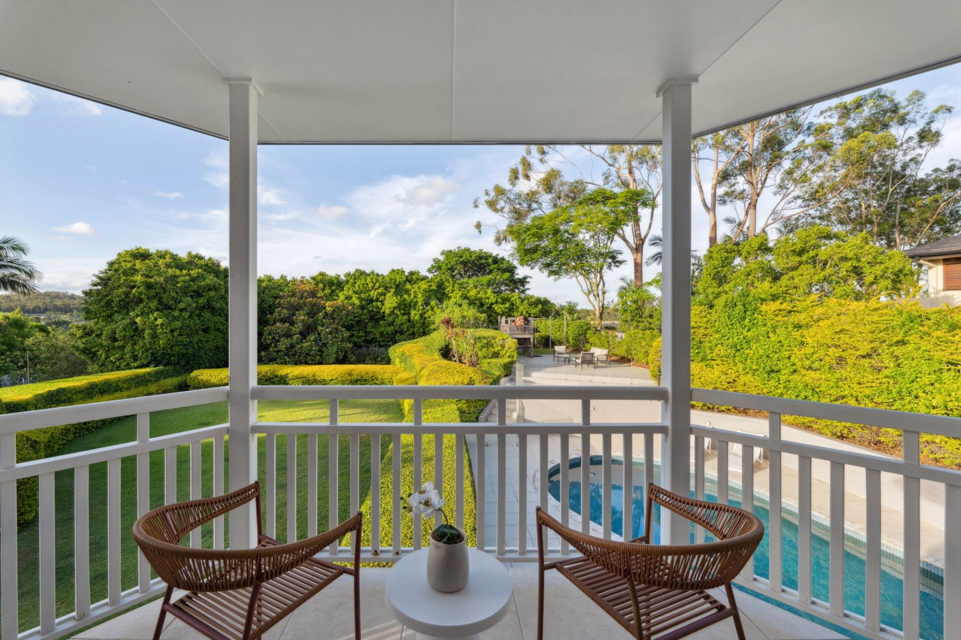The entire upper floor is reserved for the Master Retreat - a sanctuary of space and style with a private office, elegant ensuite, walk-in wardrobe, and a broad north-facing Balcony capturing panoramic views over the pool, manicured grounds, and lush Hinterland.