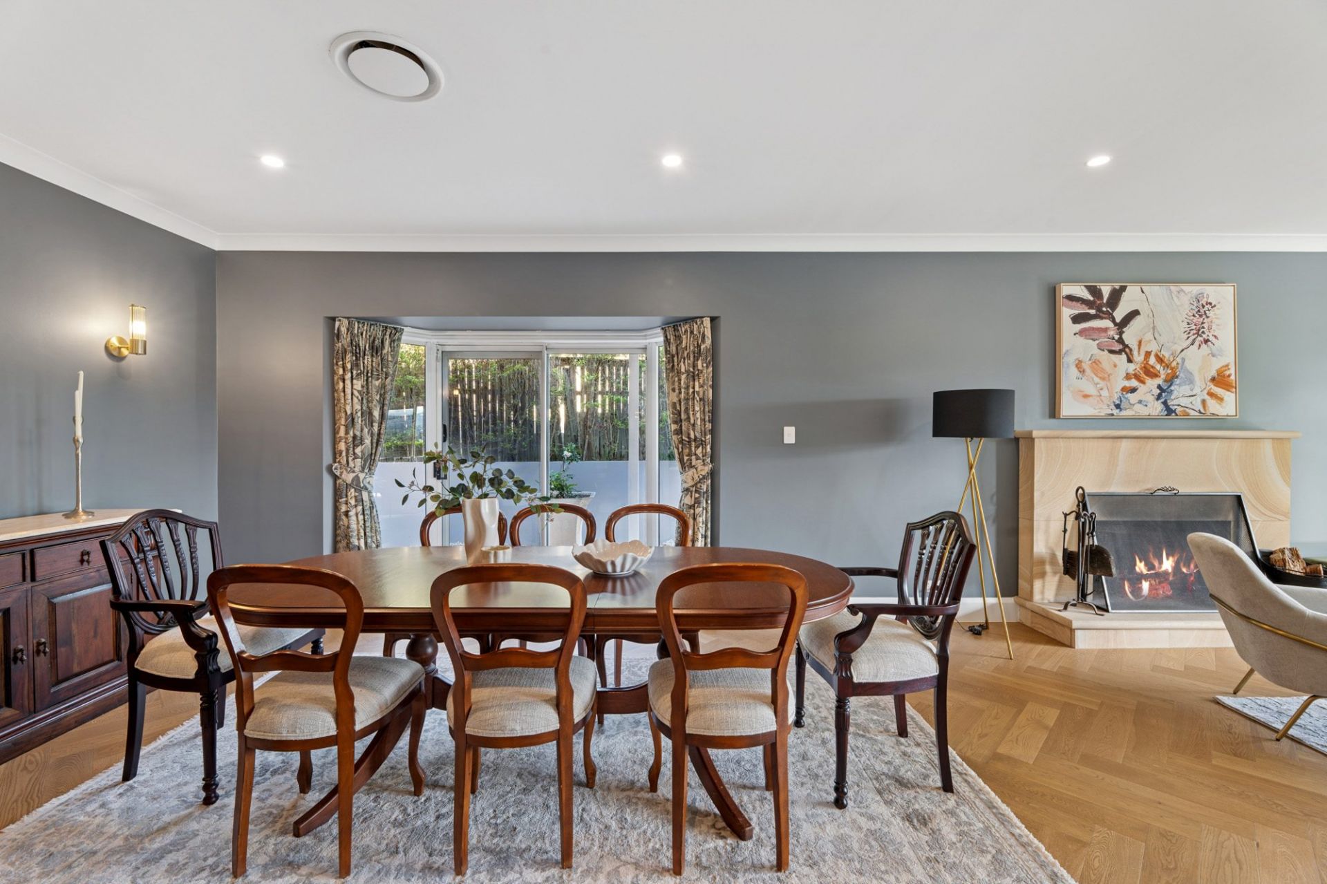 The formal lounge and dining area are anchored by a feature wood fireplace and open through sliding doors to a wraparound verandah - the perfect setting for evening cocktails or quiet relaxation.