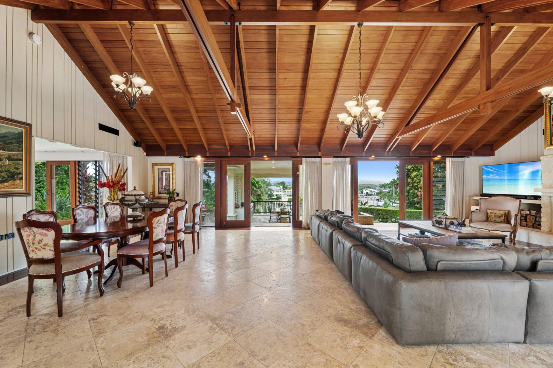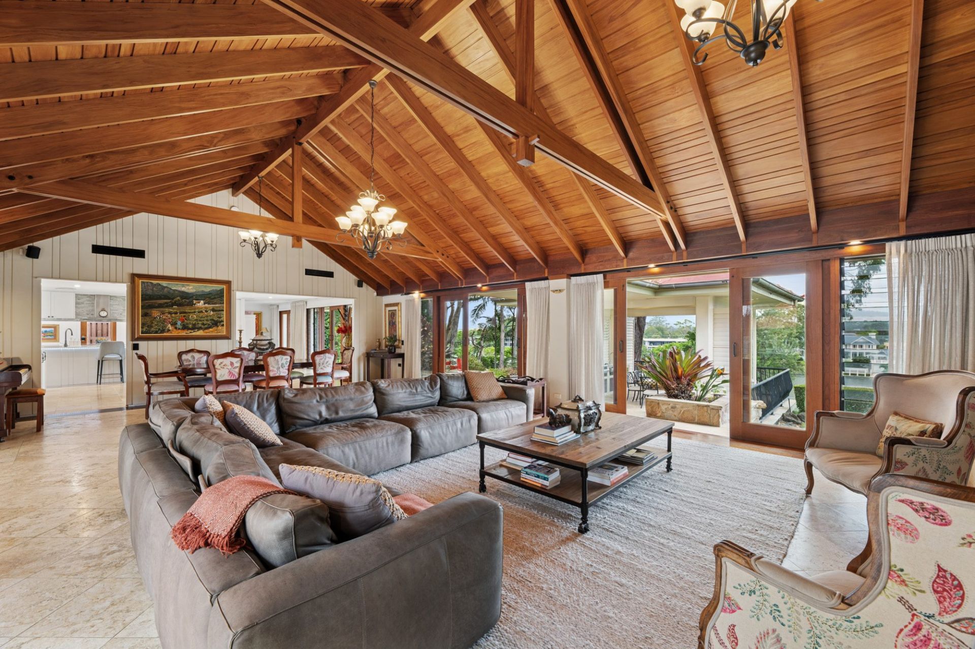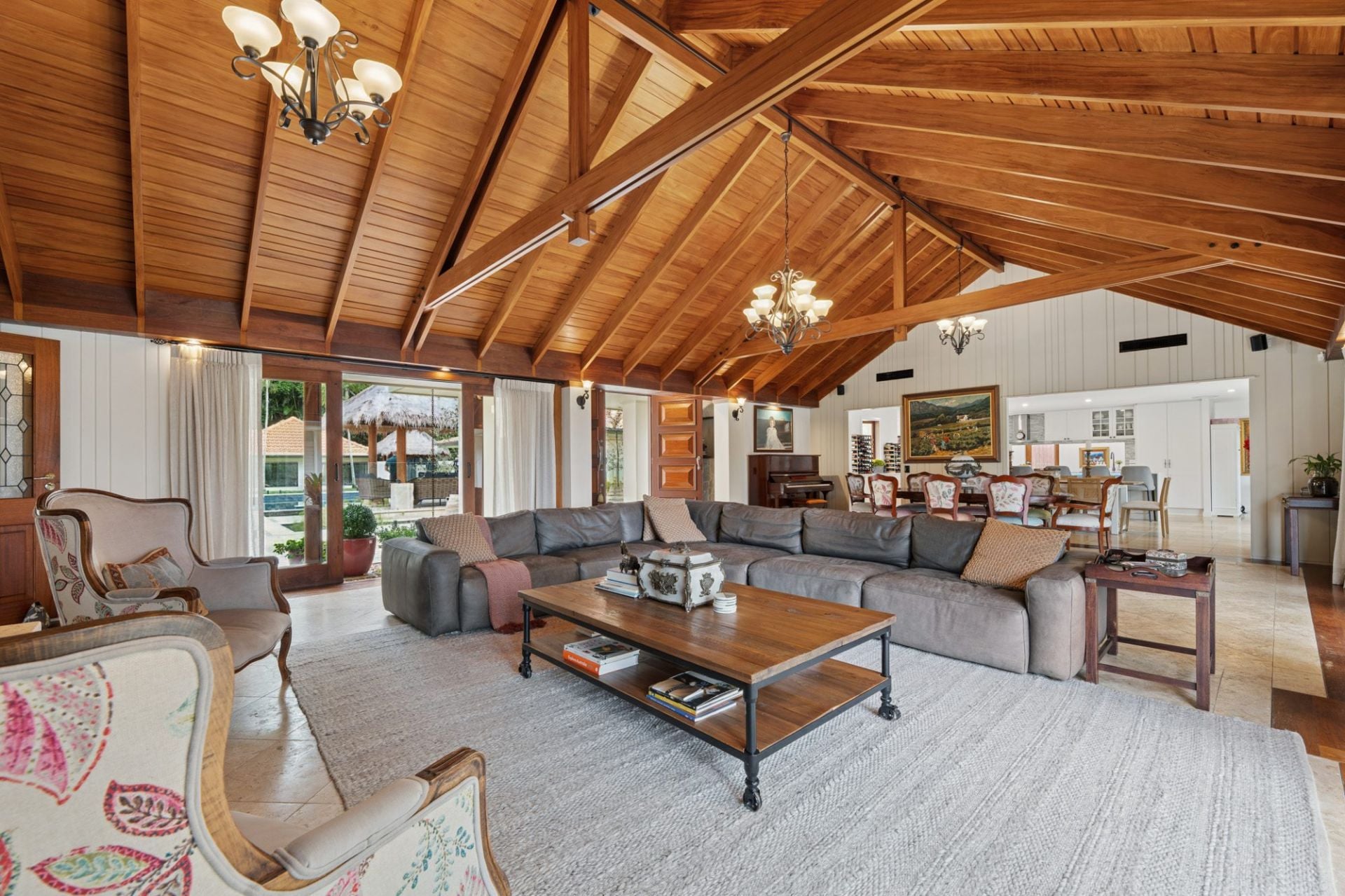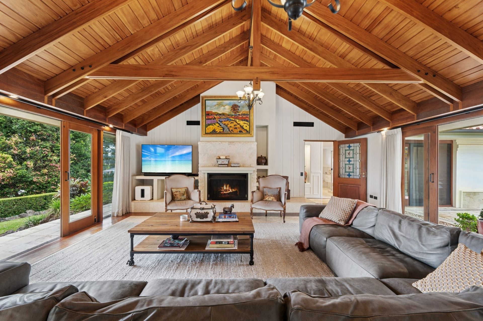 Palatial high timber ceilings open plan living with formal dining and living area with a Fireplace.