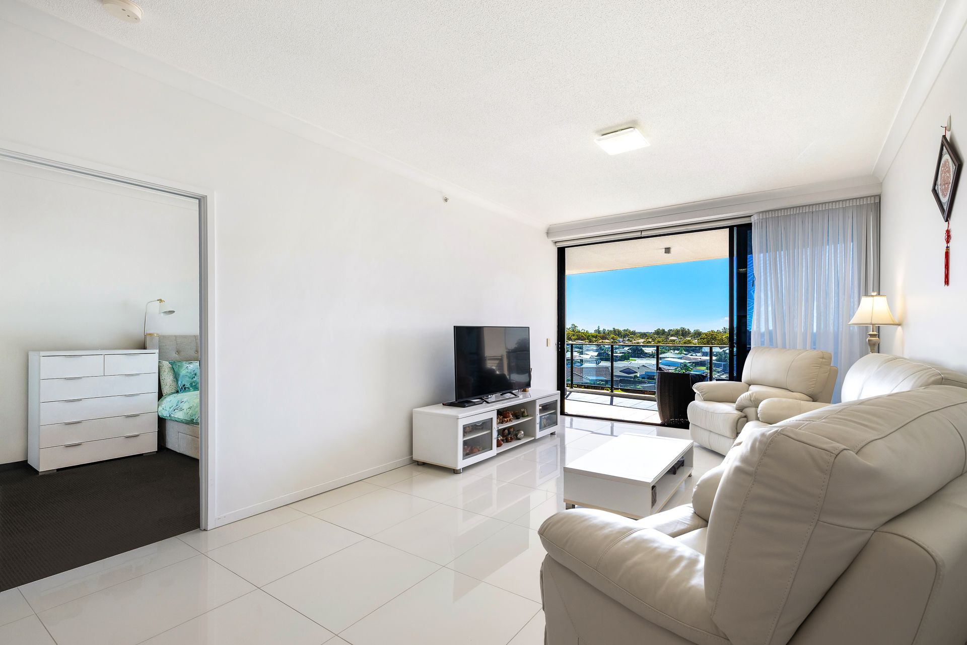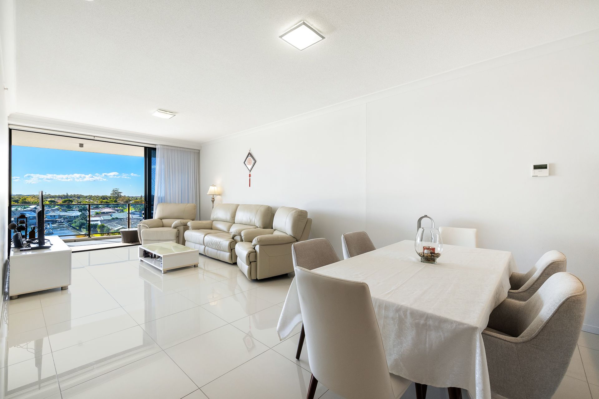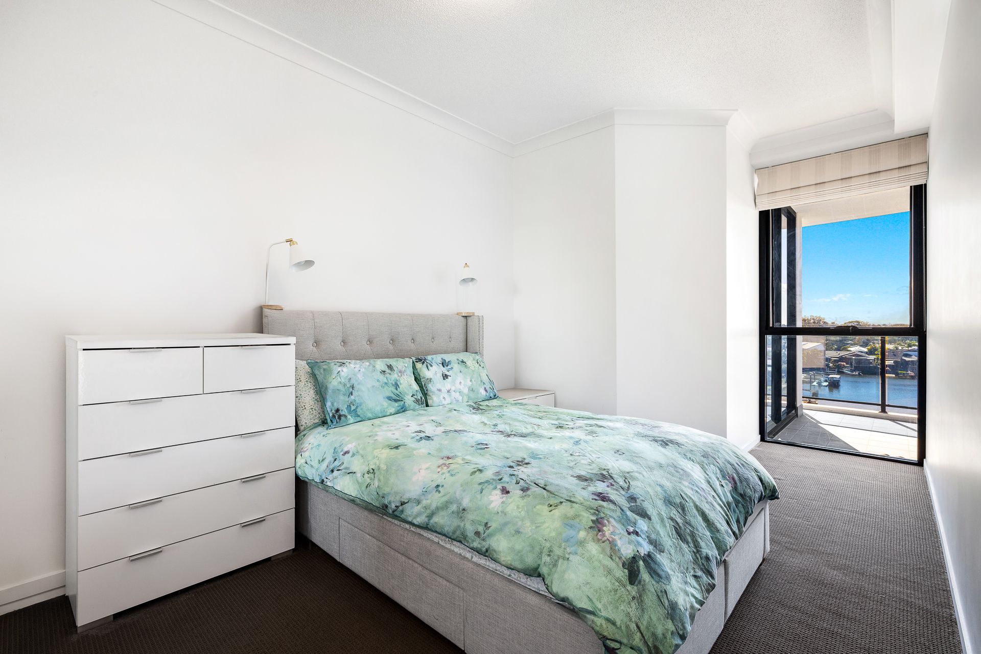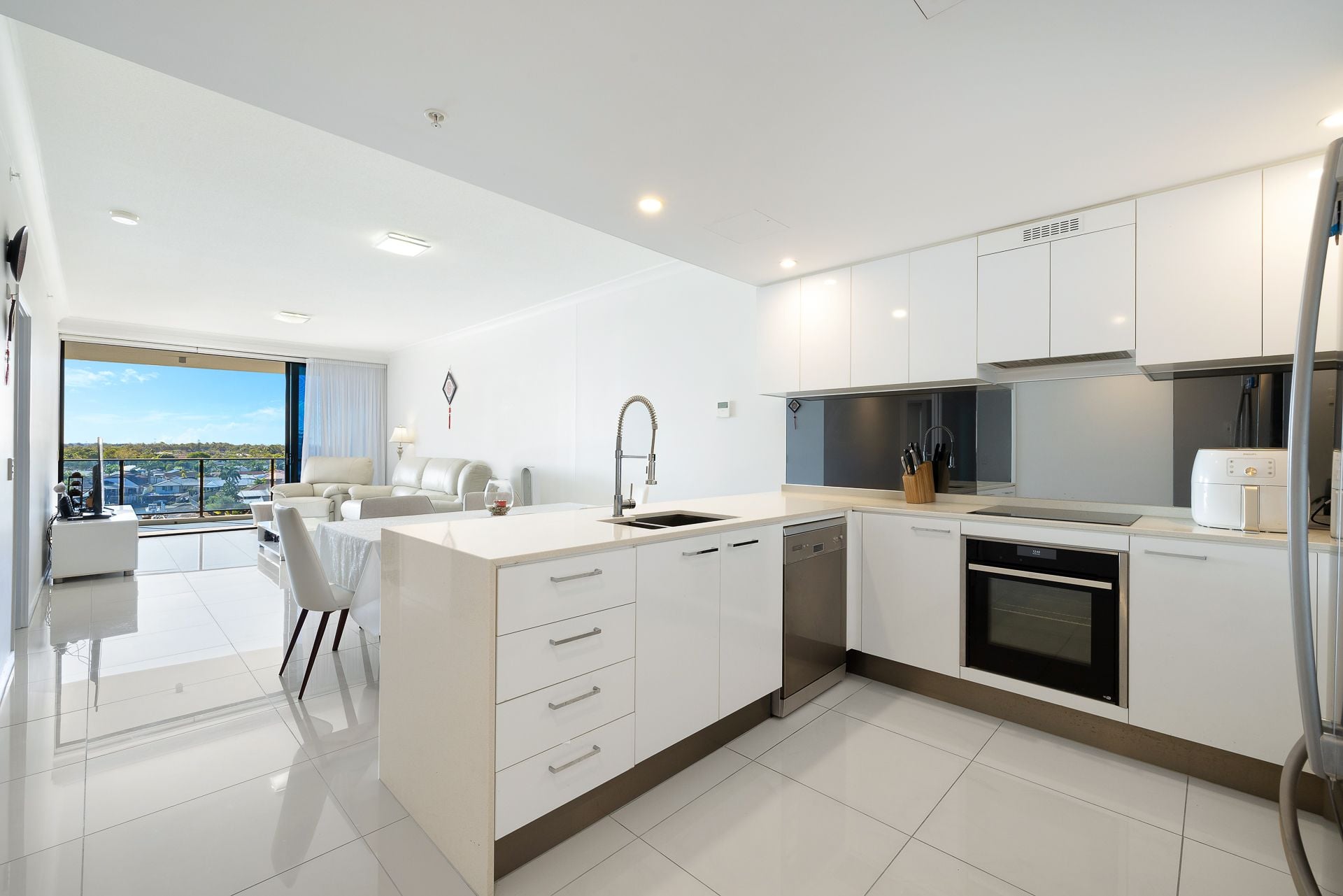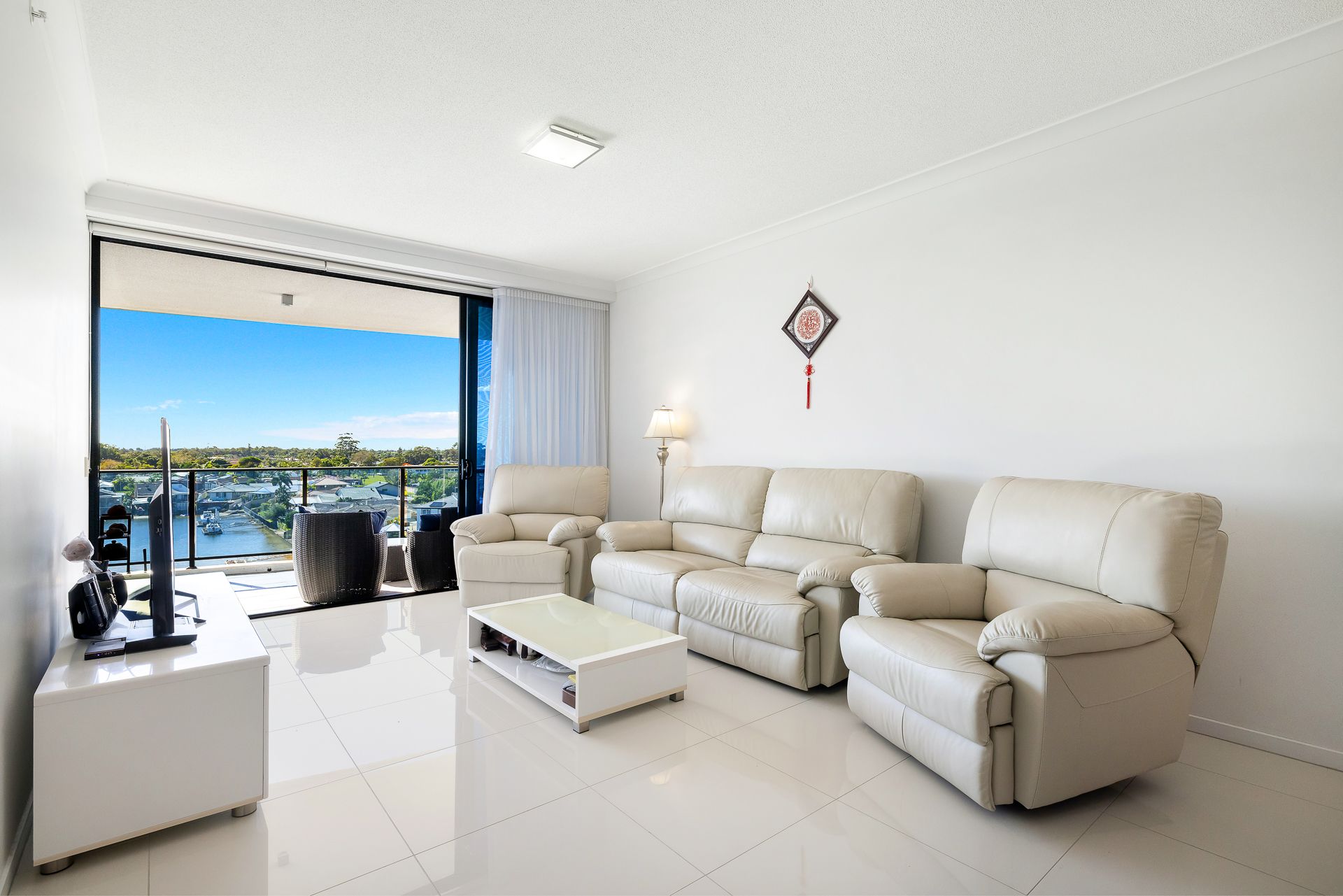 The open-plan living and dining area is bright and breezy, seamlessly flowing onto a spacious balcony where you can entertain guests or simply unwind with panoramic views across the tranquil Broadwater and out to the hinterland. Every detail has been thoughtfully considered, from the high ceilings and ducted air conditioning to the quality finishes throughout.