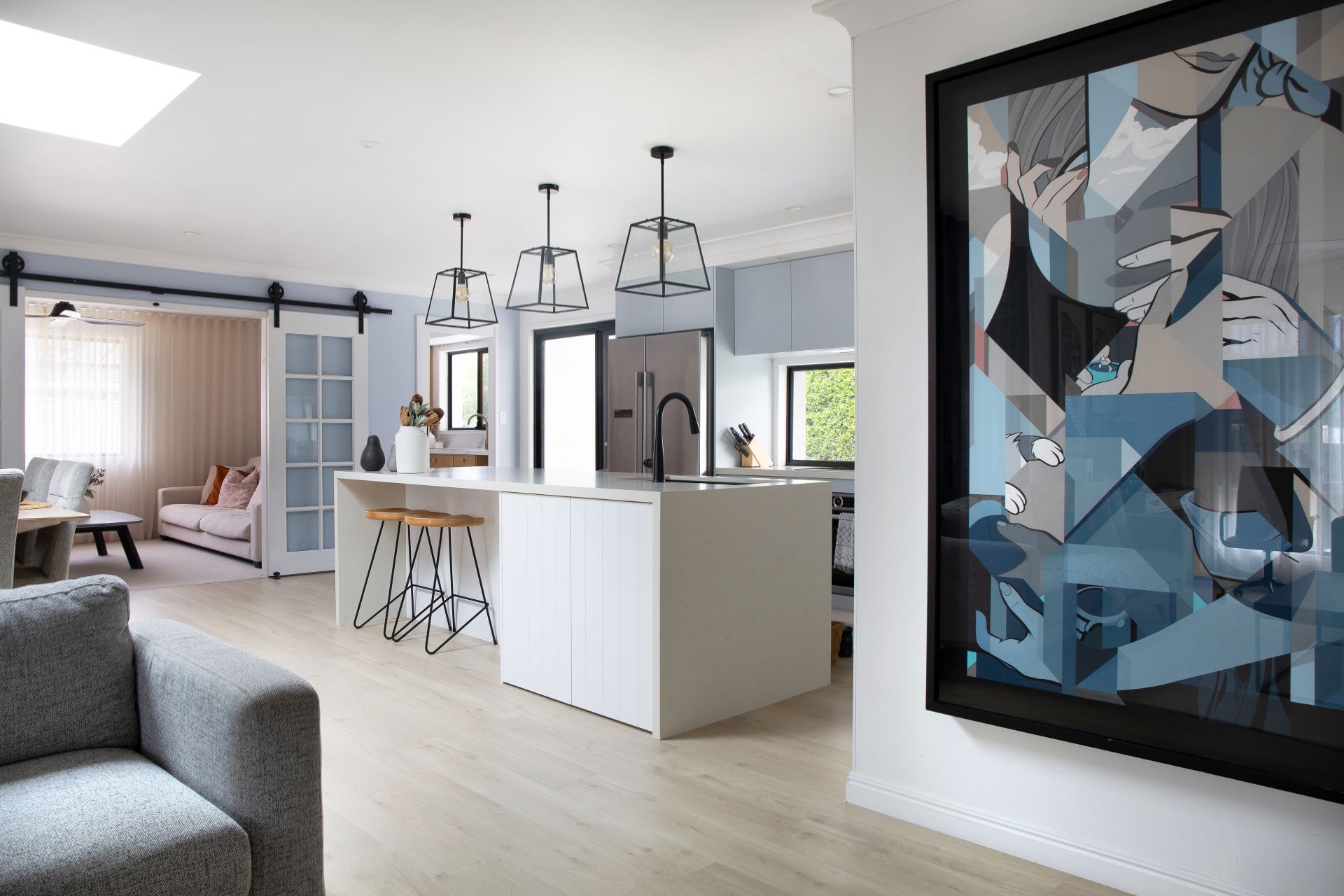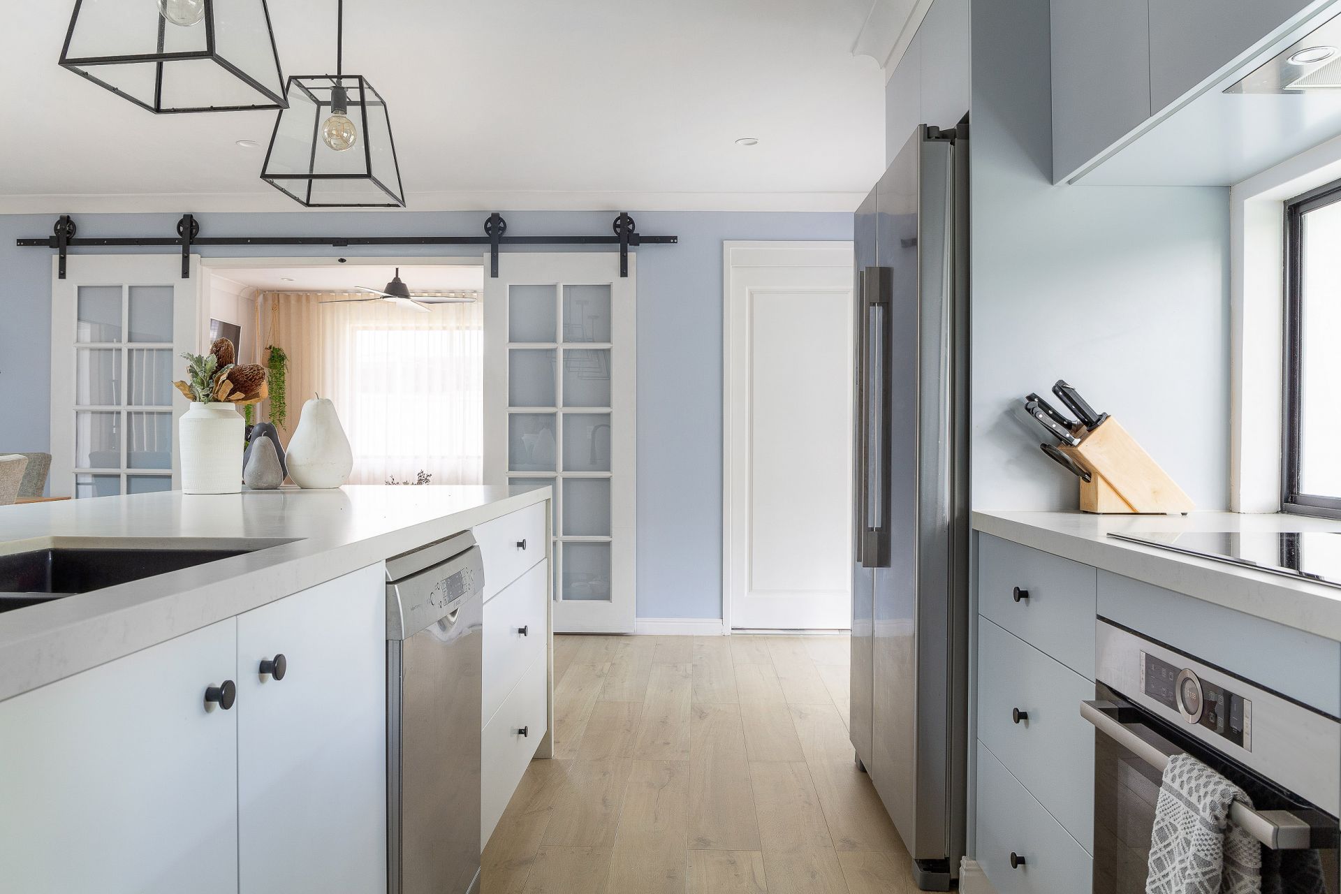 - Kitchen with stainless steel appliances, island benchtop, custom lighting