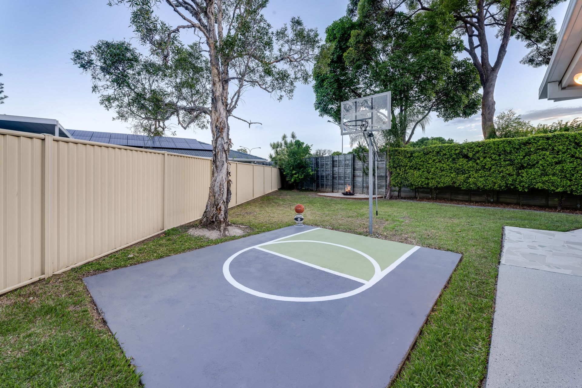 - Basketball breakout area, large grassed yard for the kids with firepit chill zone