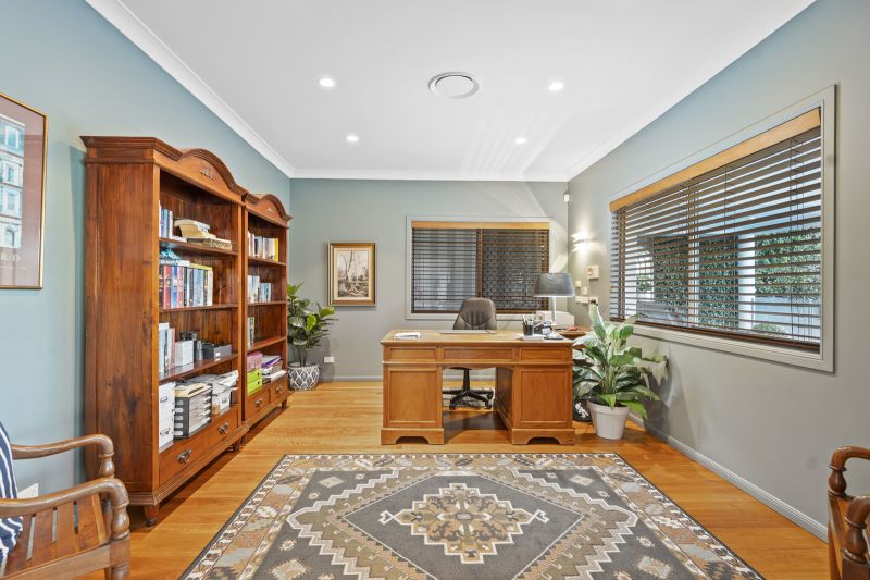 An expansive living/media room provides the perfect venue for entertaining, family gatherings, or quiet evenings at home, while polished timber floors lend a touch of warmth and elegance throughout the space. High ceilings, a grand double-door entry, and abundant natural light enhance the home's open, airy atmosphere. White plantation shutters, ducted air conditioning, and advanced security features ensure both comfort and peace of mind.