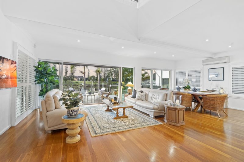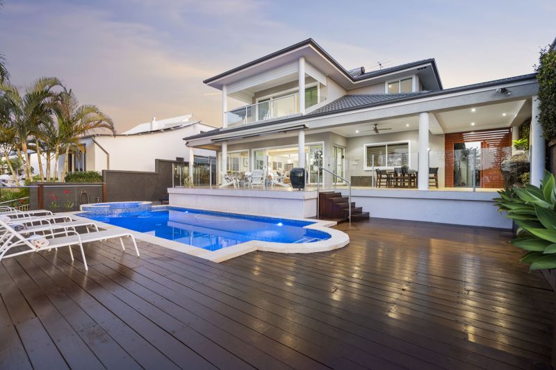 Step into a world of refined elegance with this exceptional family residence, privately nestled at the end of an exclusive cul-de-sac, enjoying a coveted North aspect overlooking the sweeping Main River. This immaculate 413sqm home, offers a phenomenal layout with soaring ceilings, expansive living areas, and extensive outdoor entertaining spaces, is the essence of sophisticated Gold Coast living.