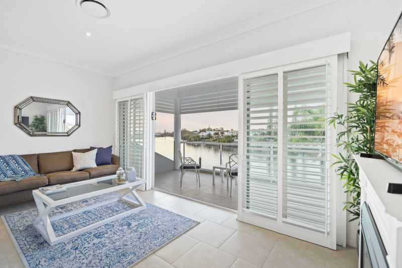 Outdoors, the property continues to impress with its expansive riverfront amenities. A large pontoon allows for direct and swift access to the Broadwater, making it perfect for boating enthusiasts. The covered loggia offers an ideal setting for alfresco entertaining, overlooking a fully-tiled pool with a spa, where you can relax while taking in the riverfront panorama and stunning skyline beyond.