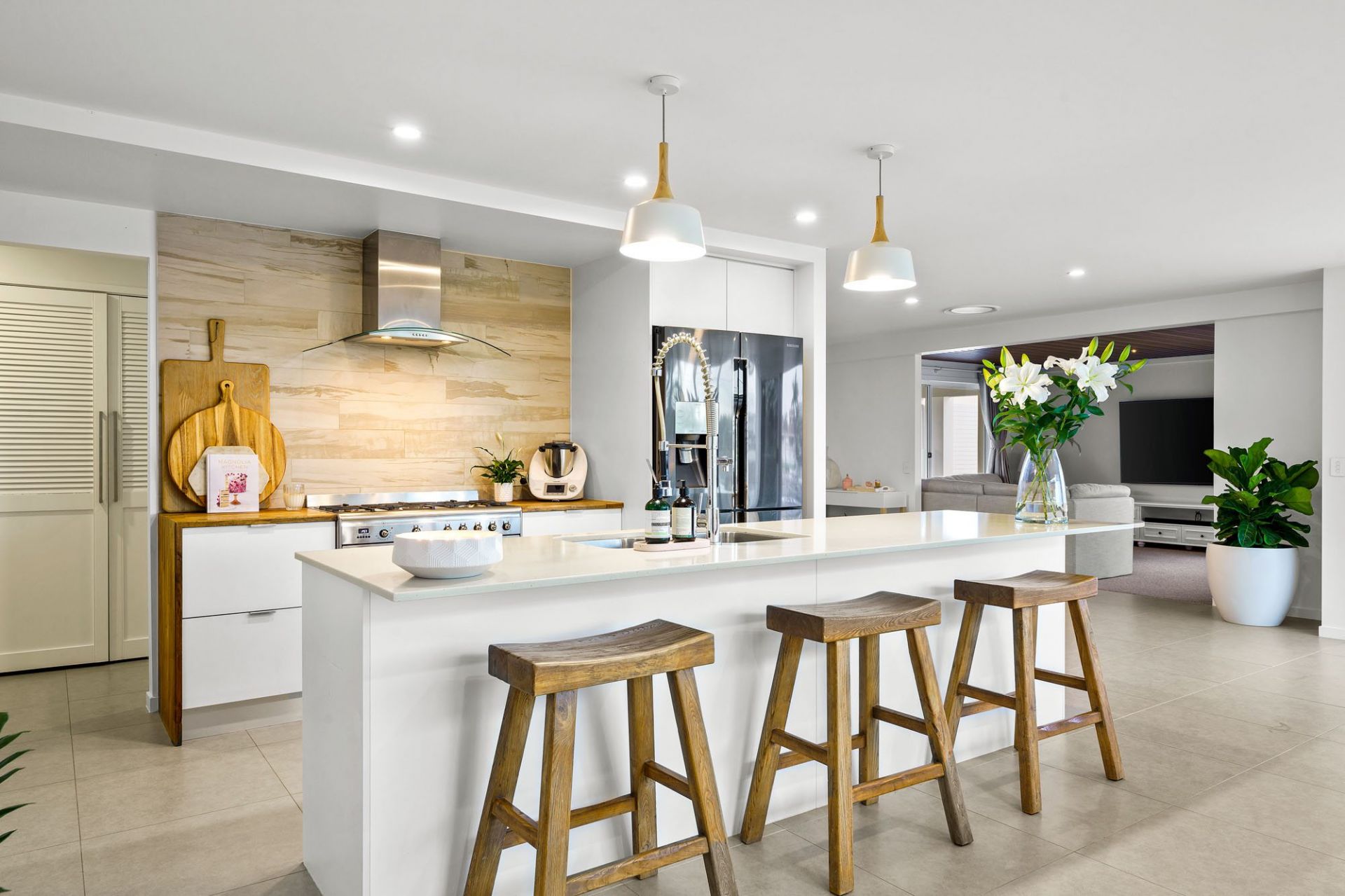 Step into a grand open-plan layout where spacious living and dining zones are bathed in natural sunlight and oriented to embrace calming water views. The gourmet kitchen is the centrepiece of the home - beautifully appointed with sleek stone benchtops, premium appliances, a breakfast bar, and ample storage, ideal for everyday living and entertaining alike.