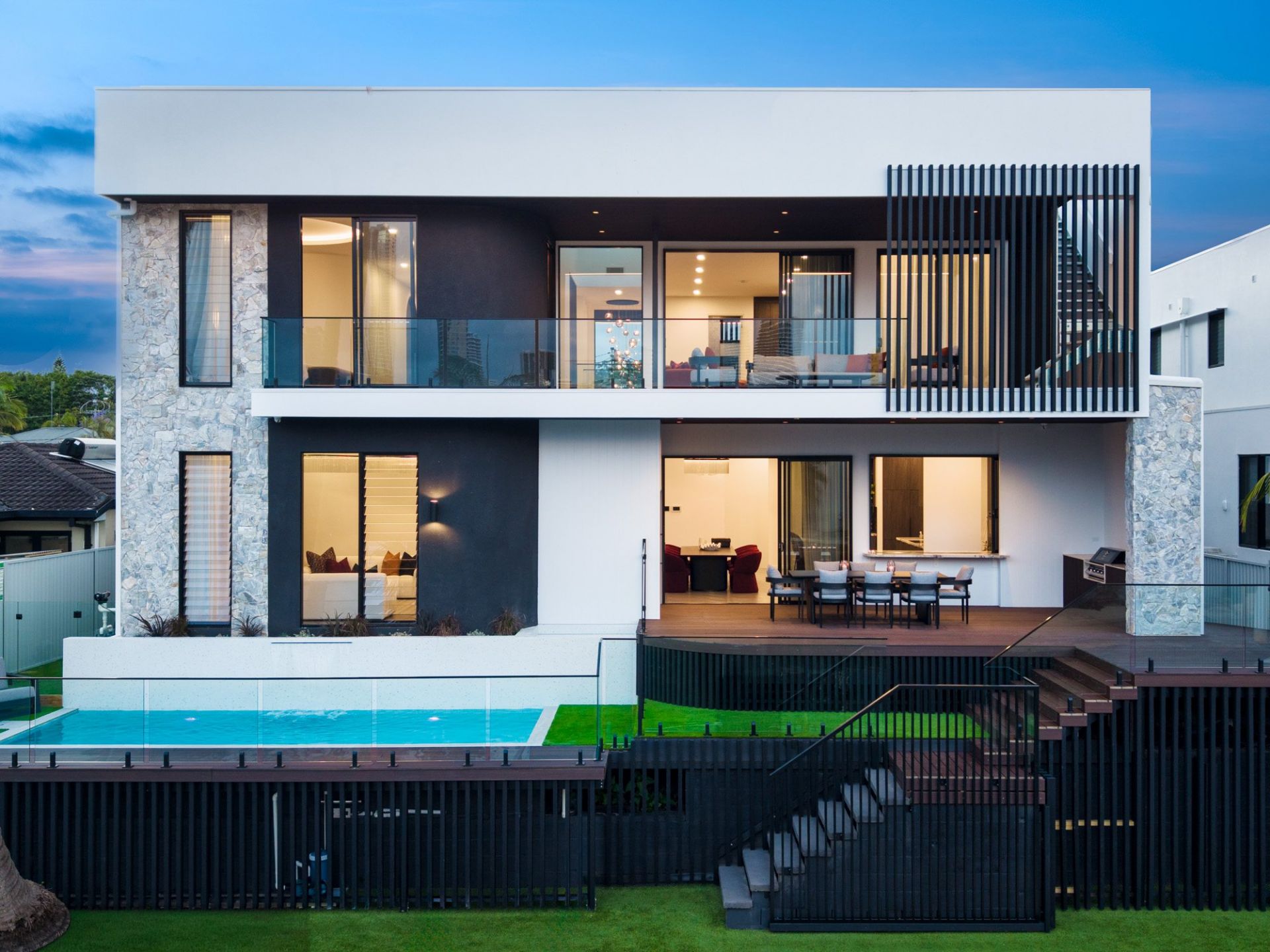 - Immense open plan living and dining spaces on ground, first and rooftop levels, an impressive statement in design & livability
