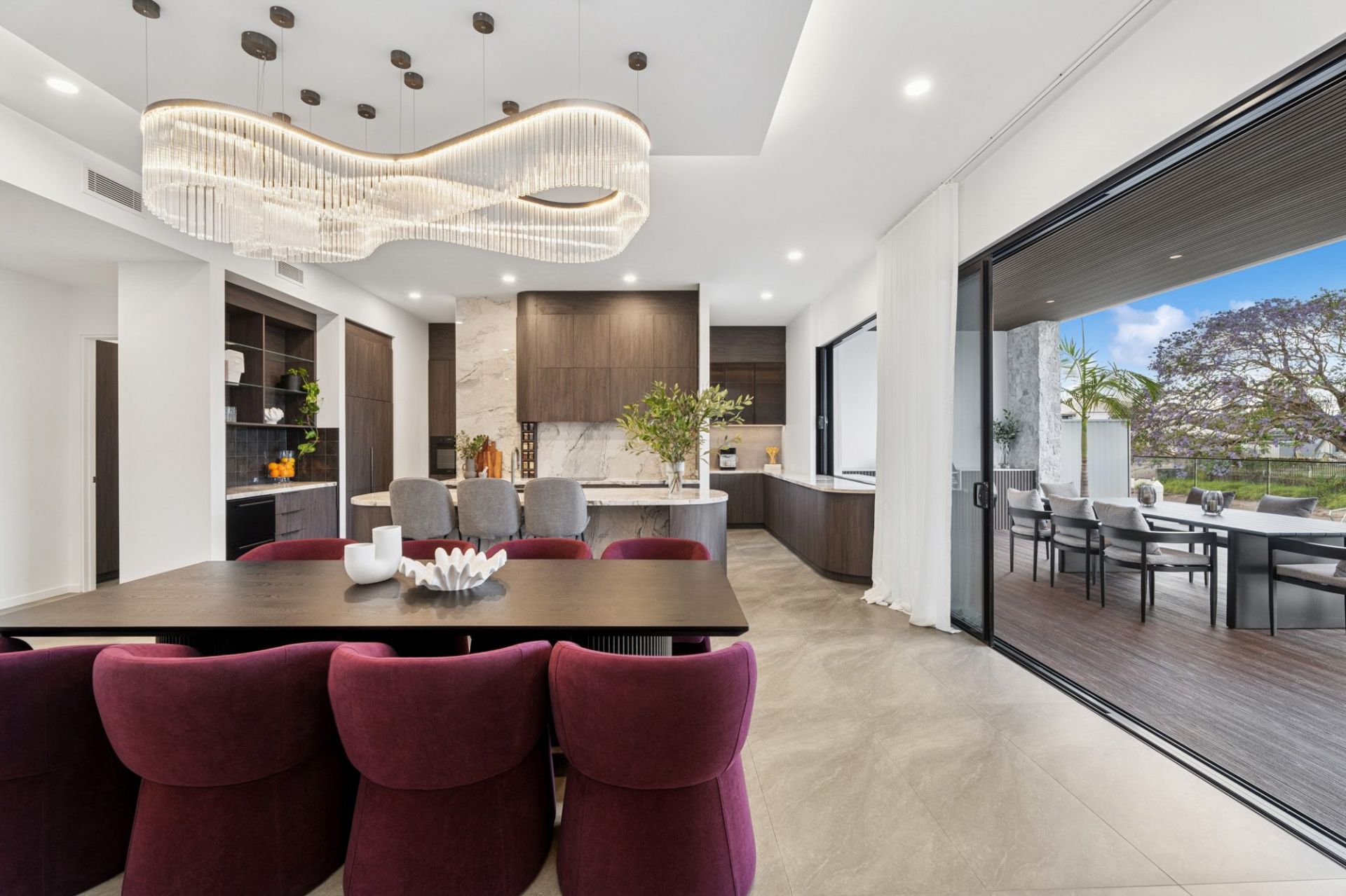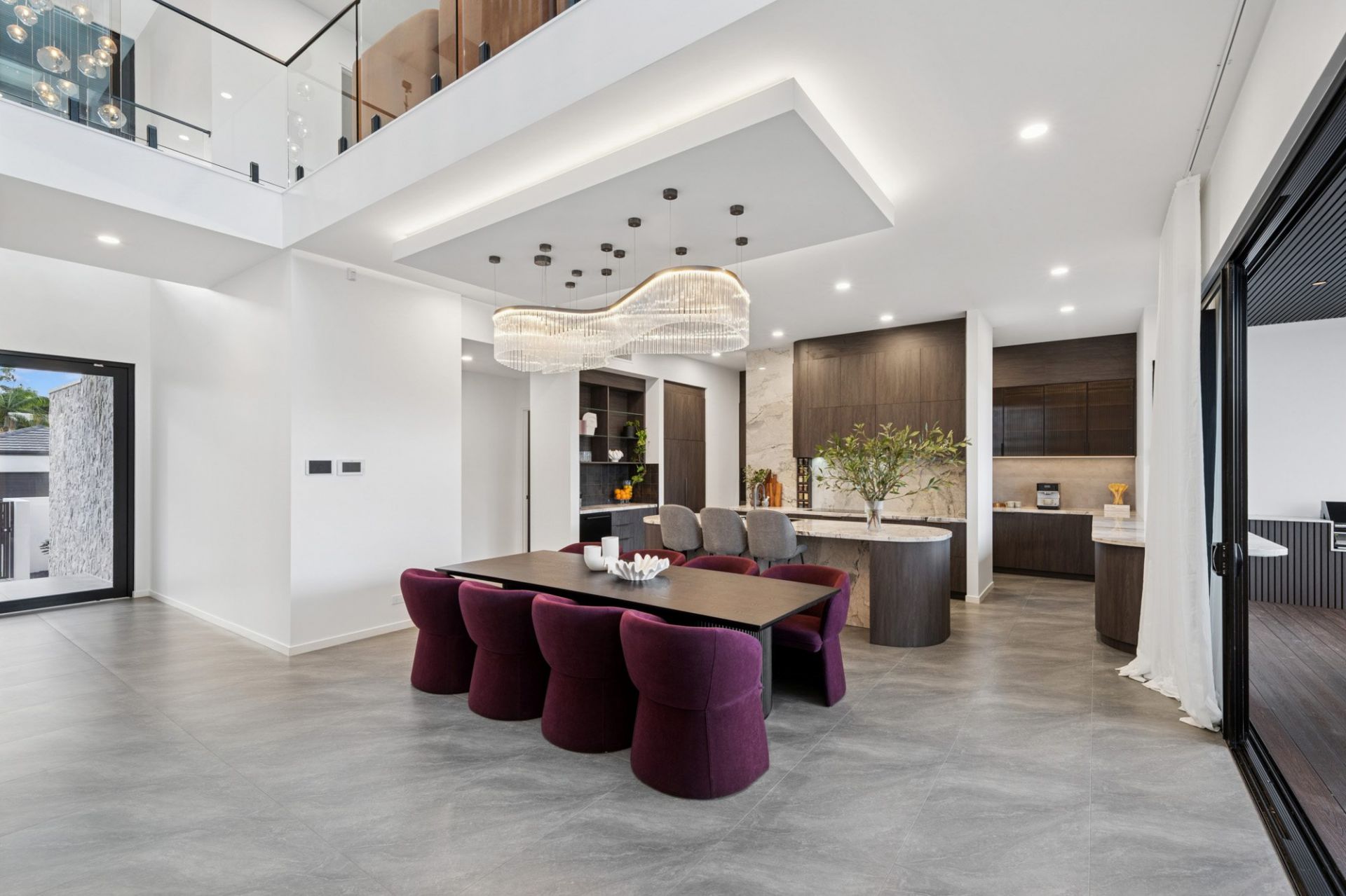 The open-plan interiors have been crafted for seamless living and entertaining, combining soft neutral tones with stone, glass, and timber in perfect harmony. The bespoke designer kitchen is a true centerpiece, featuring solid marble benchtops, a custom lighting design with hand-blown pendants, and a full suite of premium European appliances. Its sleek aesthetic and superior functionality make it as impressive for intimate family dinners as it is for large-scale entertaining. With a fully equipped juice bar and separate fridge drawer & commercial grade ice maker provide the ultimate experience.