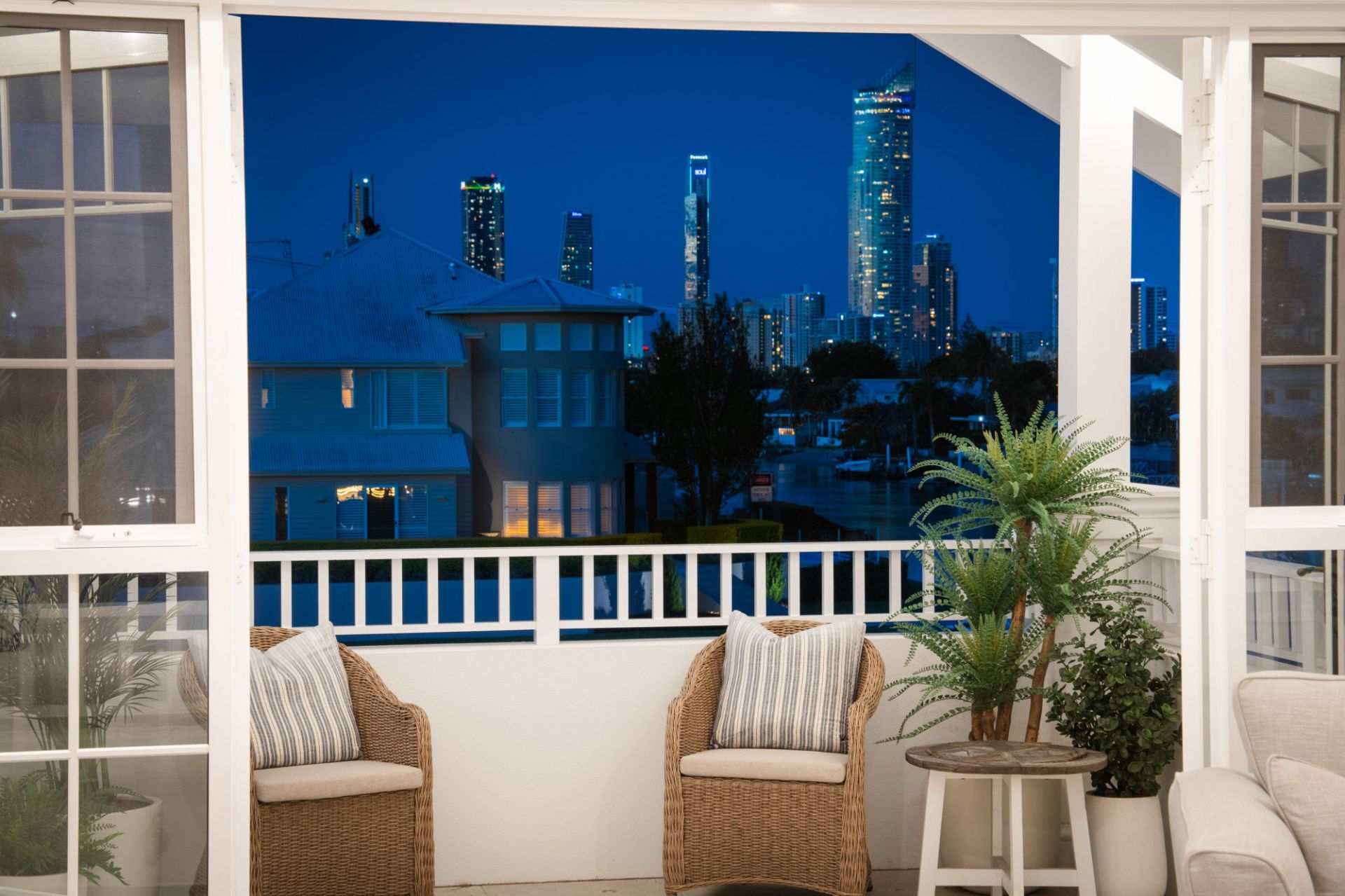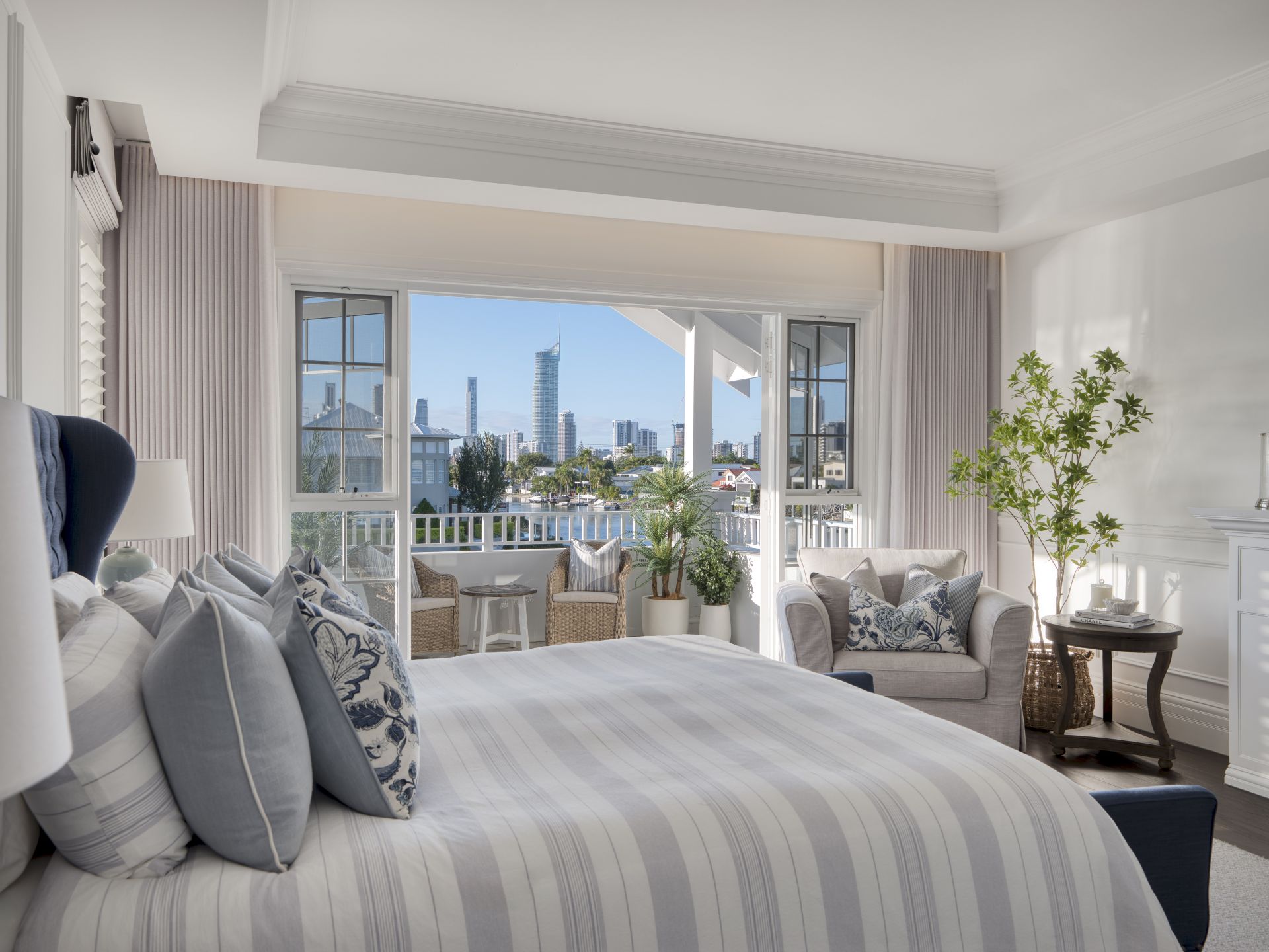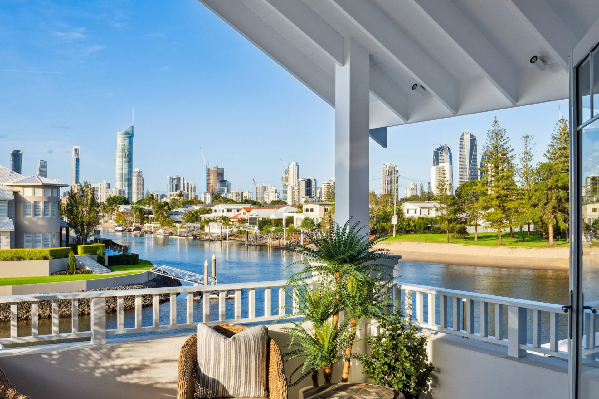 In the heart of Broadbeach Waters' most prestigious enclave, where wide waterways meet the glittering city skyline, this newly completed north-to-water Hamptons-inspired residence captures the essence of timeless elegance and coastal sophistication.