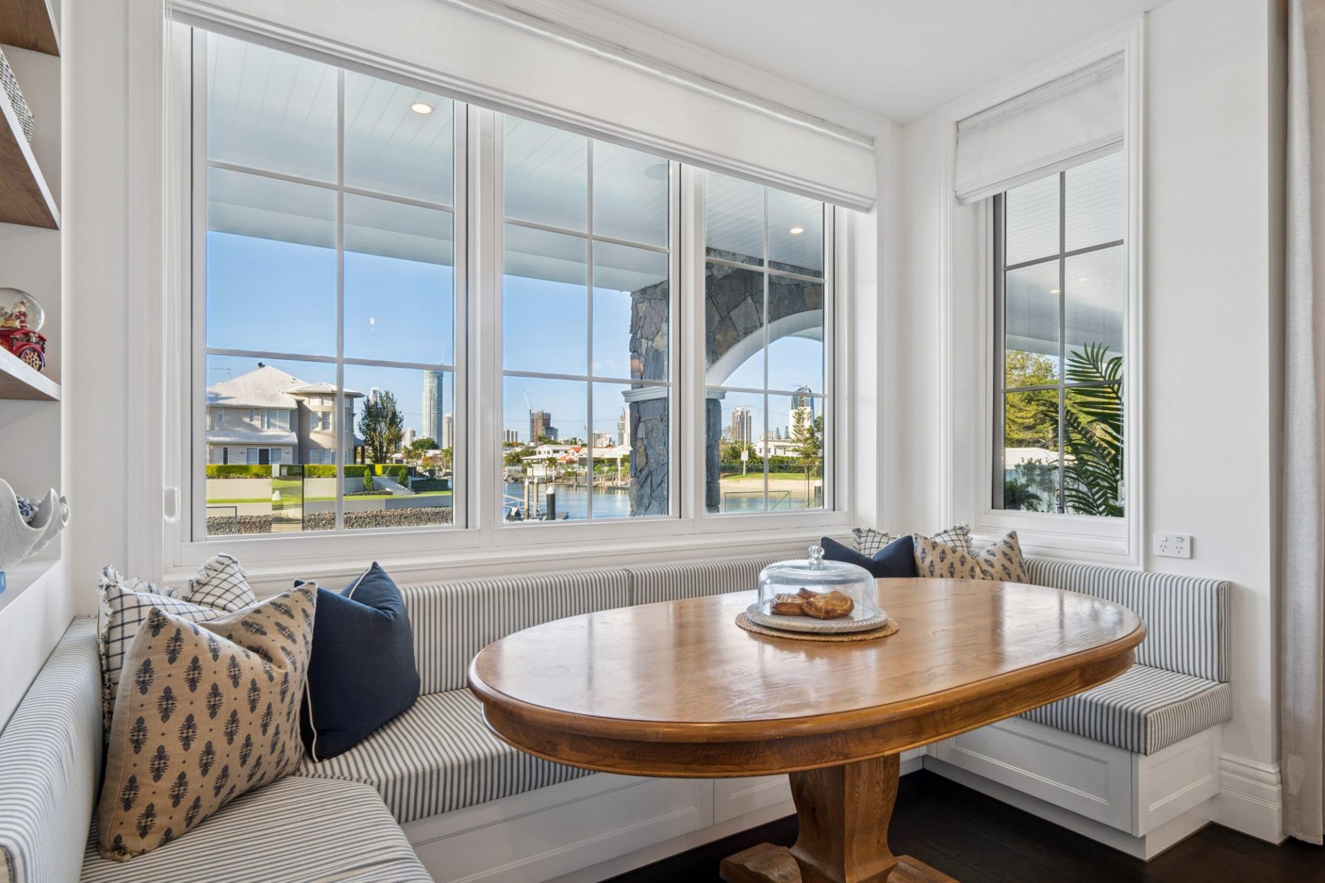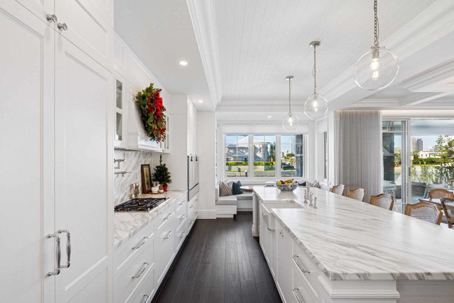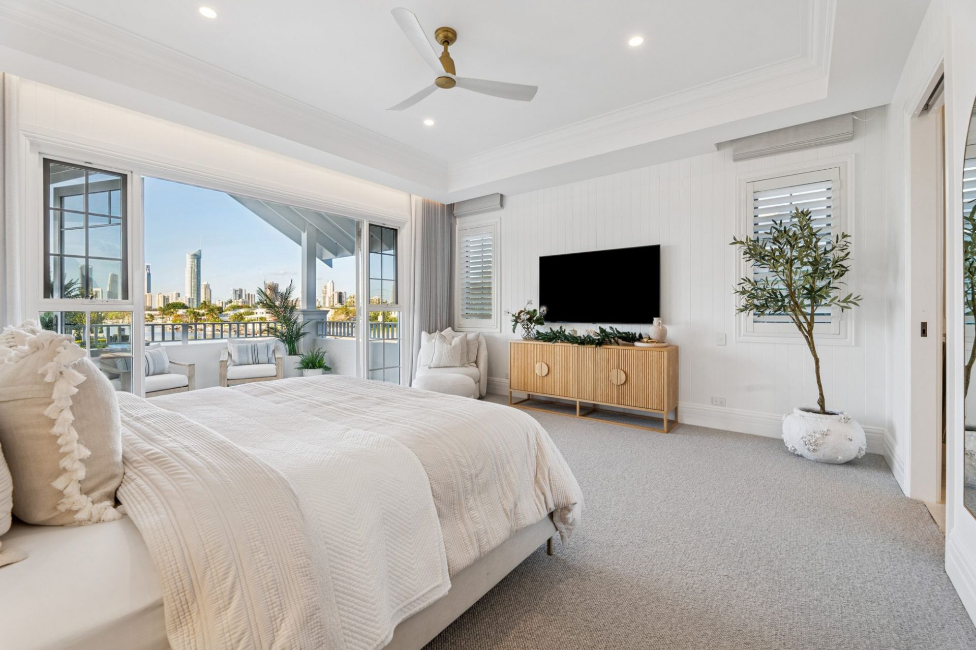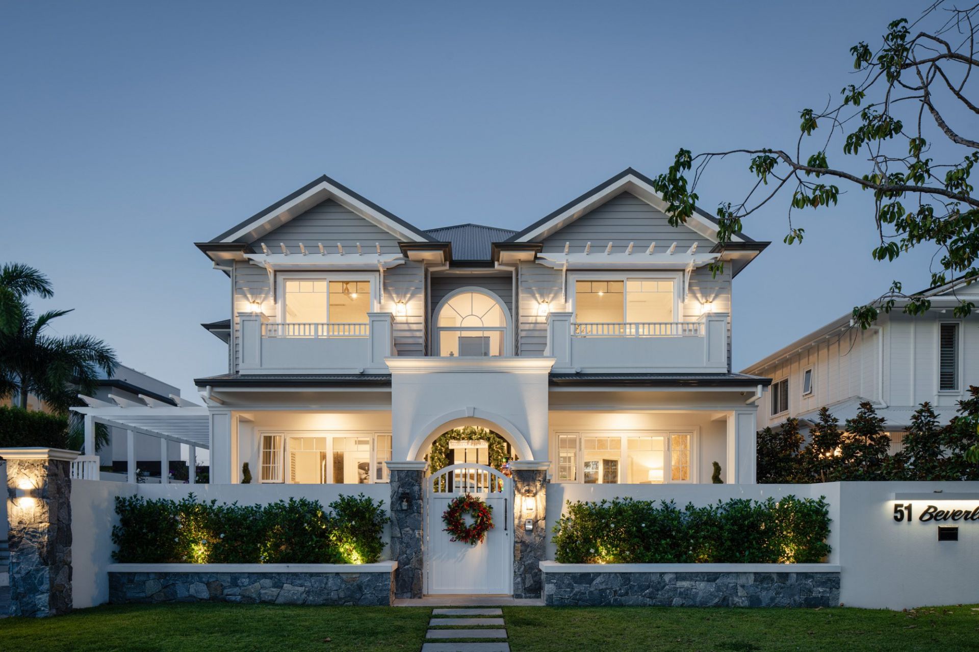 In the heart of Broadbeach Waters' most prestigious enclave, where wide waterways meet the glittering city skyline, this newly completed north-to-water Hamptons-inspired residence captures the essence of timeless elegance and coastal sophistication.