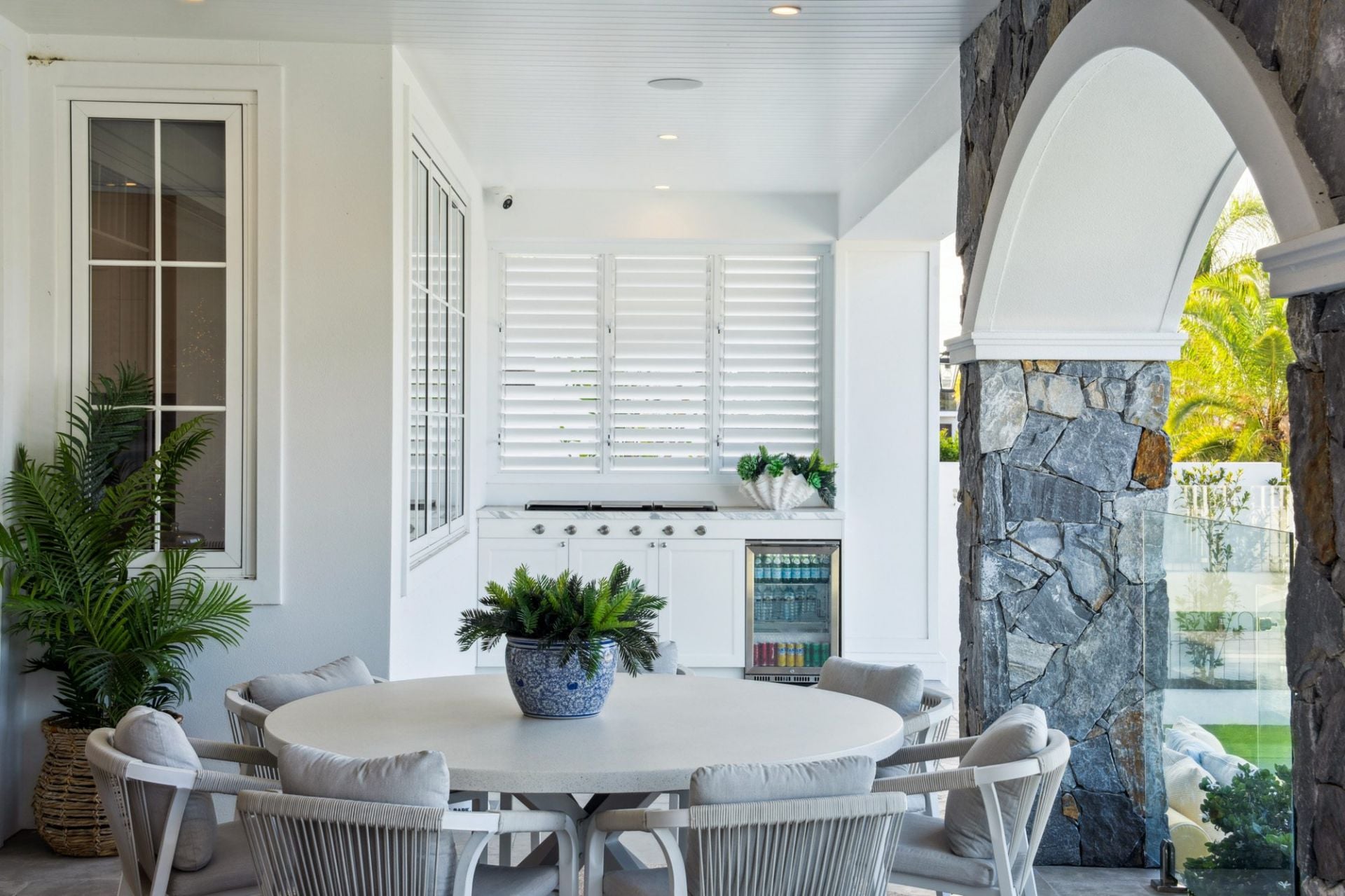 • Covered alfresco area with built-in BBQ kitchen, stone feature archway, built-in bench seating, and captivating skyline views