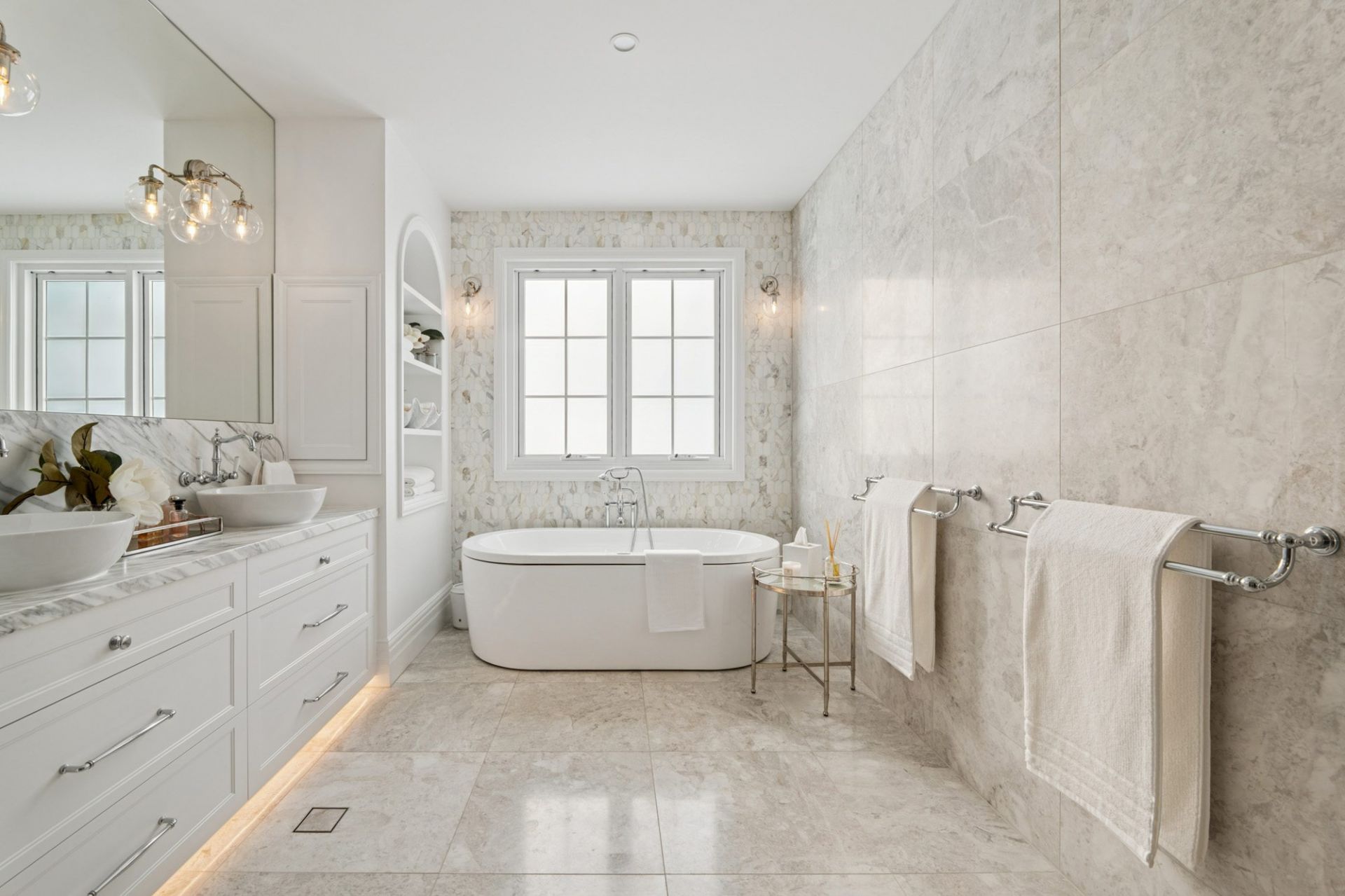 • Master ensuite detailed with CDK Calacatta Marble benchtops, White Tundra Marble and Calacatta Gold honed tiles, and Ian K. Fowler feature lighting