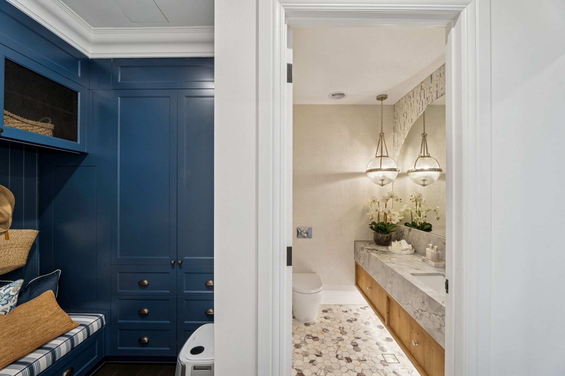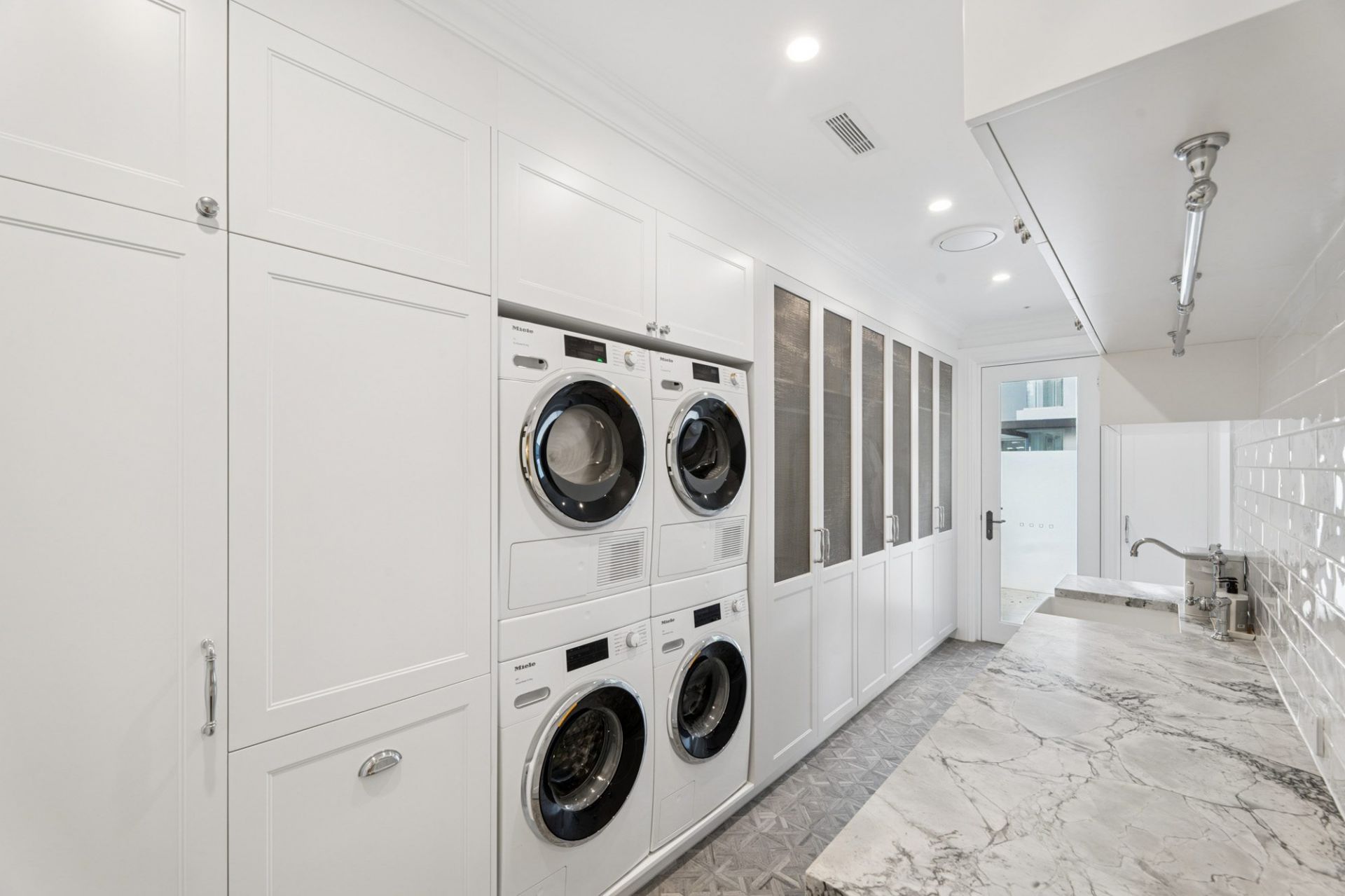 • Oversized laundry with bespoke cabinetry and upper-level laundry chute