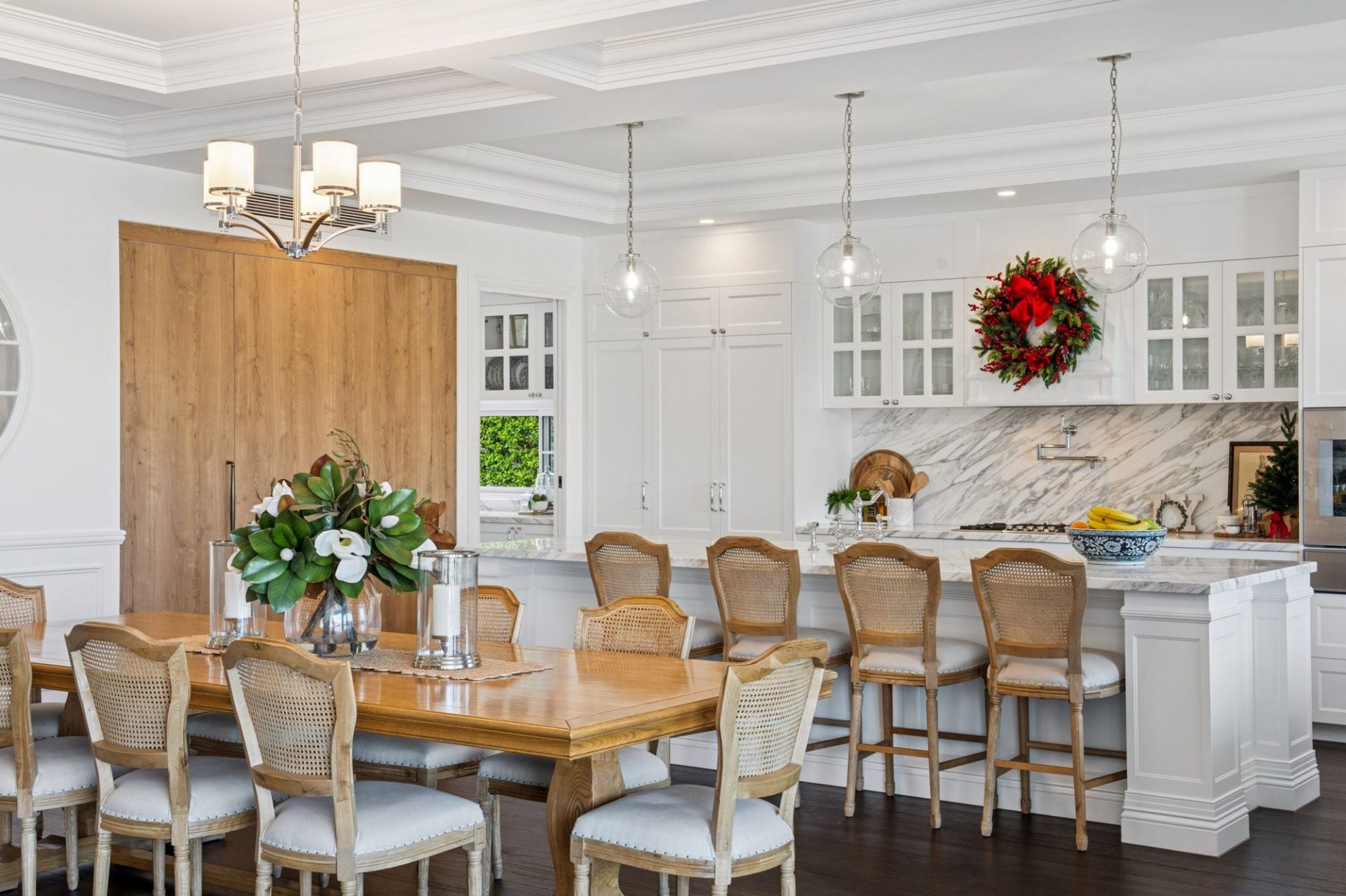 • Coffered ceilings, custom cornice moulding, and wainscoting feature wall panelling