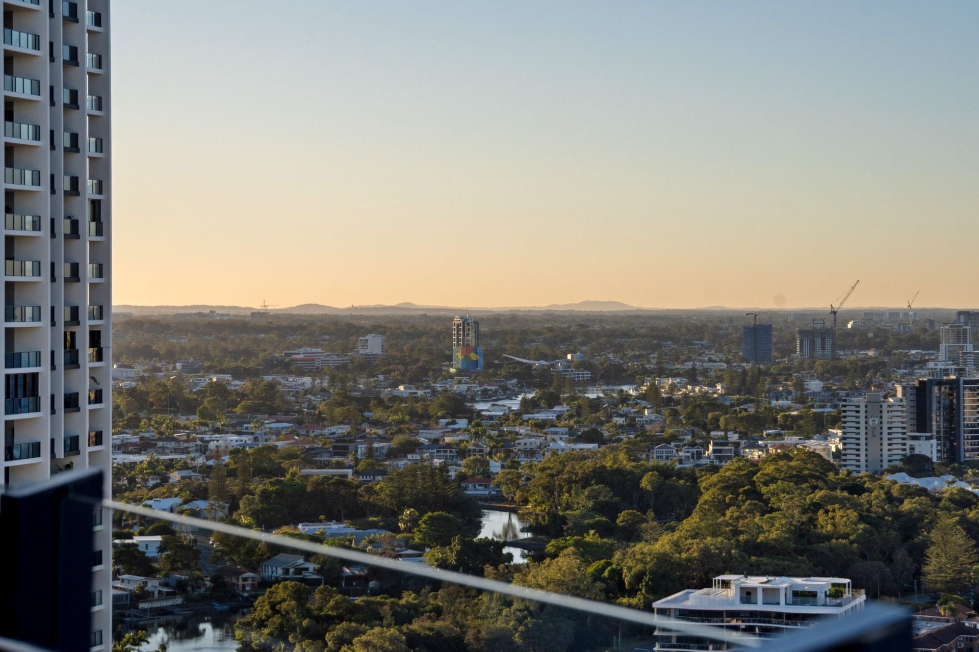 From the moment you step inside, the sense of scale and light is captivating. Floor-to-ceiling glass panels frame a visual masterpiece - where the turquoise waters of the Pacific Ocean stretch endlessly to the horizon, golden sands fringe the coastline below, and the vibrant Broadbeach skyline pulses with life. Turn your gaze inland, and a completely different landscape unfolds: a sea of lush green hinterland hills that glow gold at sunset and offer a tranquil contrast to the oceanfront vibrancy.