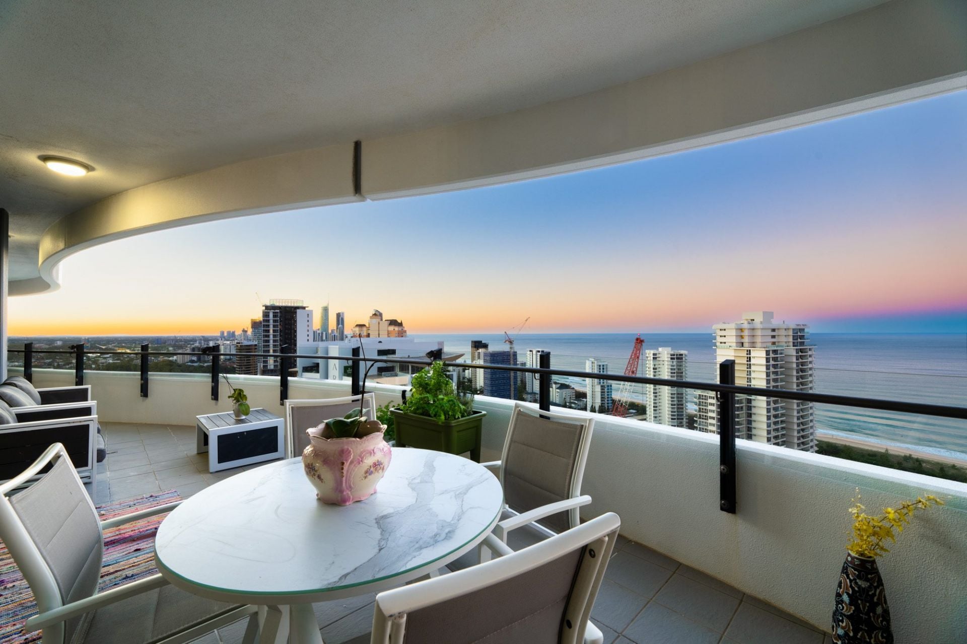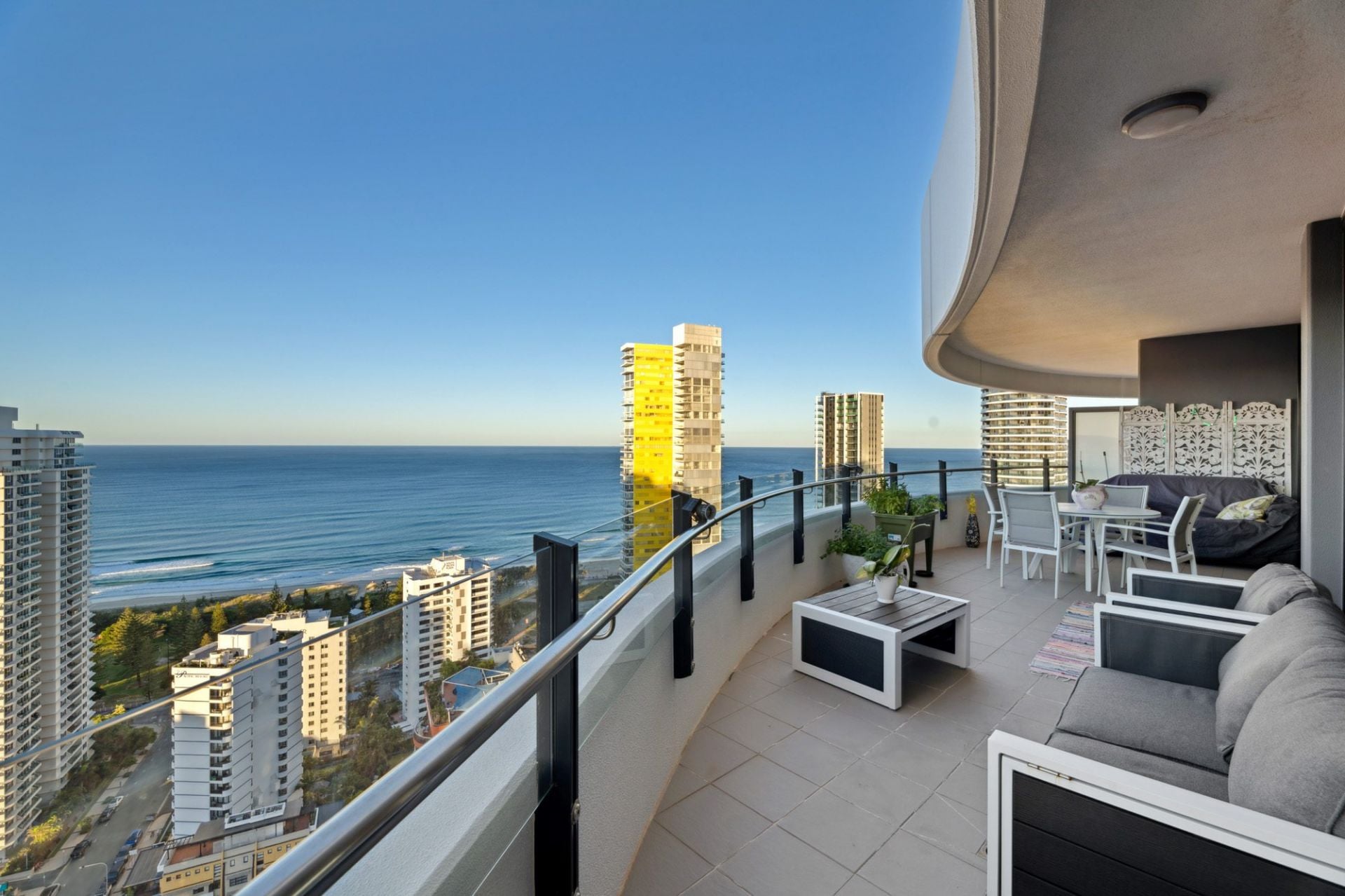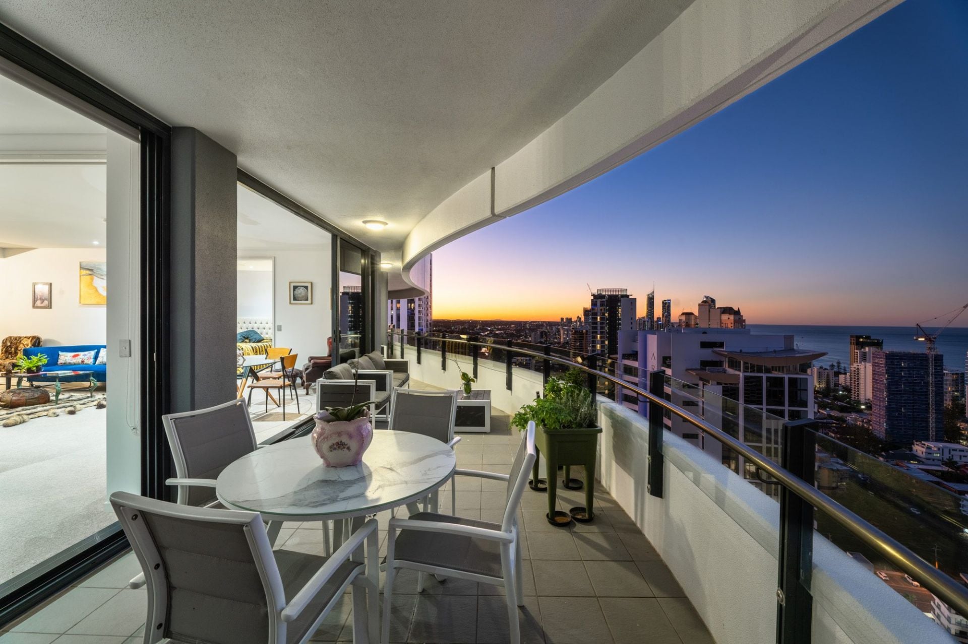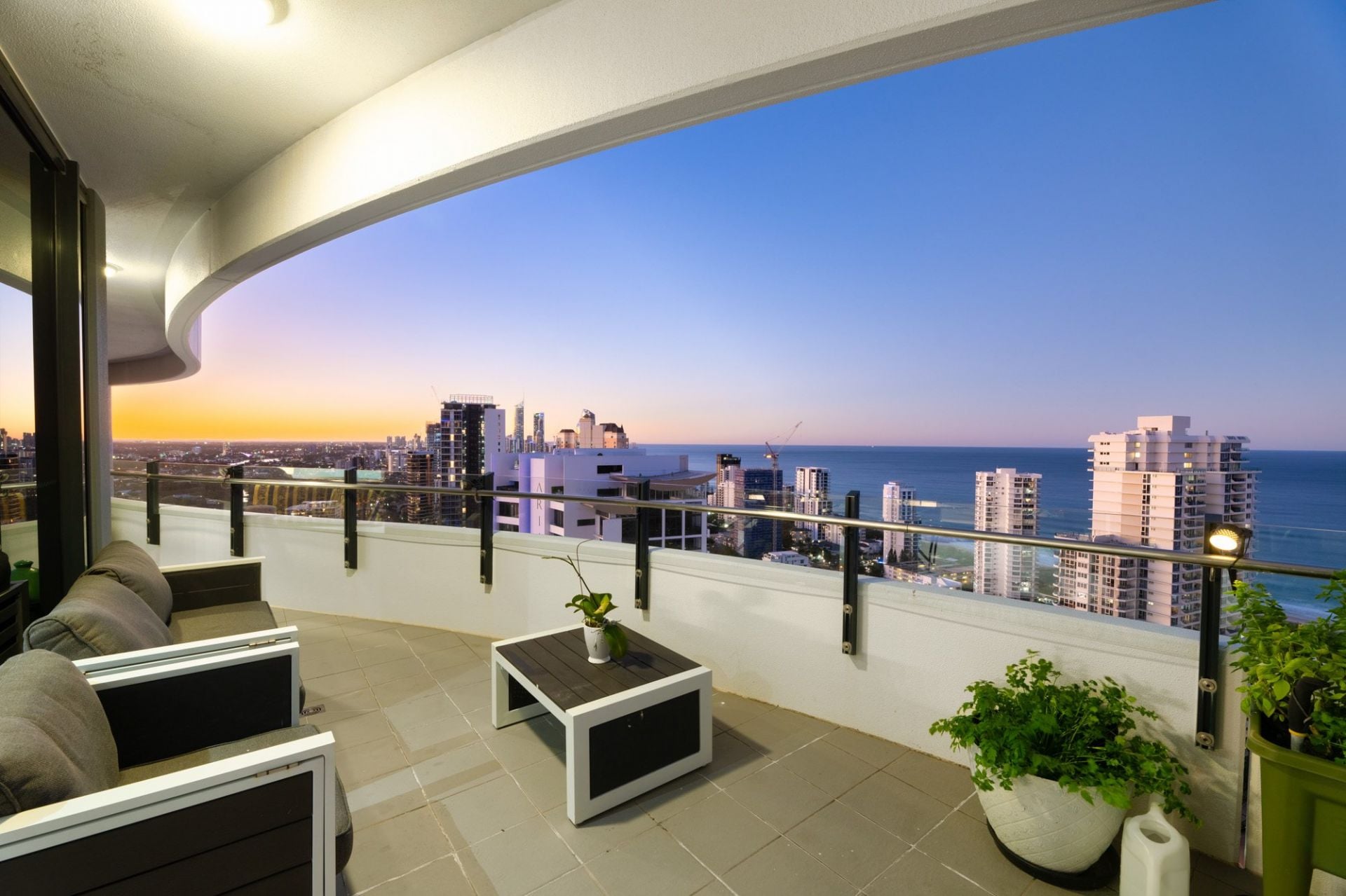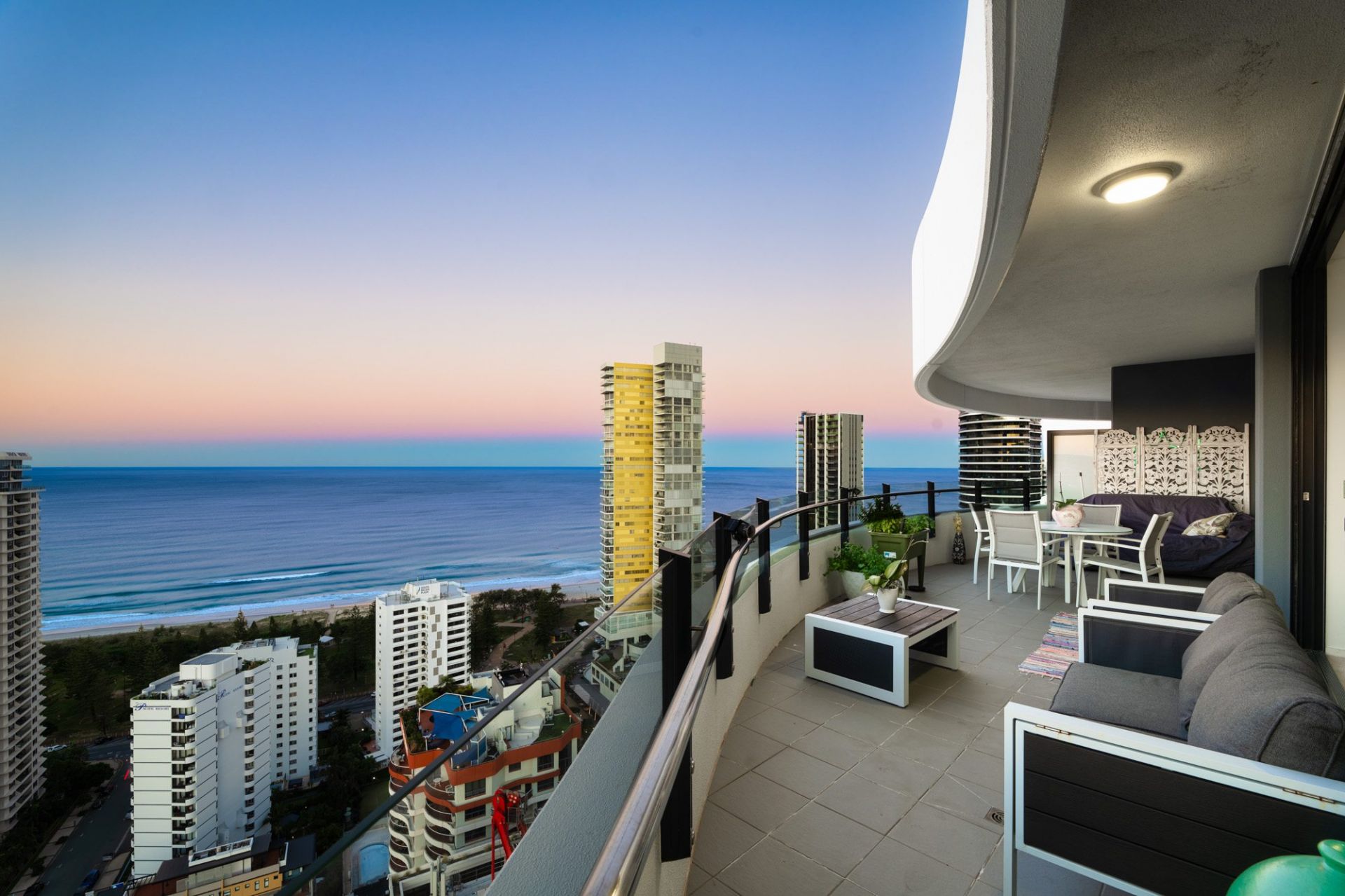 Whether you're enjoying your morning coffee as the sun rises over the ocean, or toasting the day with a glass of wine as the city lights dance below, the sweeping wraparound balcony provides the ultimate vantage point to appreciate the Gold Coast in all its beauty. These are views that transform throughout the day and night, offering an ever-changing backdrop of light, colour, and atmosphere - a constant reminder that you've arrived at something truly special.