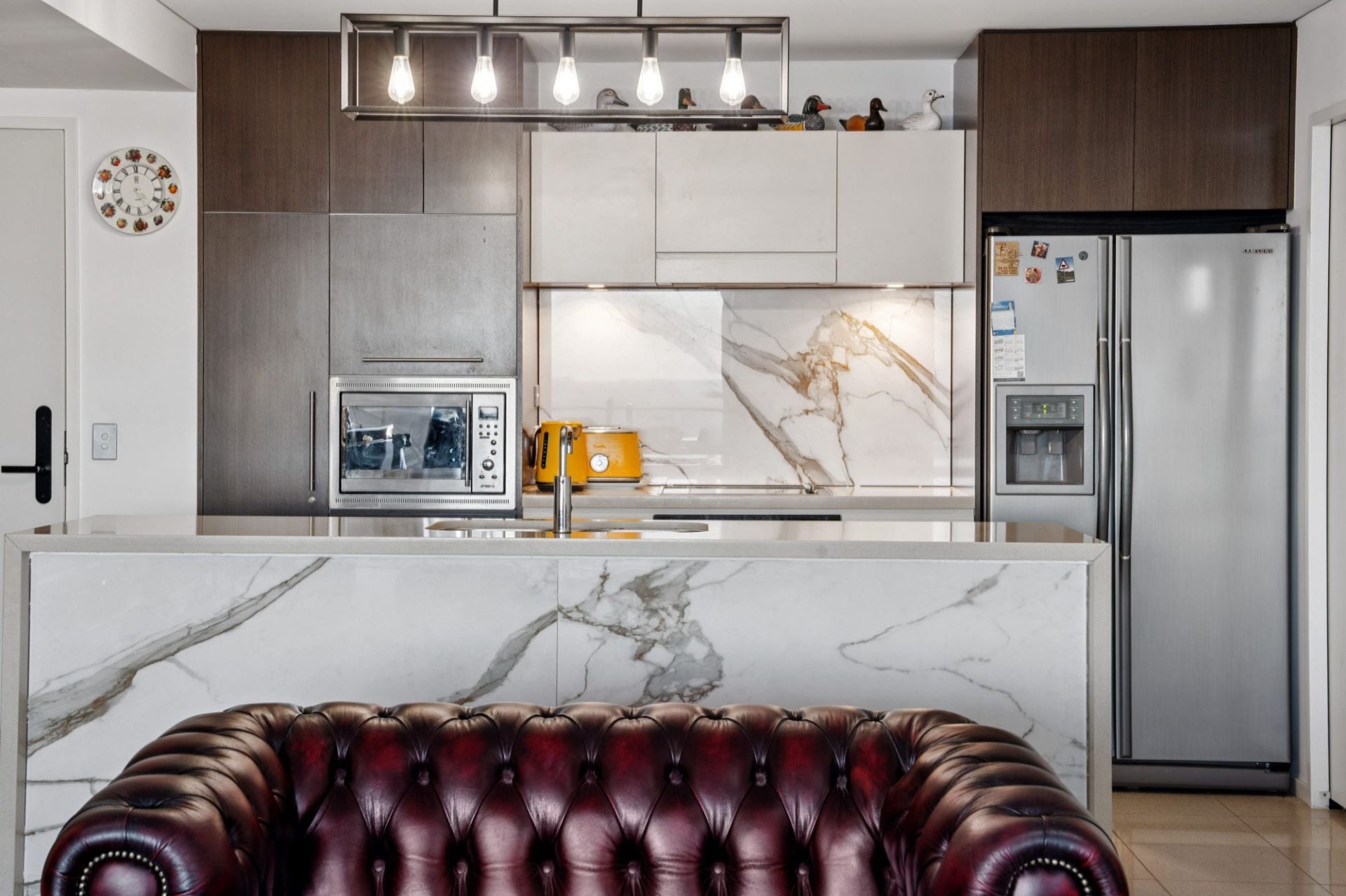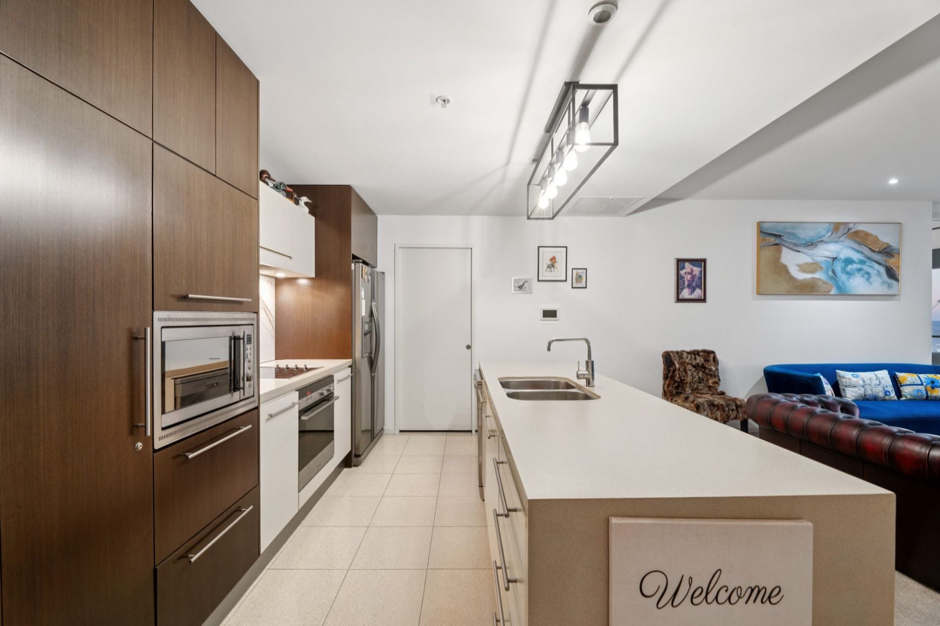 Inside, the open-plan living and dining zones have been designed to make the most of the apartment's elevated position. Natural light floods the space, creating a warm and inviting atmosphere that perfectly complements the modern kitchen, fitted with stone benchtops, quality appliances, and generous storage.