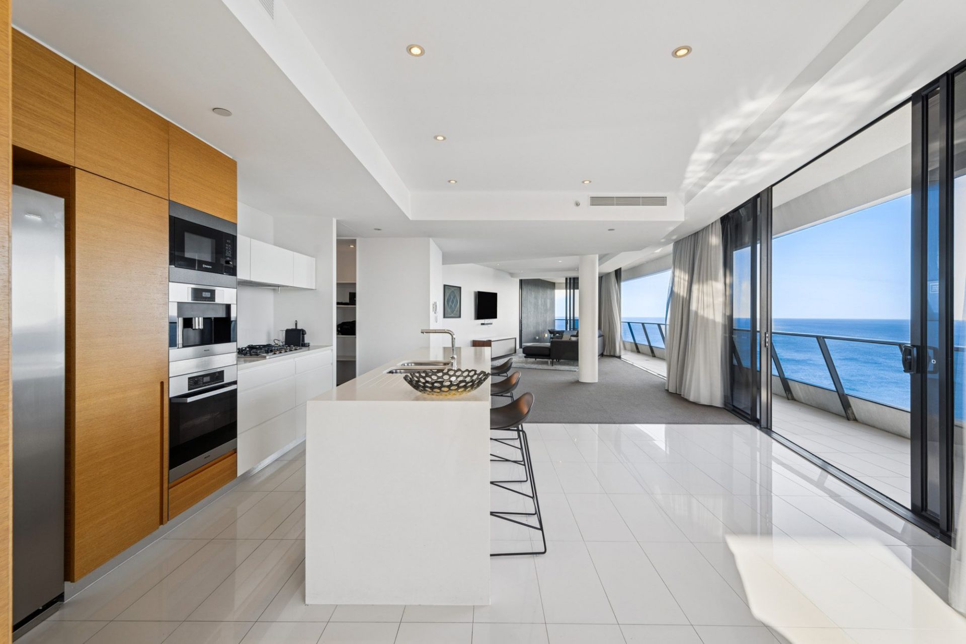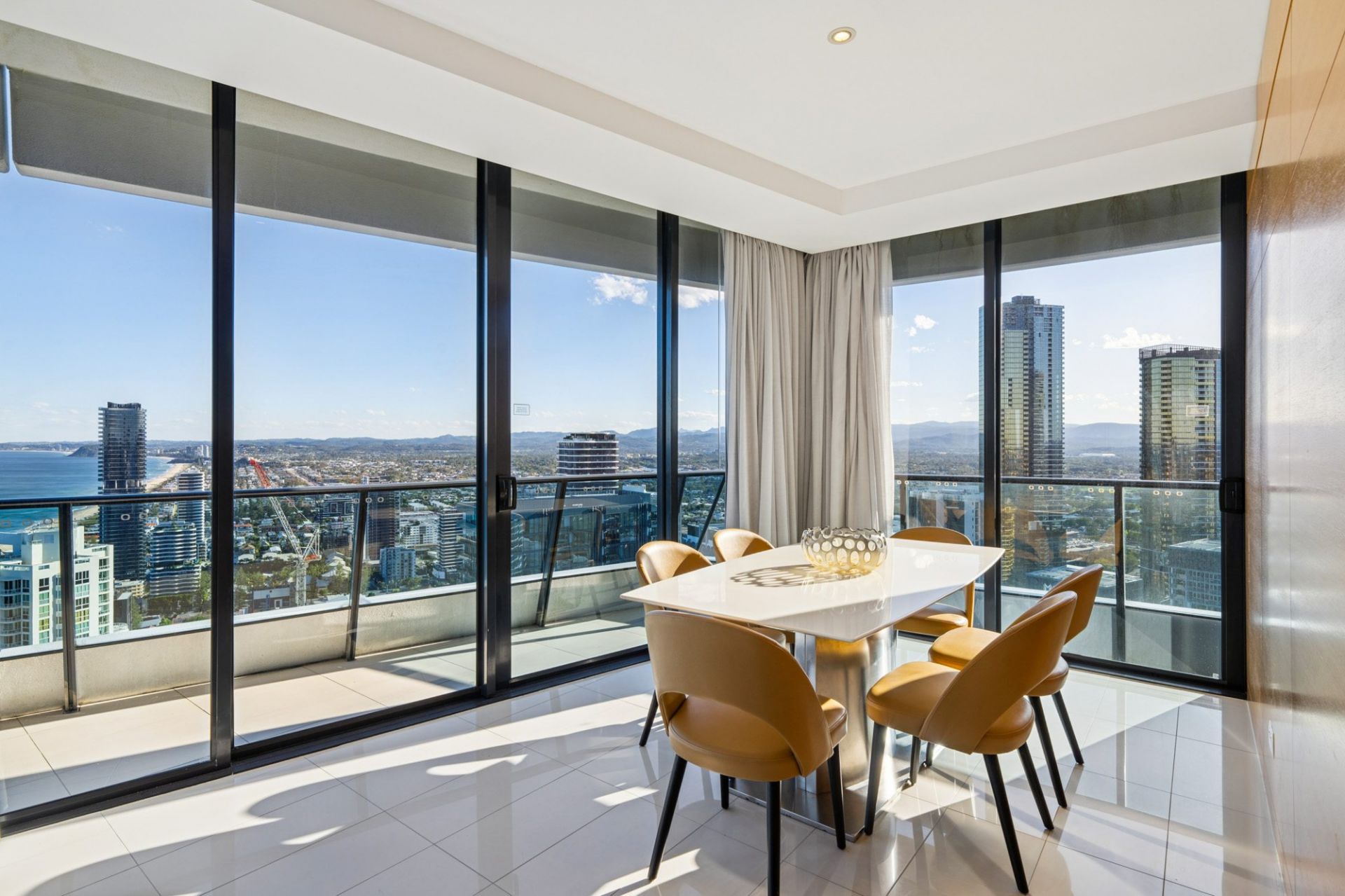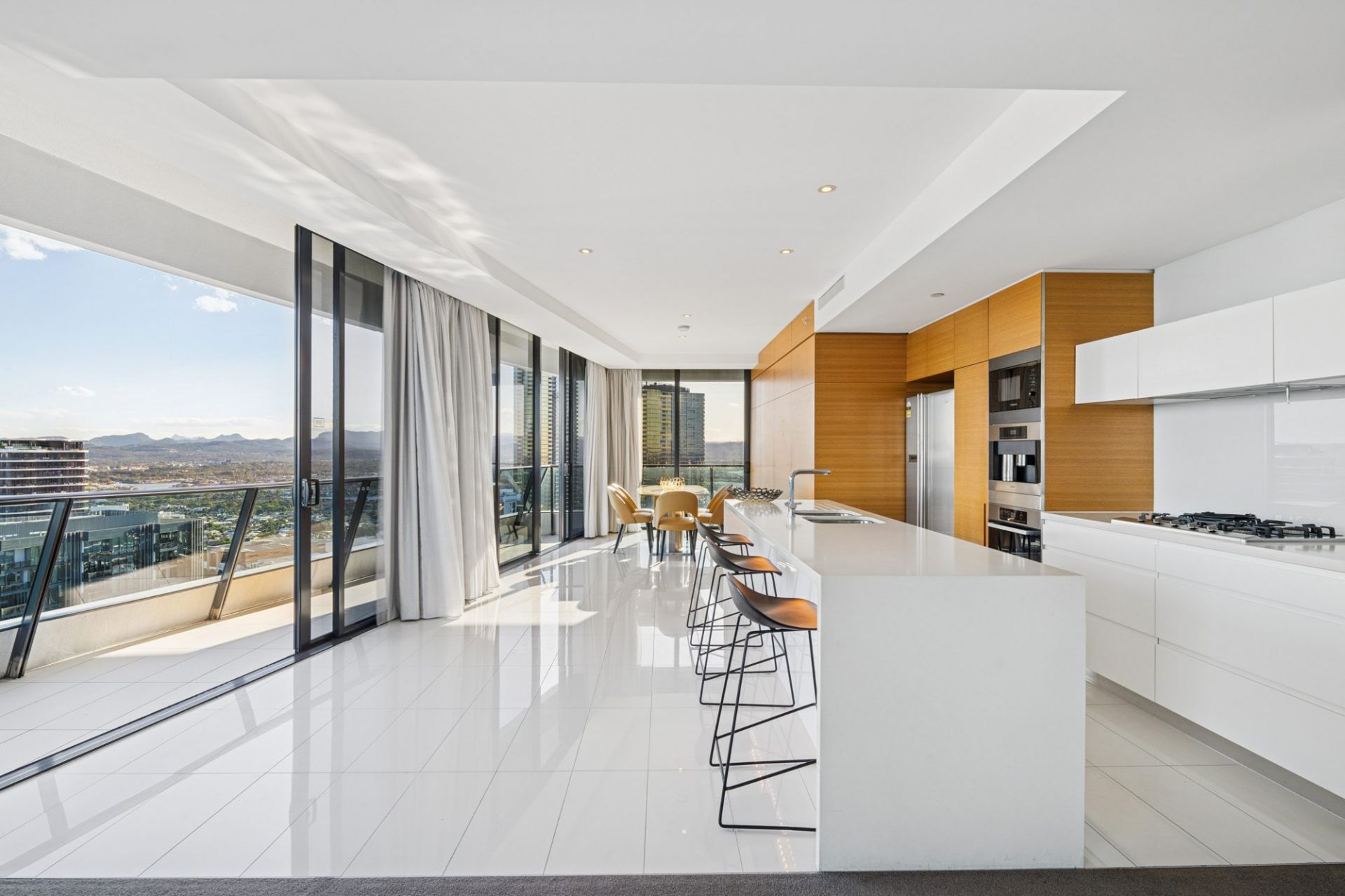 • Spacious open-plan living and dining areas, illuminated by natural light, with walls of glass framing panoramic coastal and city views.