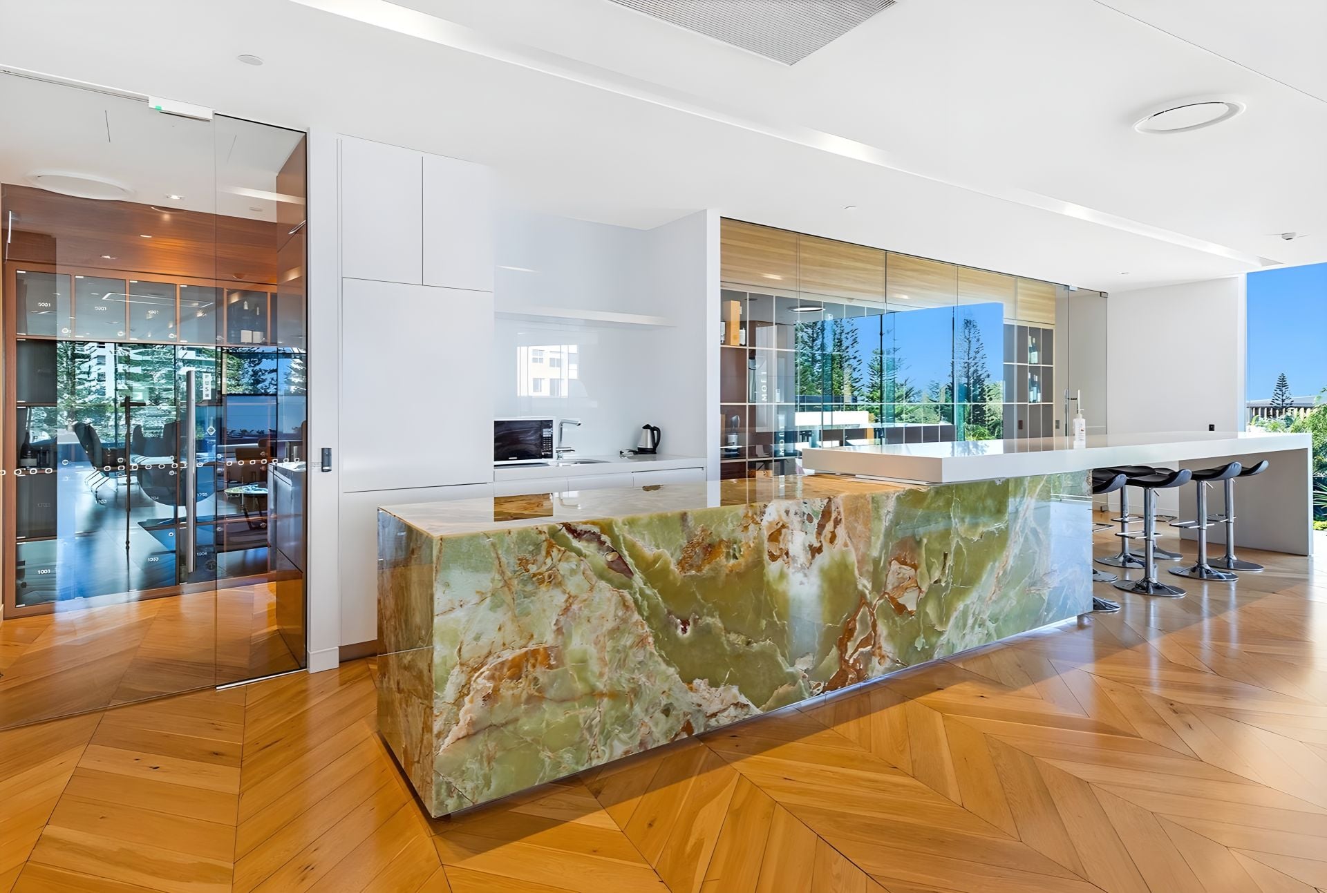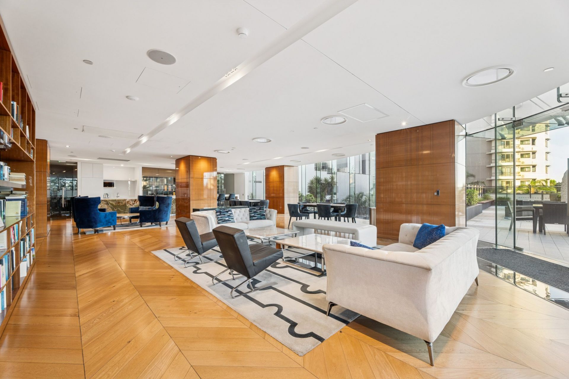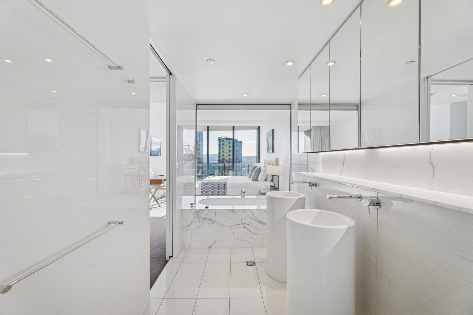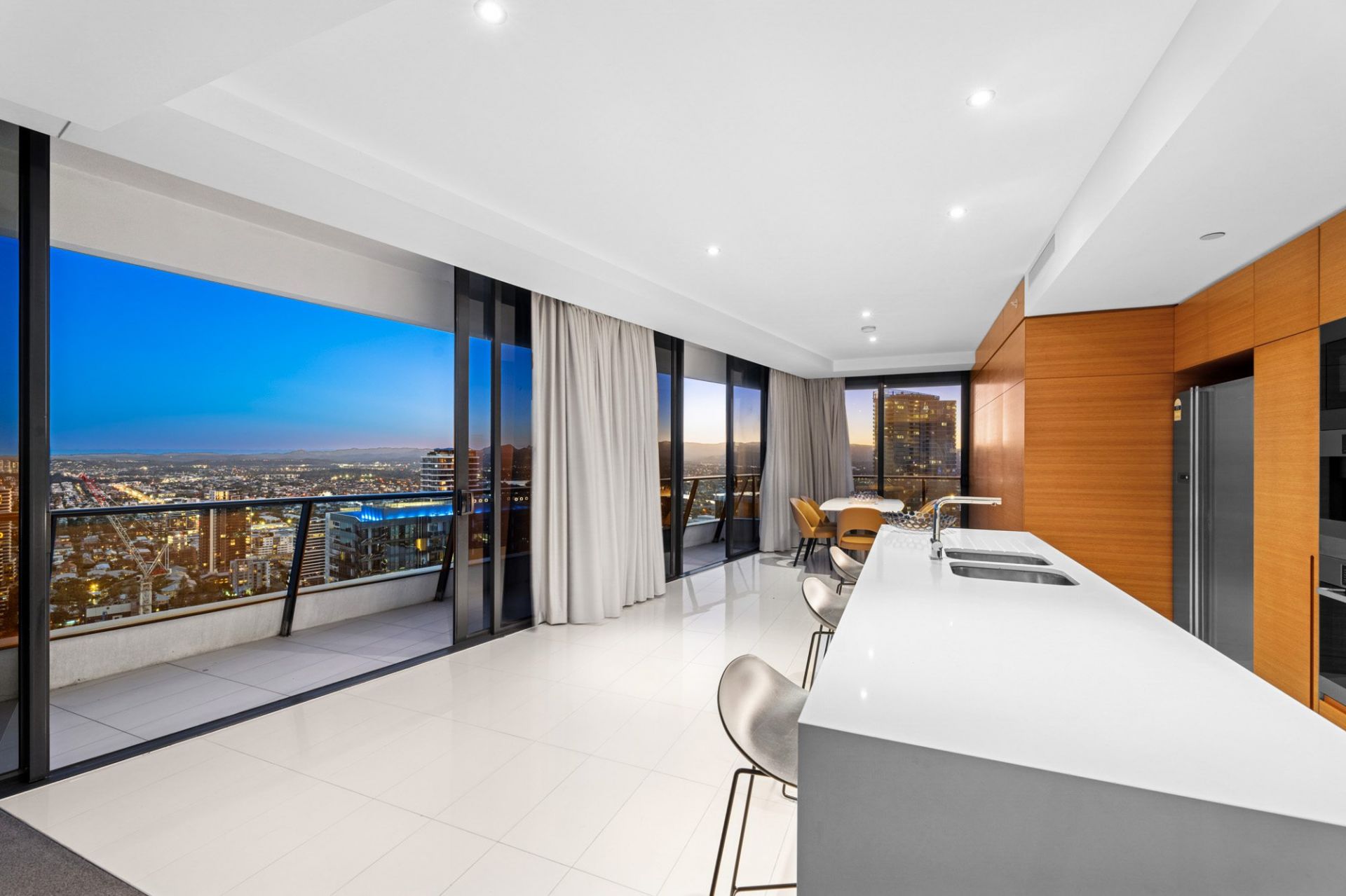 • Spacious open-plan living and dining areas, illuminated by natural light, with walls of glass framing panoramic coastal and city views.