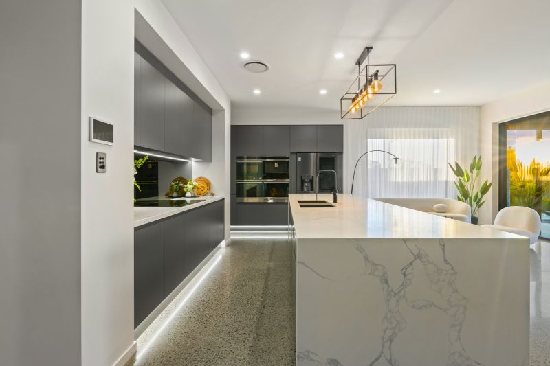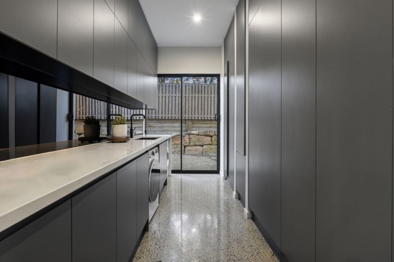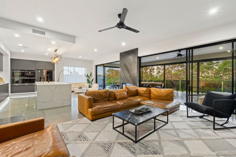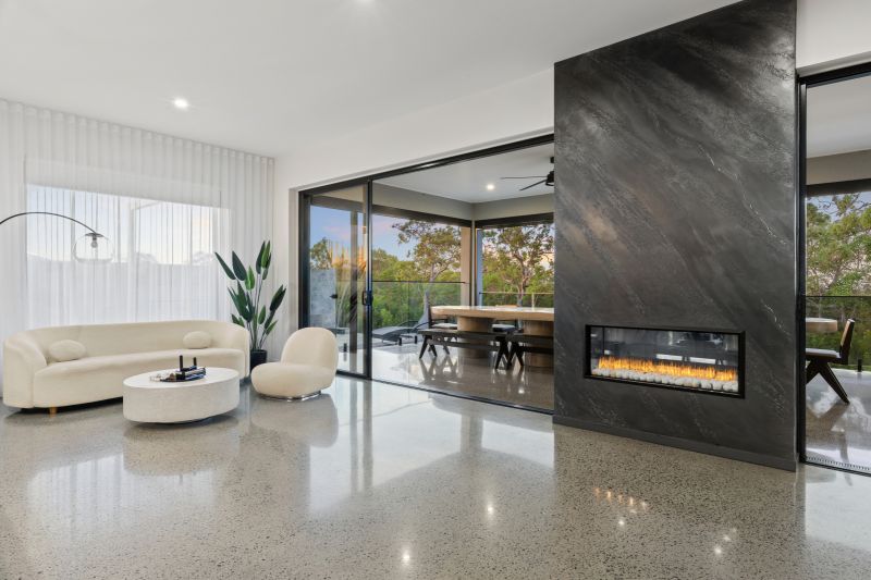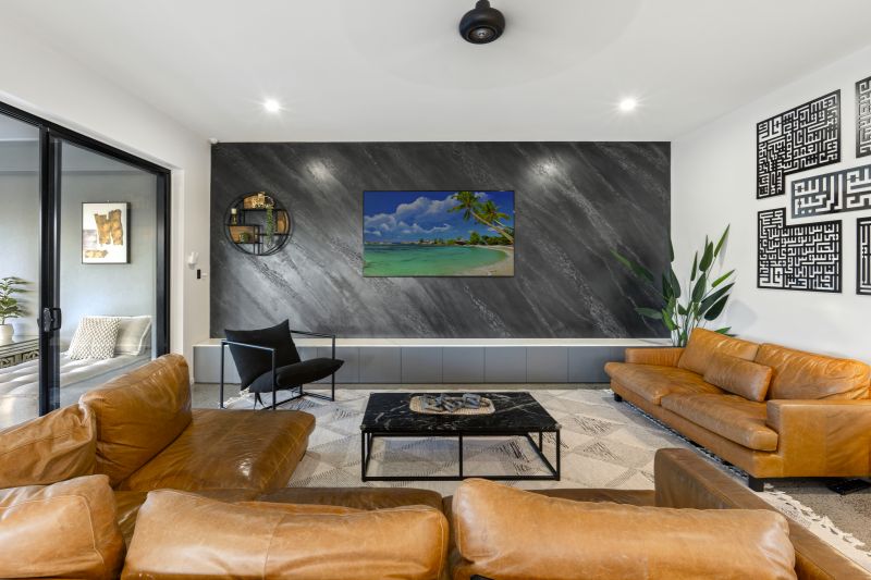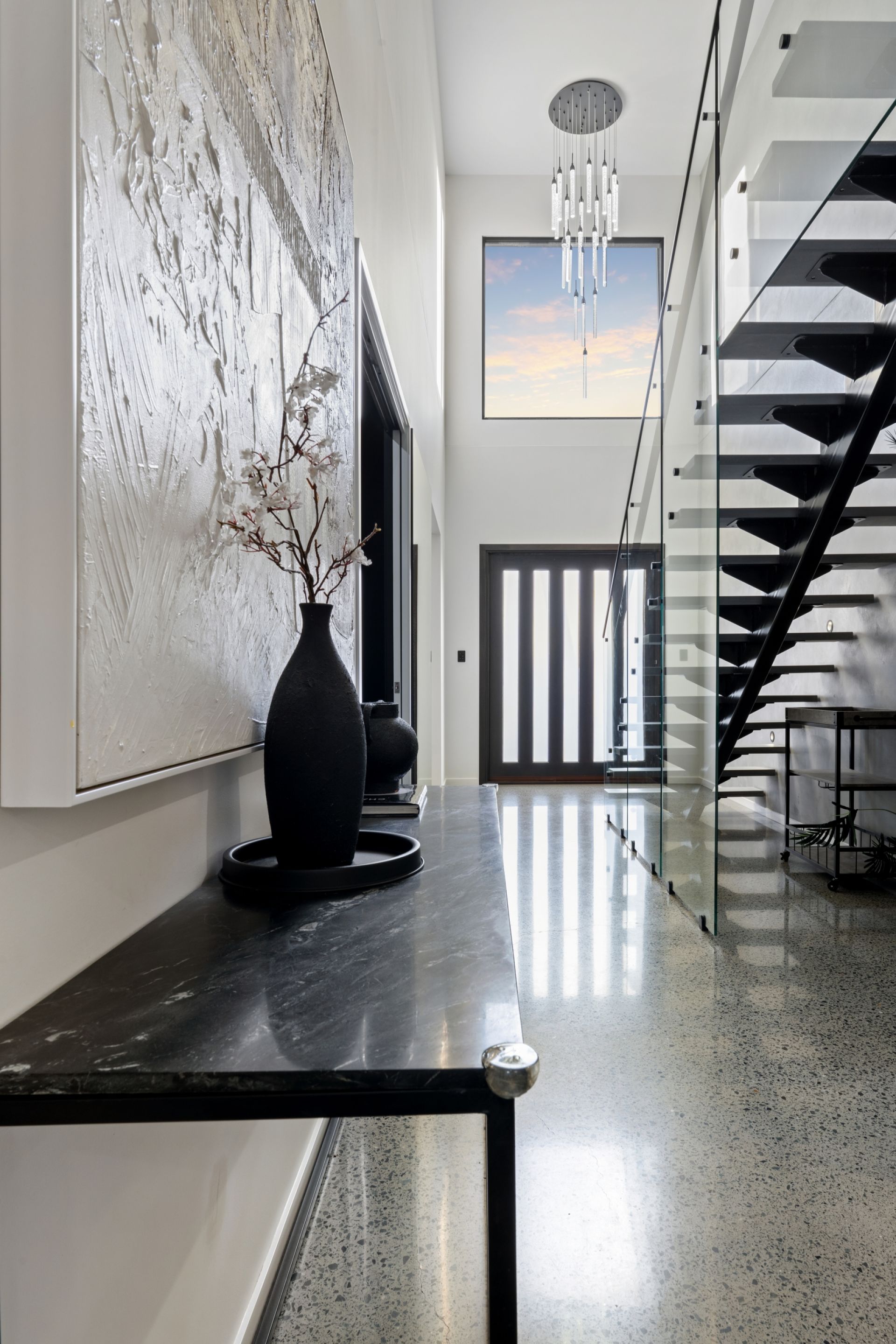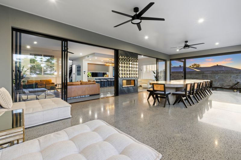 Polished concrete floors, Venetian plaster, and warm vertical timber accents set a sophisticated tone, while integrated LED lighting enhances the home's modern aesthetic. Multiple living zones - including a cinema, gym, home office, and children's retreat - ensure the residence adapts effortlessly to family life.