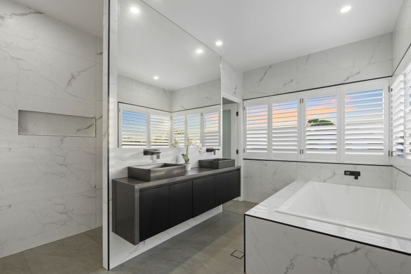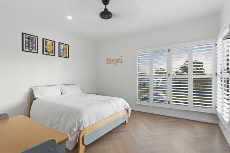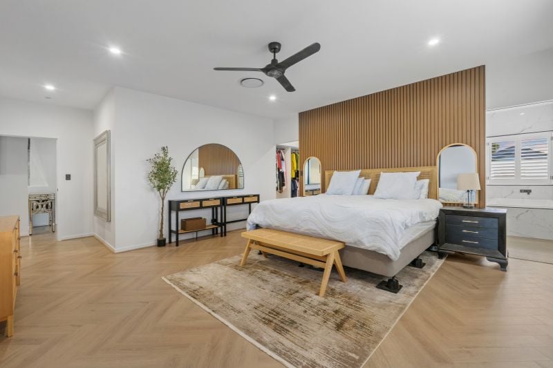 The master suite is a private escape in itself, offering dual walk-in robes, a stunning ensuite with freestanding tub, and direct access to a tranquil upper-level retreat. Every space reflects attention to detail, with ducted air-conditioning, ceiling fans, CCTV security, and bespoke inclusions elevating daily comfort.
