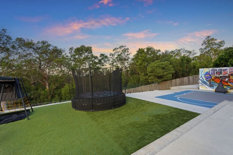 Outdoors, the sense of resort-style living continues. A fully covered alfresco terrace with polished concrete floors, double-sided fireplace, electric blinds, and outdoor kitchen overlooks a heated pool with waterfall edge. The property's basketball court, rain shower, and external powder room enhance its appeal as an entertainer's paradise, all secured by electric gates and framed by lush, mature landscaping.