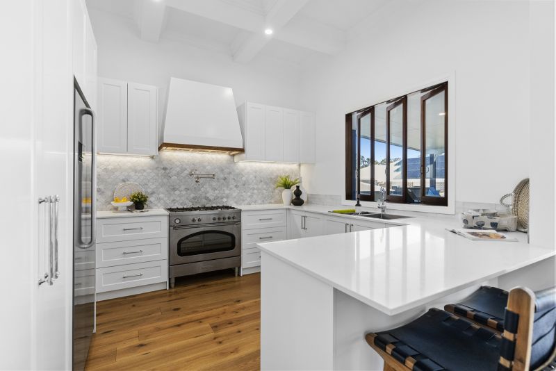 Step inside to discover soaring 3.5m ceilings, engineered hickory timber floors, and open-plan living that flows seamlessly onto the outdoor entertaining decks. The kitchen and living zones connect effortlessly to the sparkling 5m x 2.5m fully tiled plunge pool, framed by a semi-frameless glass fence and Merbau decking with a whitewashed finish - an elegant extension of the home's classic colonial style.