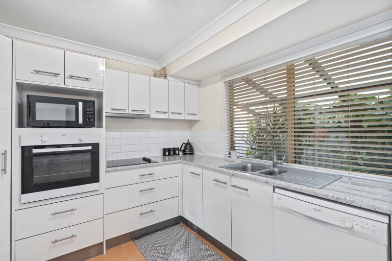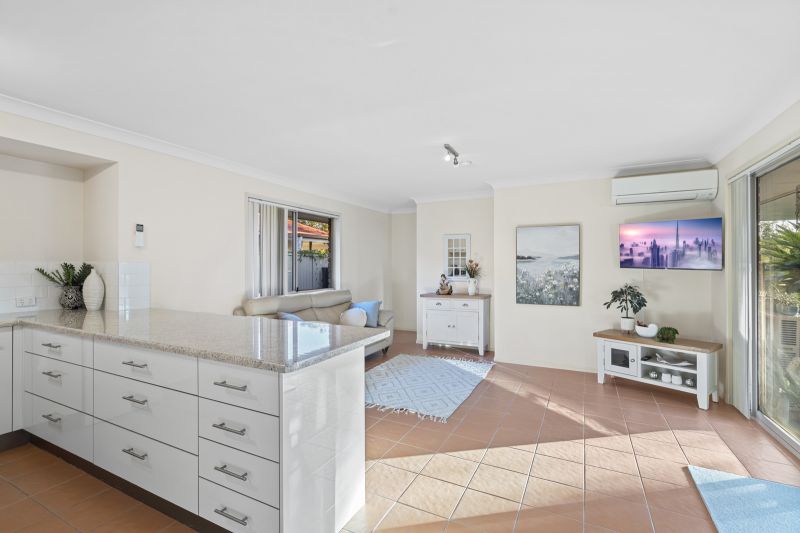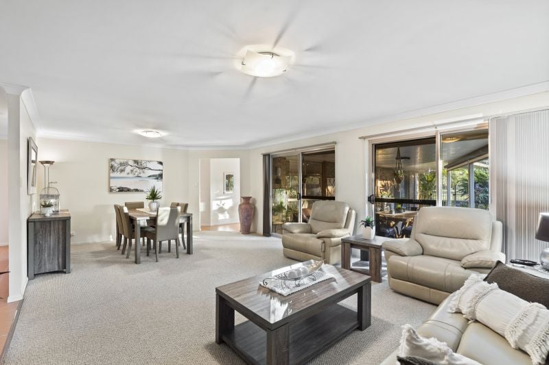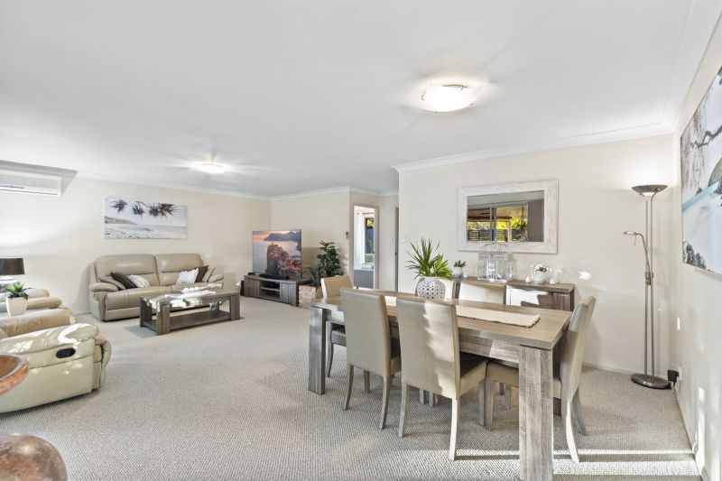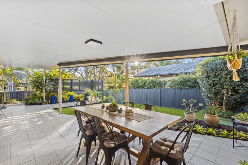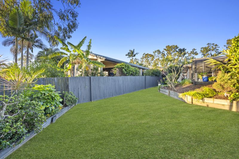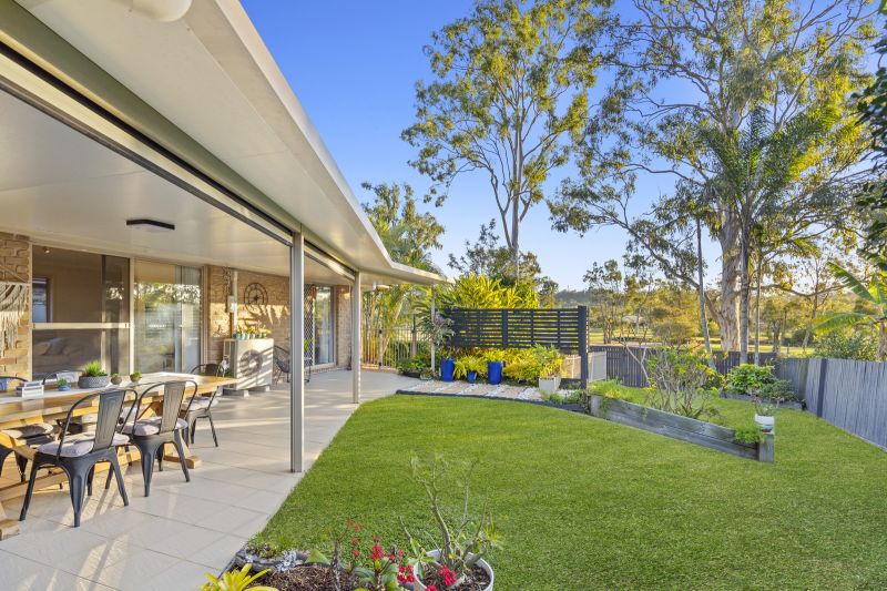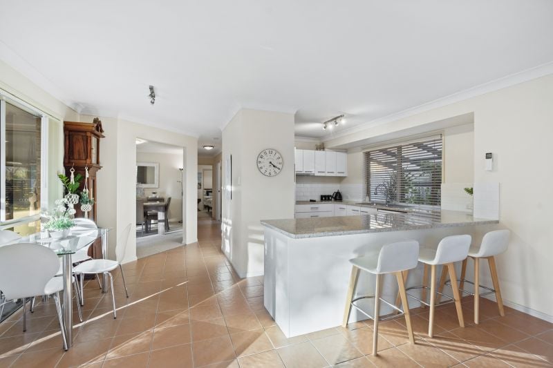 At the heart of this family home is a spacious kitchen, outfitted with ample storage, built-in appliances, and a large granite benchtop. The expansive living and dining area effortlessly extends to a lush garden, framing picturesque views of the Helensvale golf course.