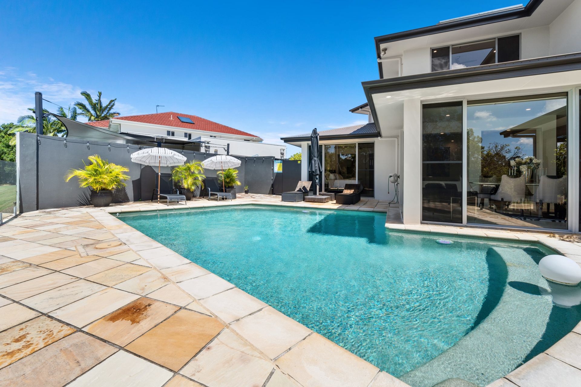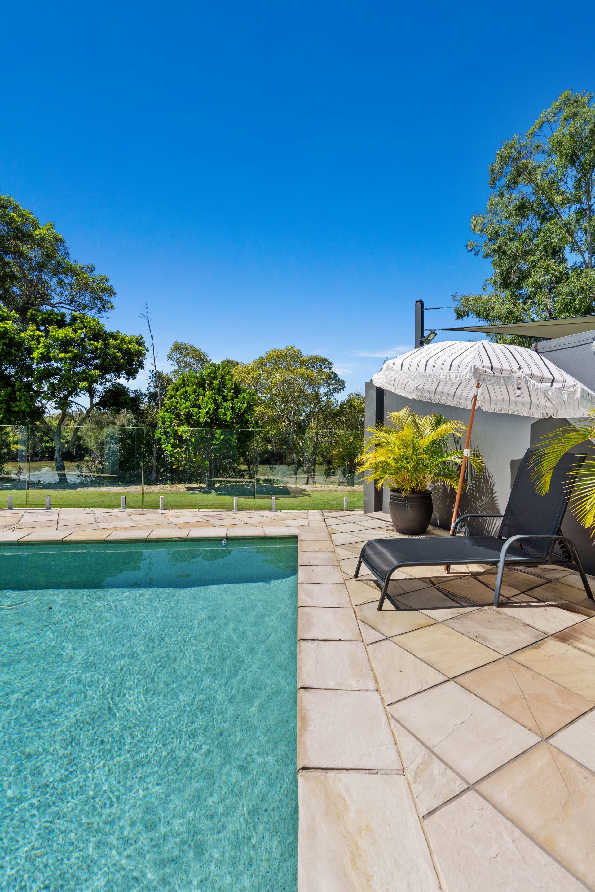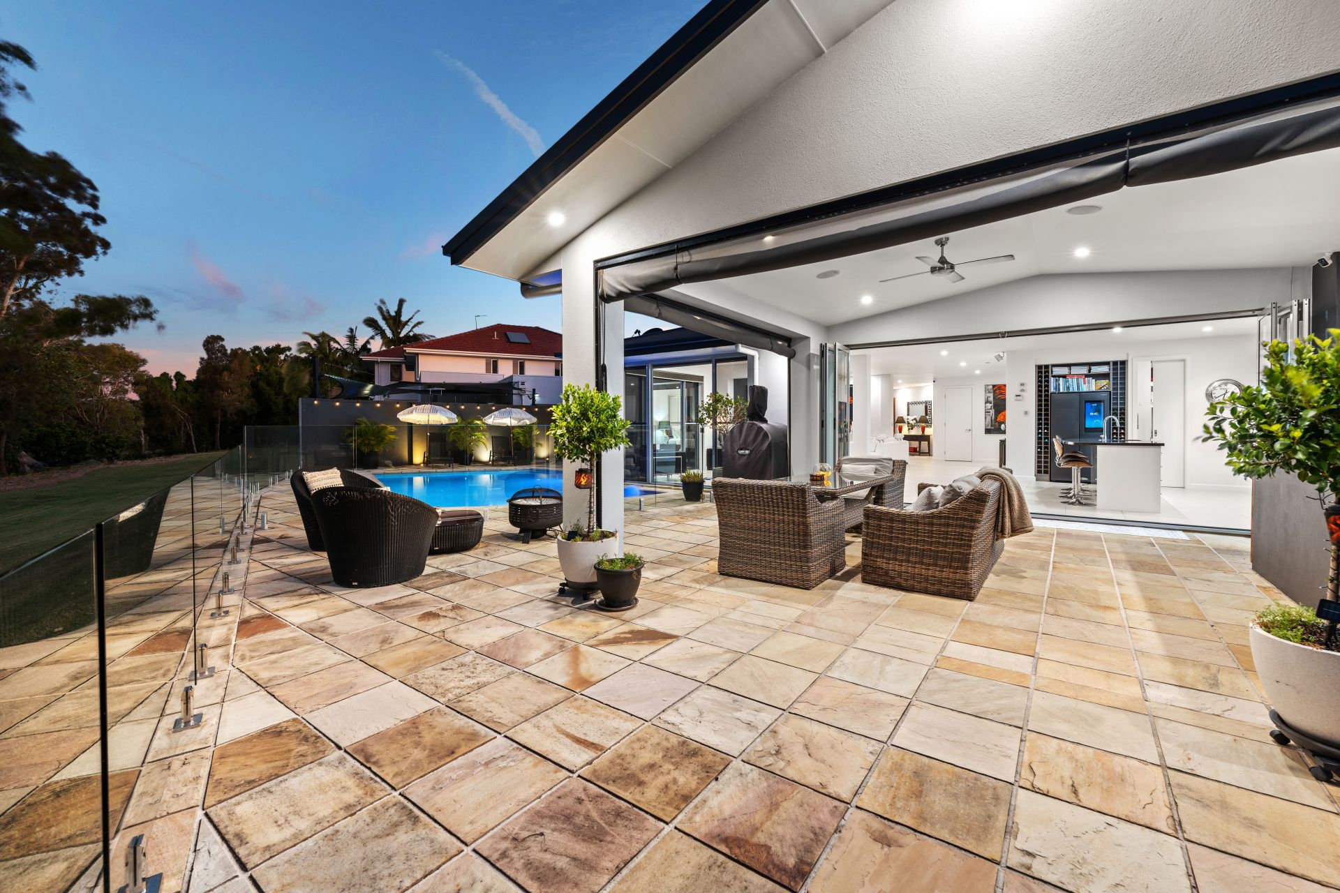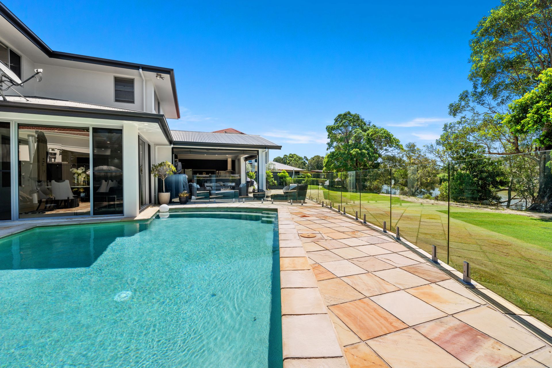 - Expansive open-air terrace adjoins the saltwater pool, both lined with glass fencing