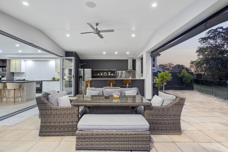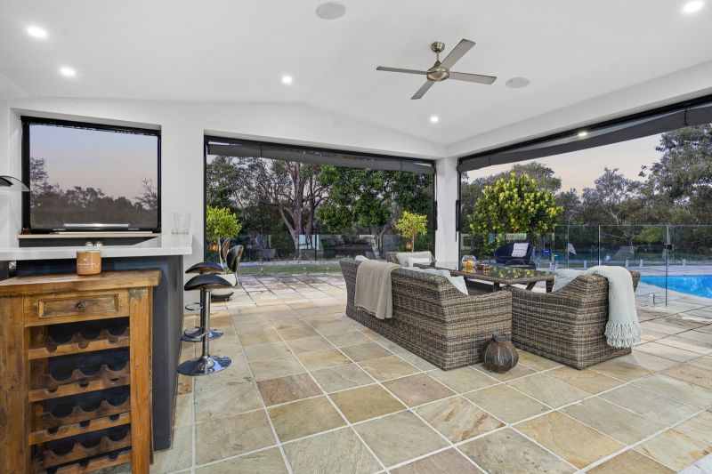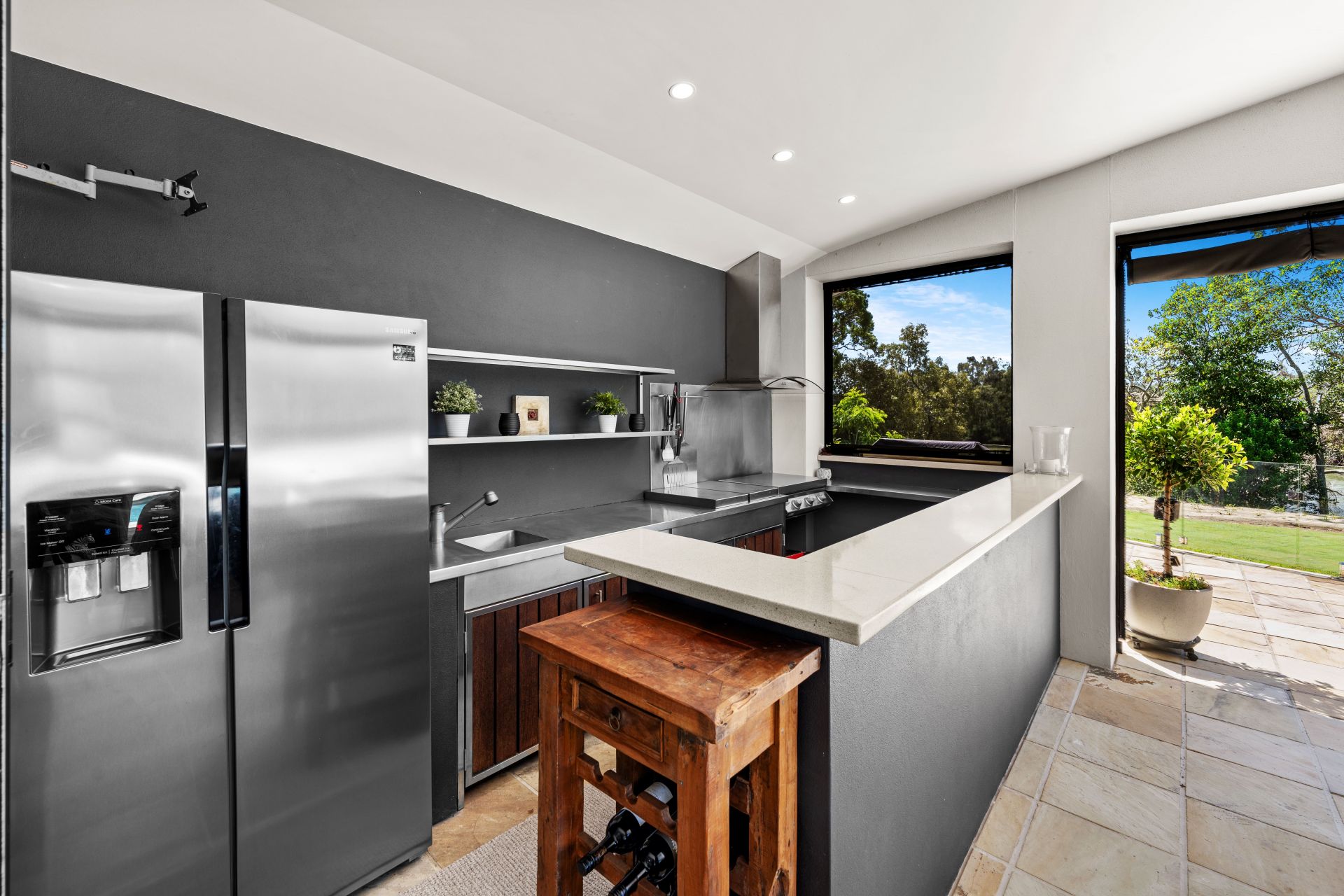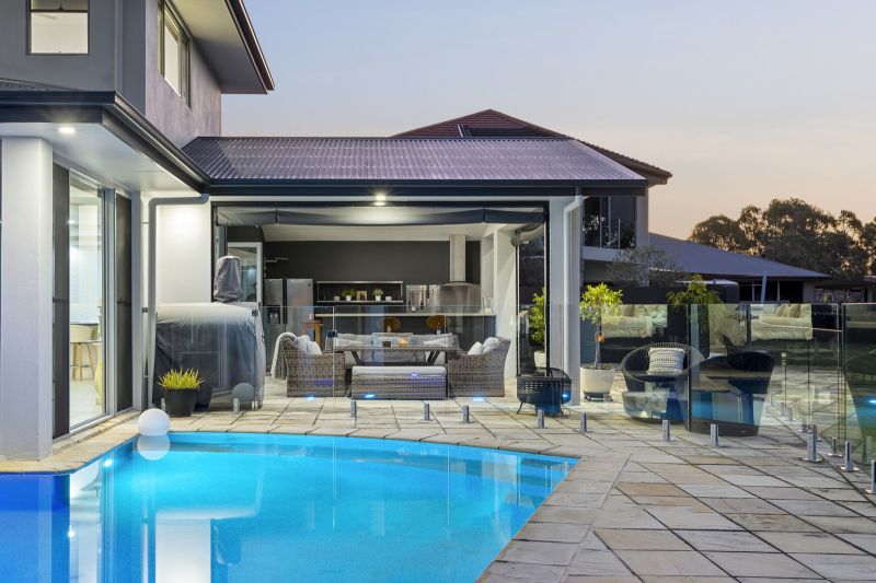 - Protected alfresco pavilion offers all-weather enjoyment, features an outdoor kitchen with stainless steel benches, teppanyaki grill, Beefeater BBQ, sink, storage and rangehood
