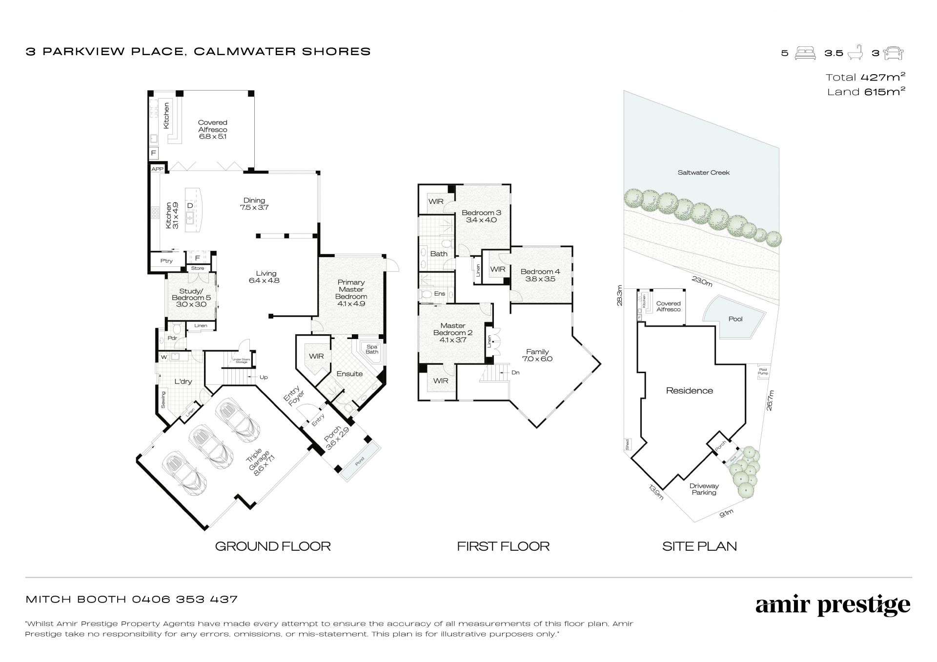 Equally impressive is the 427m2 light-filled floorplan, thoughtfully designed for flexibility. Recently refreshed with new paint and carpet, both levels feature a living area and a master suite, allowing the option to reside entirely on one floor if desired. Each master suite includes a walk-in robe and ensuite, with the ground-floor option further enhanced by a spa, outdoor access, and idyllic views. Two spacious upstairs bedrooms share a stylish main bathroom with full-height tiling, while a versatile office/5th bedroom and a powder room are conveniently located on the lower level.