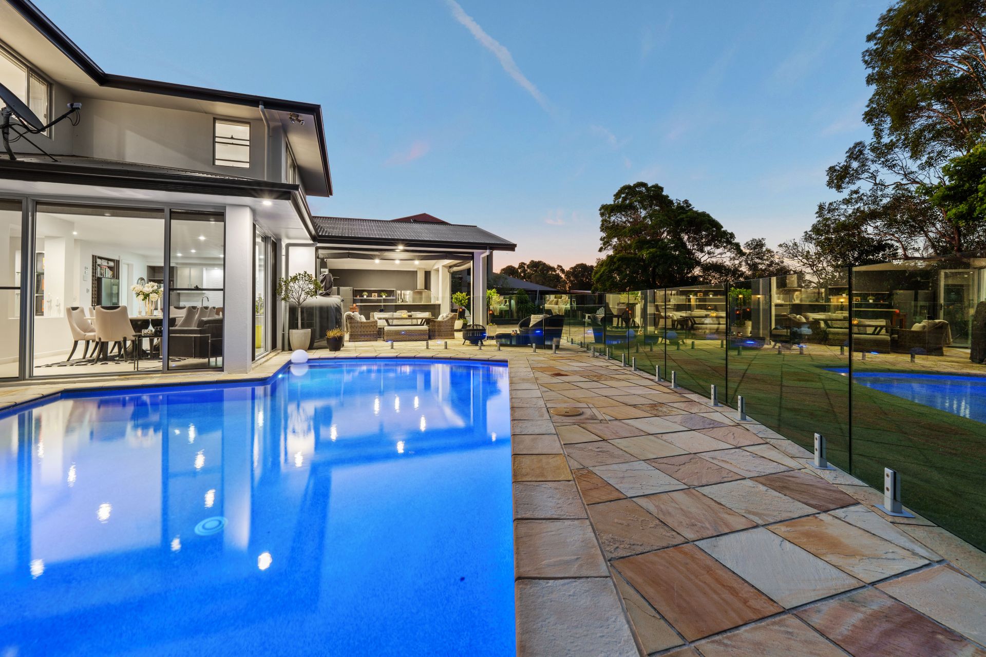 - Galleries of glass embrace the dining area, framing views across the pool to the creek