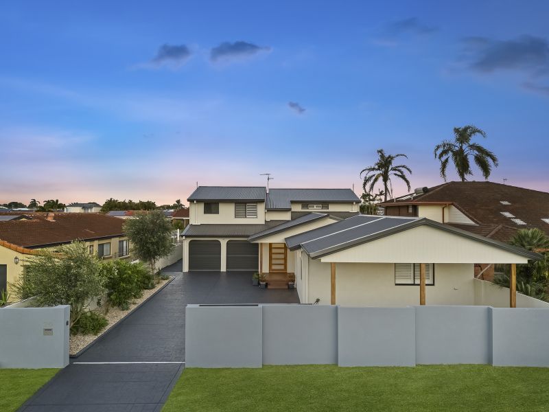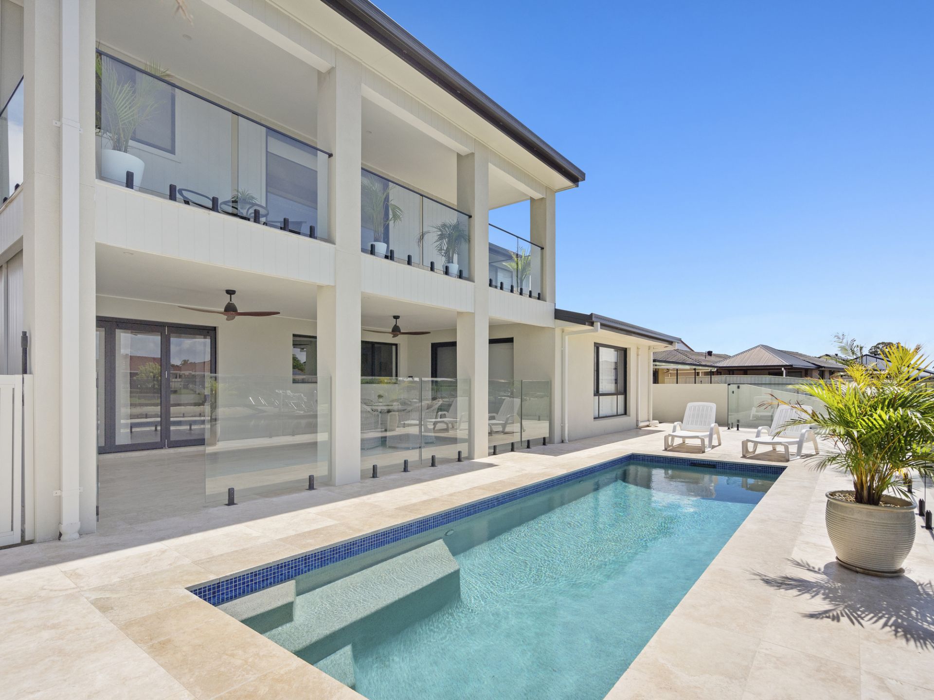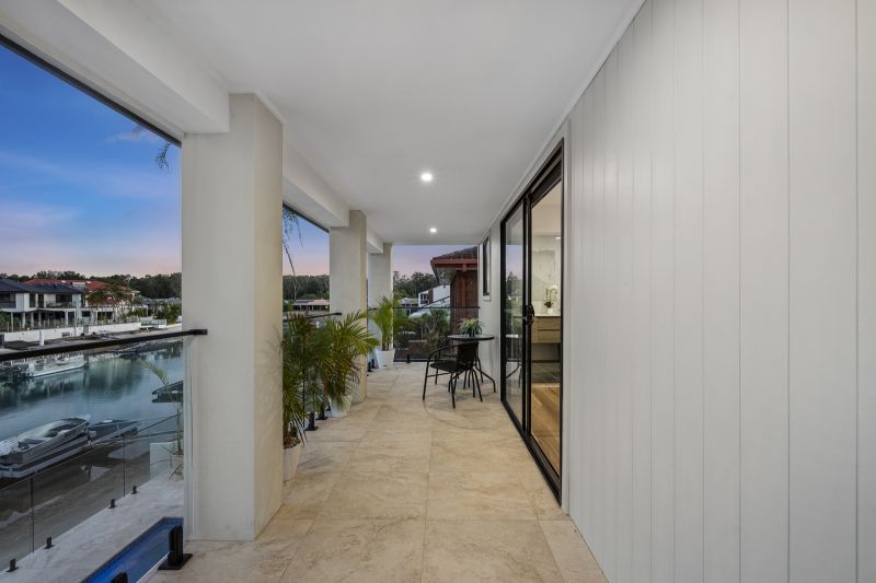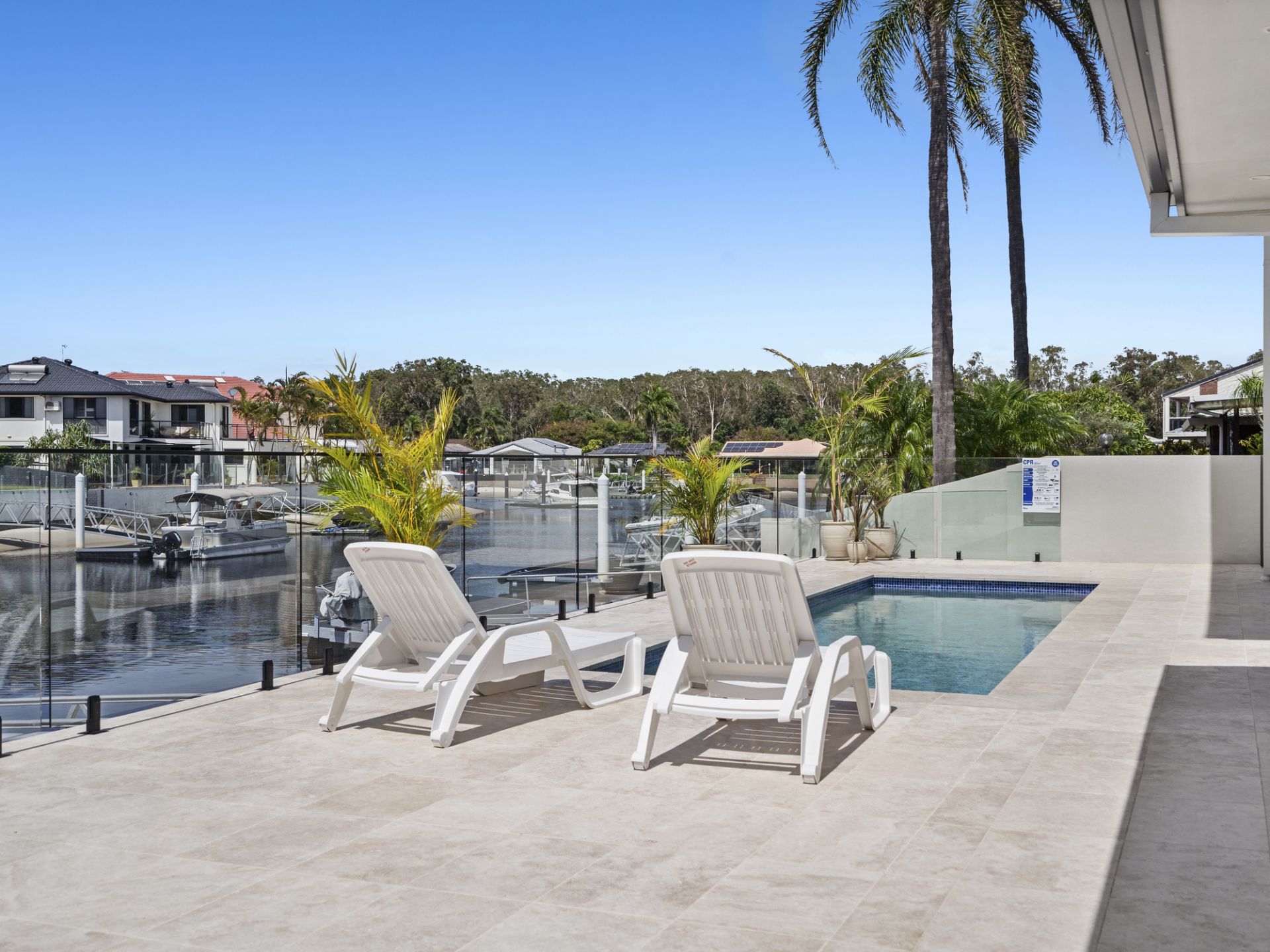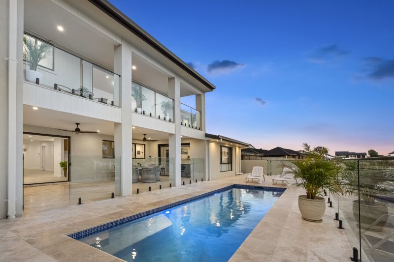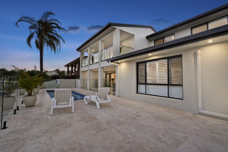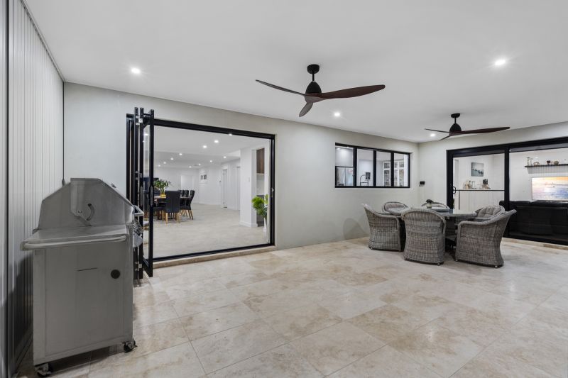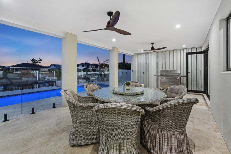 The low-maintenance backyard oasis is designed for year-round enjoyment, featuring an undercover entertaining area with built-in lighting and fans, perfectly positioned to overlook the pool and tranquil canal. Travertine tiling flows seamlessly from indoors to outdoors, enhancing the home's sophisticated coastal charm.