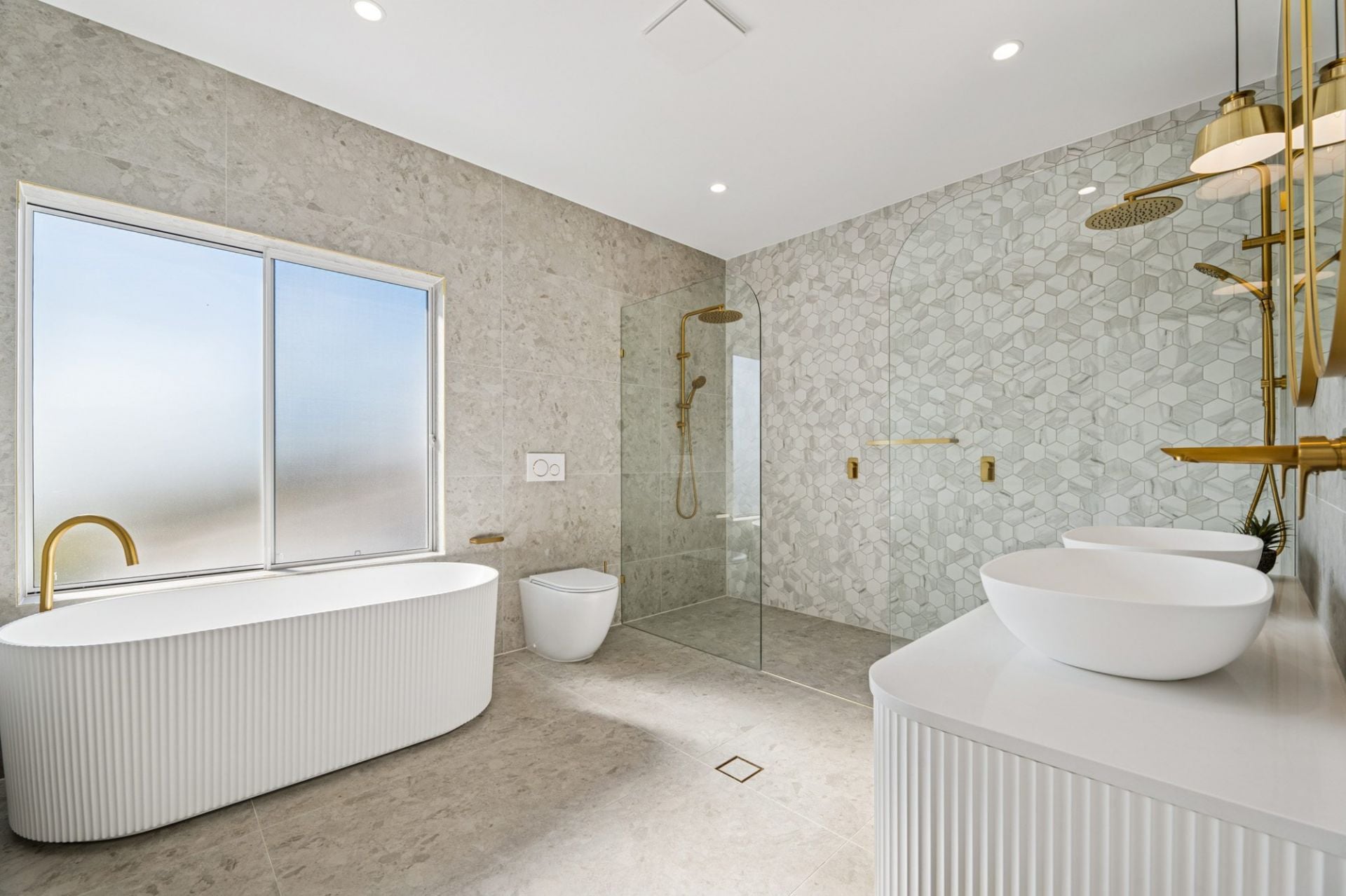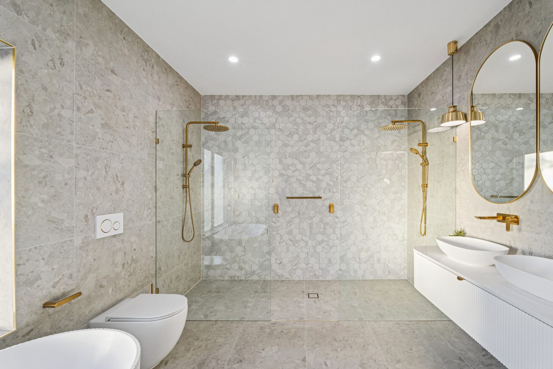 • Five to six bedrooms including a master retreat with balcony, Polytec walnut walk-in robe, and opulent ensuite with freestanding bath and Carrara marble mosaic wall