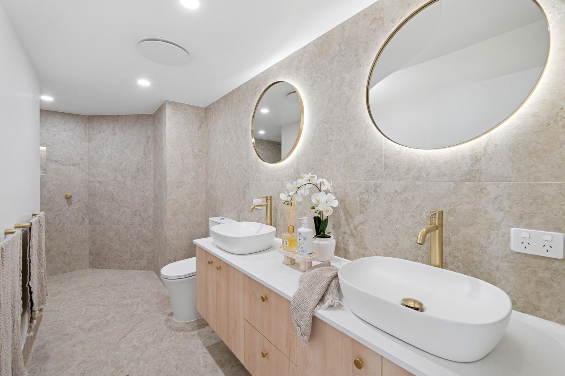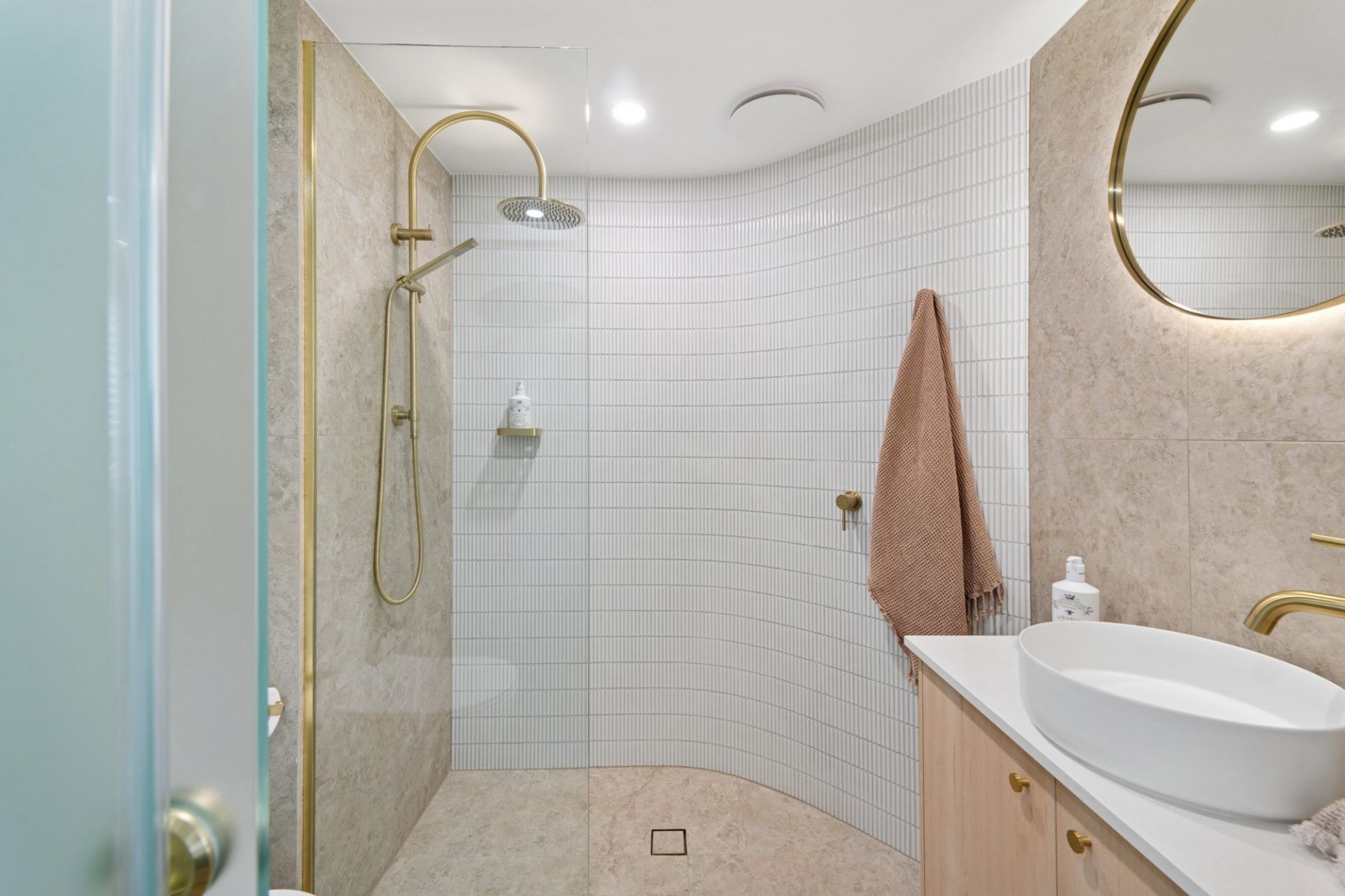 Both bedrooms are generously proportioned and styled with a sense of quiet luxury. The master suite enjoys a study nook, a beautifully finished ensuite, while the second bedroom is equally refined and serviced by a designer main bathroom. Each bathroom showcases curved architectural walls, custom vanities, brushed brass fixtures and a spa-like aesthetic, elevating everyday living. The laundry is finished to the same high standard as the rest of the apartment, featuring generous storage, expansive bench space, and a brand-new hot water system.