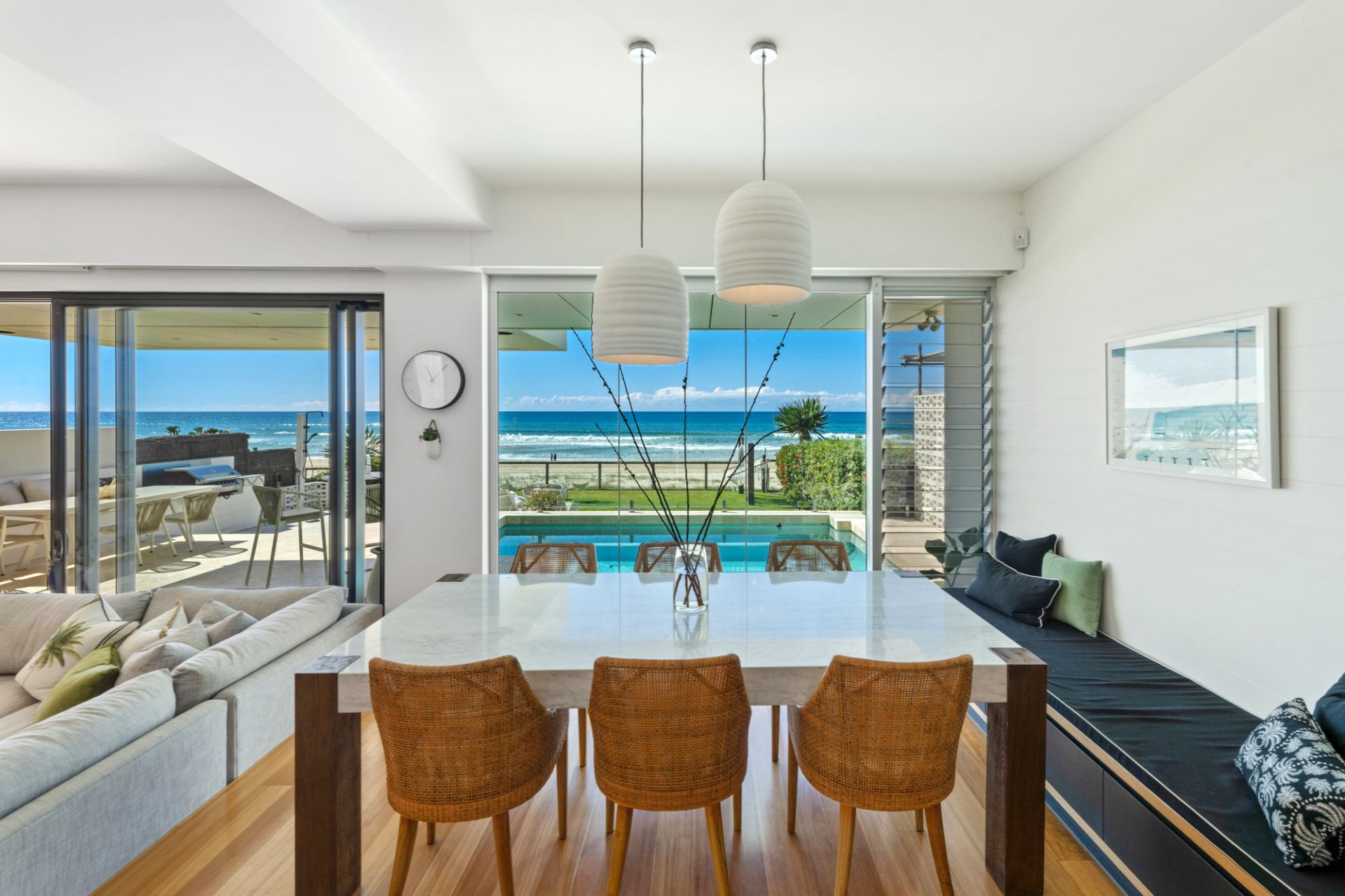 Dining area defined by full-height glass, framing uninterrupted beach views