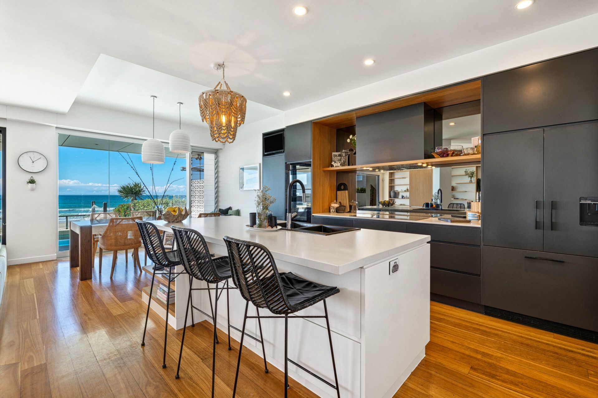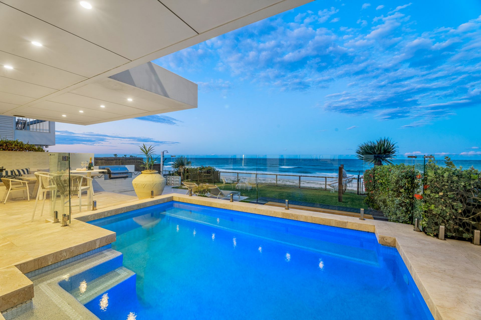Outside, indulge in the blissful serenity of a beachfront oasis, featuring a mosaic-tiled magnesium heated pool that invites relaxation and rejuvenation. Take a moment to unwind on the custom-built day-bed swing seats, listening to the soothing sounds of the ocean or the mesmerizing Basalt stone two-storey water feature. A travertine-clad terrace, complete with a brand new built-in BBQ, provides the ideal setting for entertaining. For a unique experience, fire up the pizza oven on the protected deck without compromising the enchanting ocean vista.