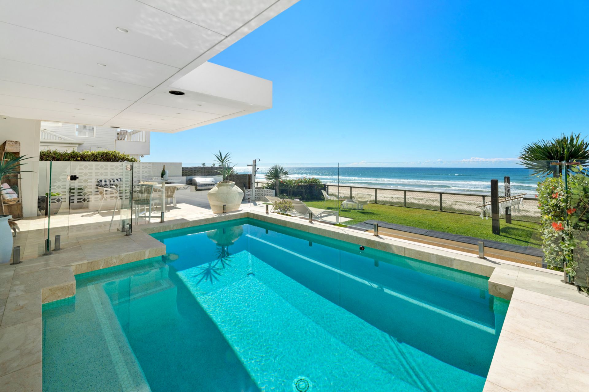 Experience the perfect blend of relaxed luxury and understated elegance in this remarkable freestanding beachfront abode. Nestled on an expansive rare 582m2 allotment with a prized 12.8m direct beach frontage, there's no other place in the world you'd rather be. Surrounded by tranquillity and offering uninterrupted ocean views, this residence transcends the boundaries of a mere house, creating a true sanctuary with its polished concrete floors, warm timber accents, and natural stone textures. The inviting ambiance is enhanced by an eco fireplace enveloped in Calcutta grey marble in the lounge area, while the gourmet kitchen, beach-view dining zone, and cinema room showcase meticulous craftsmanship and the finest fittings and fixtures.